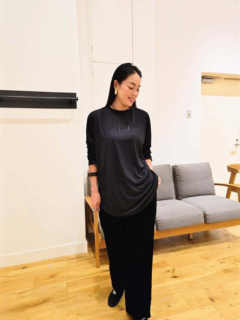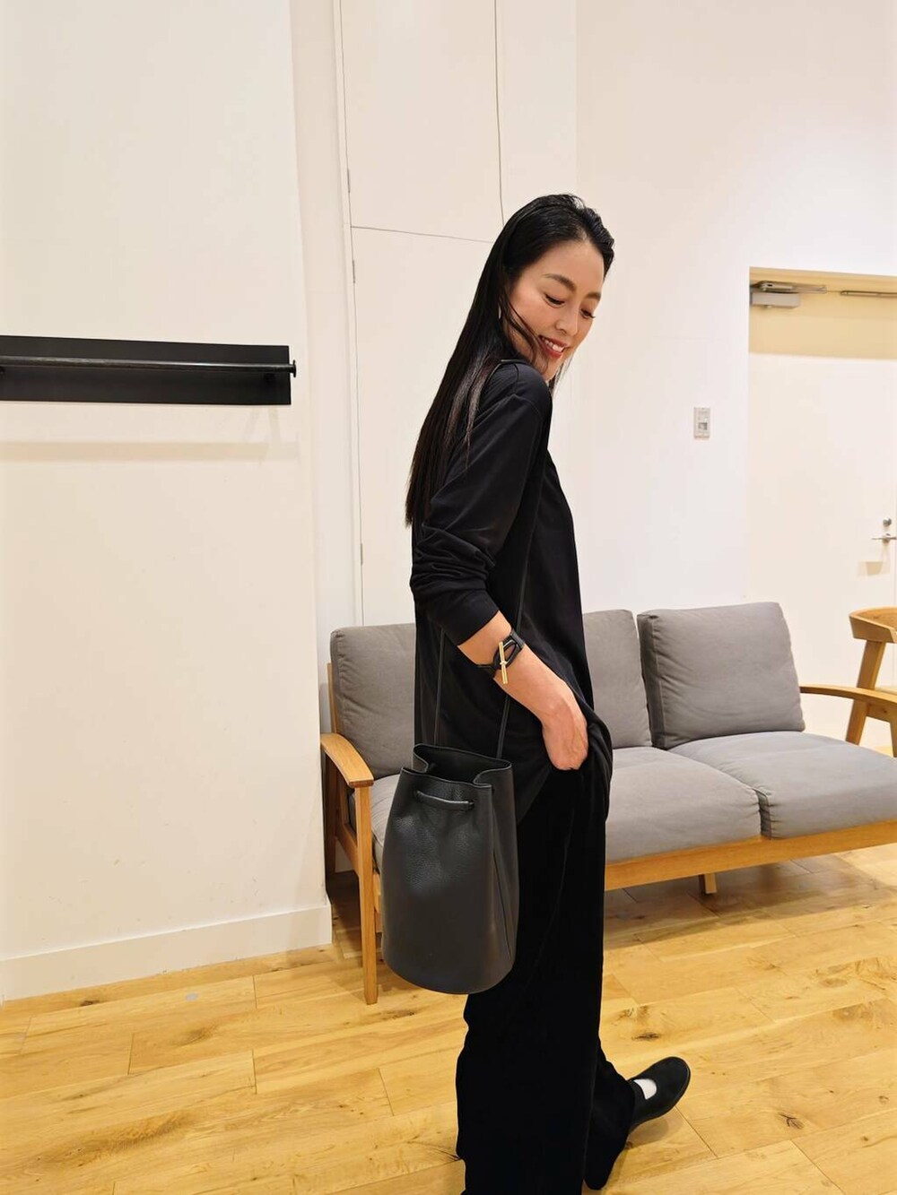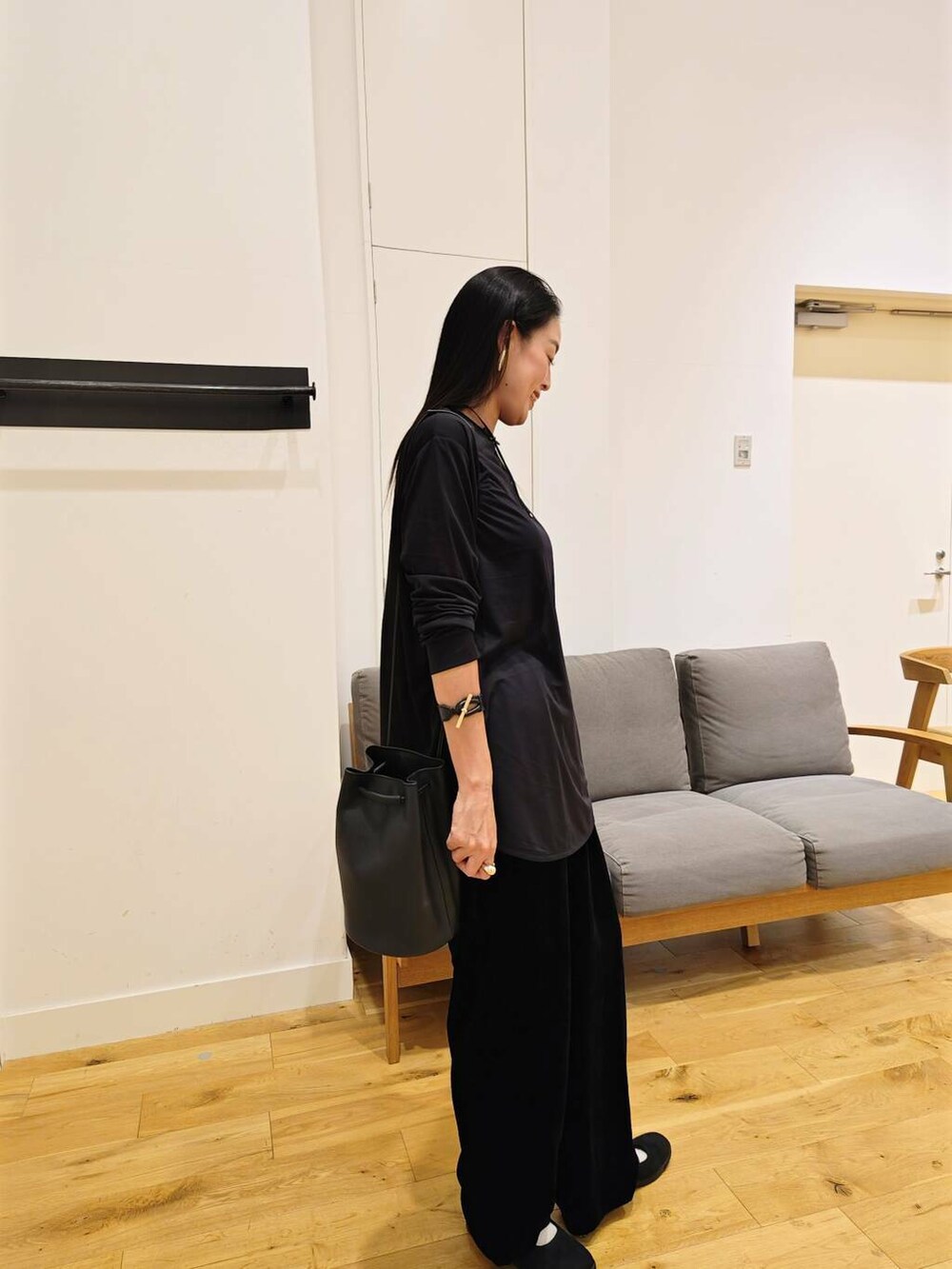 マットな質感で高級感があるパンツはストレートシルエットが綺麗でお気に入り。
