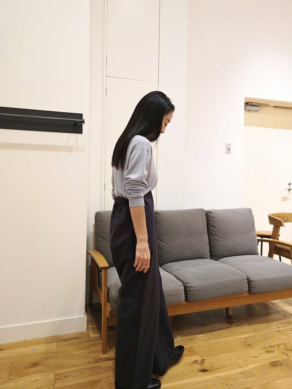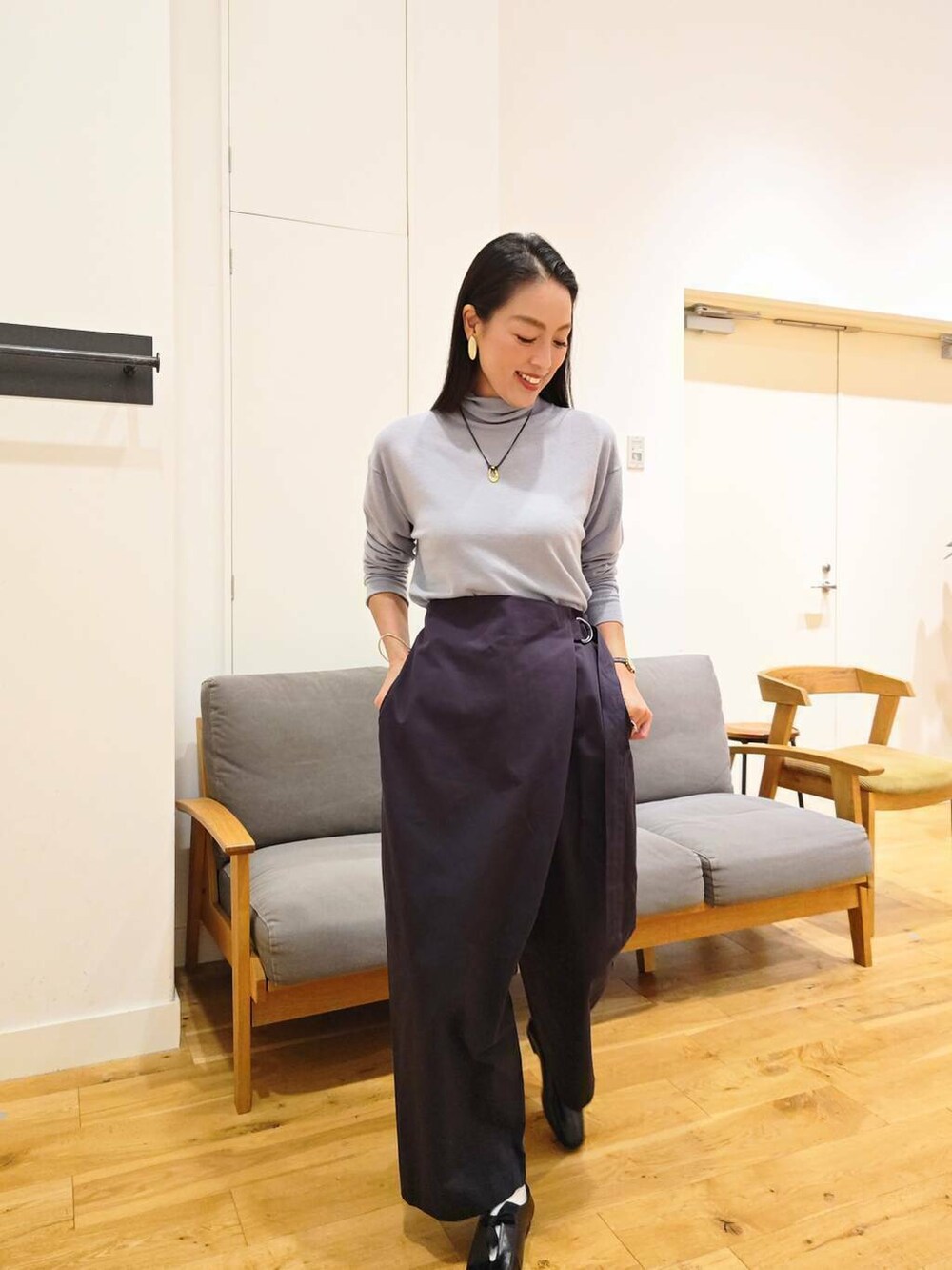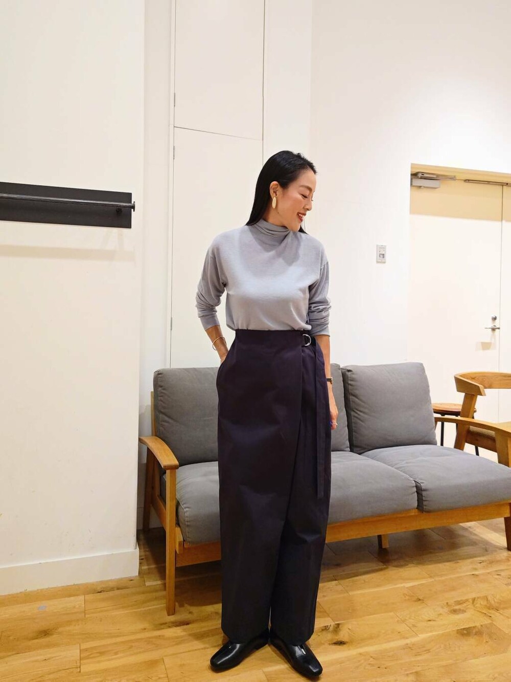 シンプルなトップスに合わせてパンツが主役になるコーディネートがオススメ。