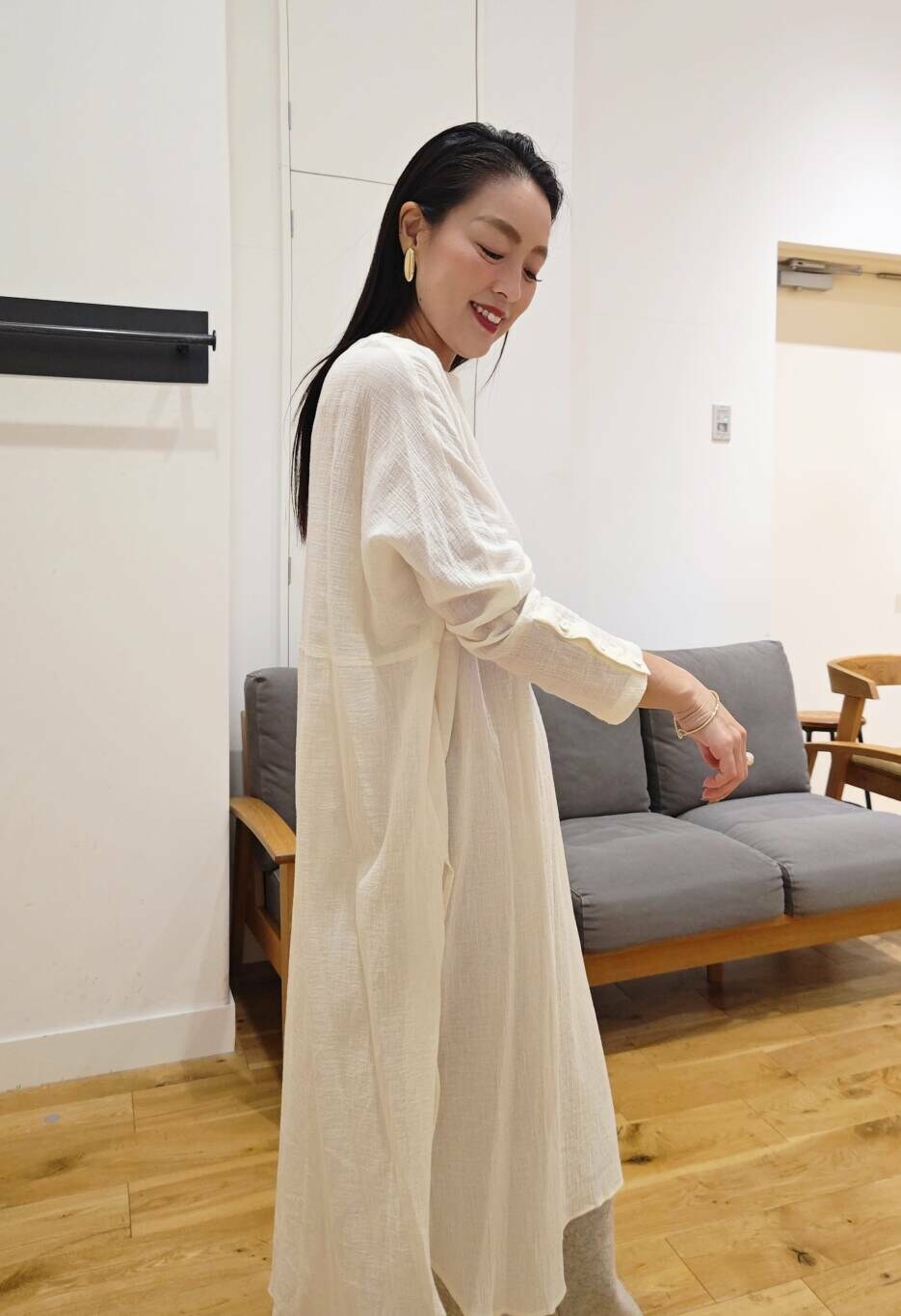 深いスリットと、カフスボタンの袖が可愛い。