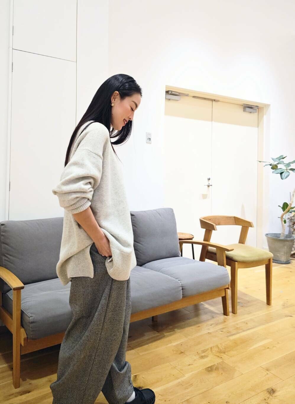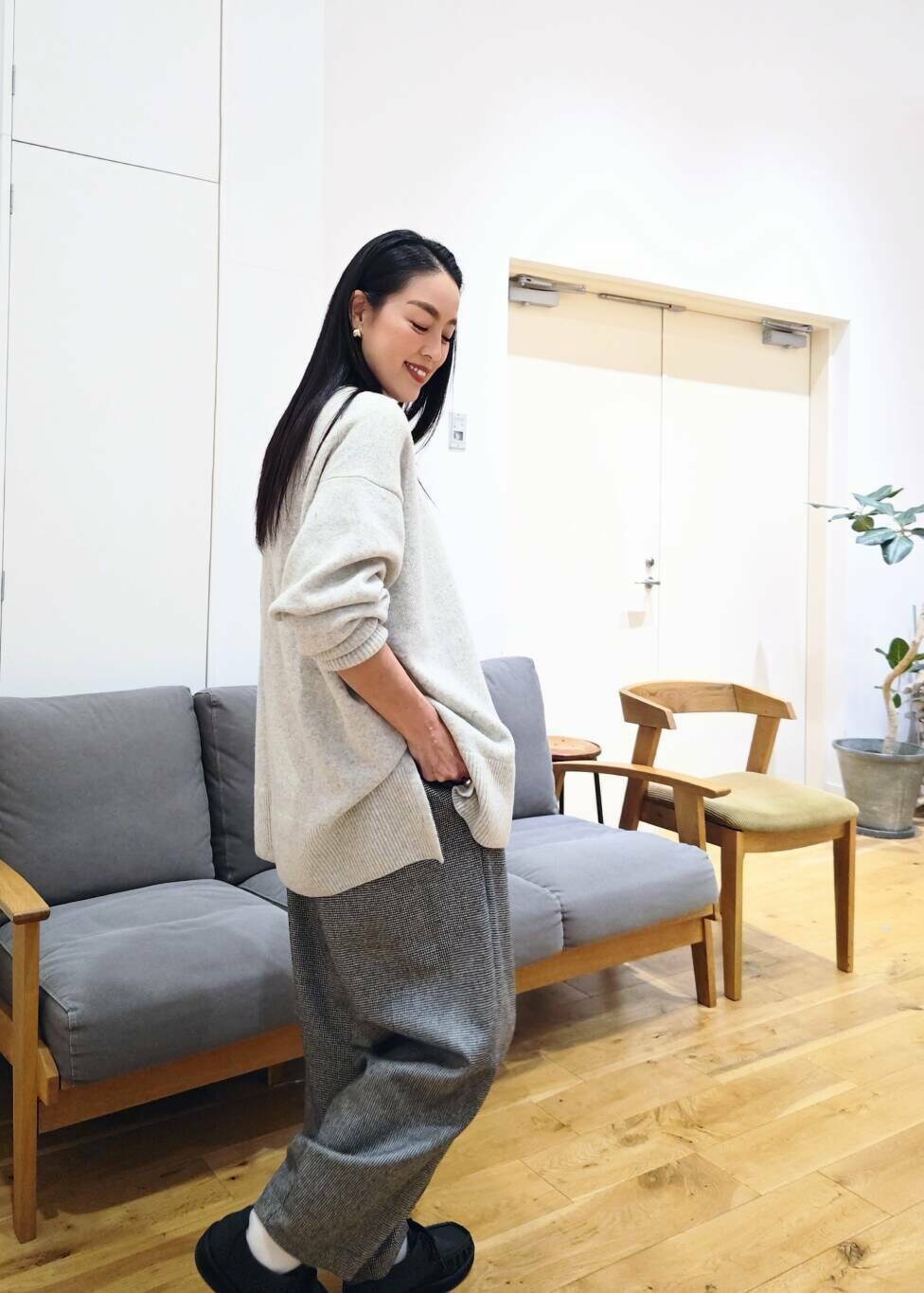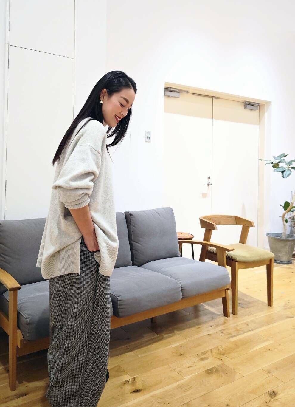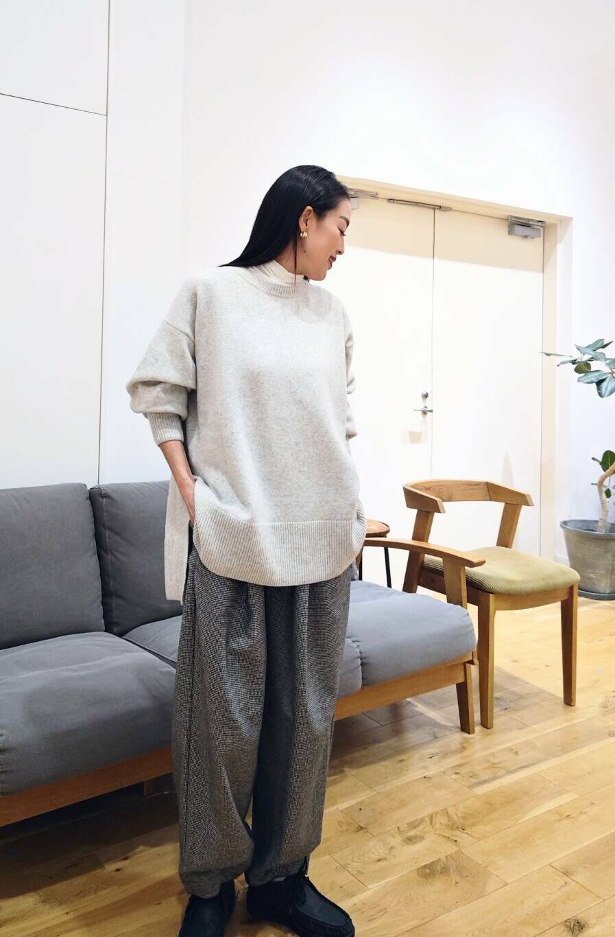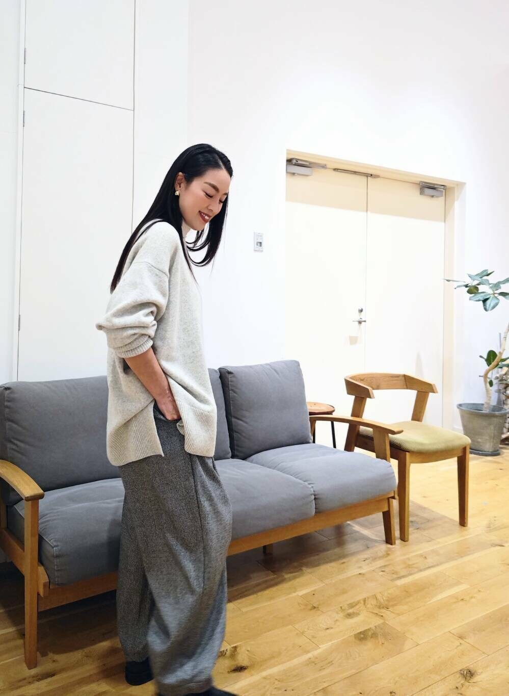 主張しすぎない細やかな千鳥柄が可愛く、テーパードシルエット、程よいルーズ感もお気に入り。