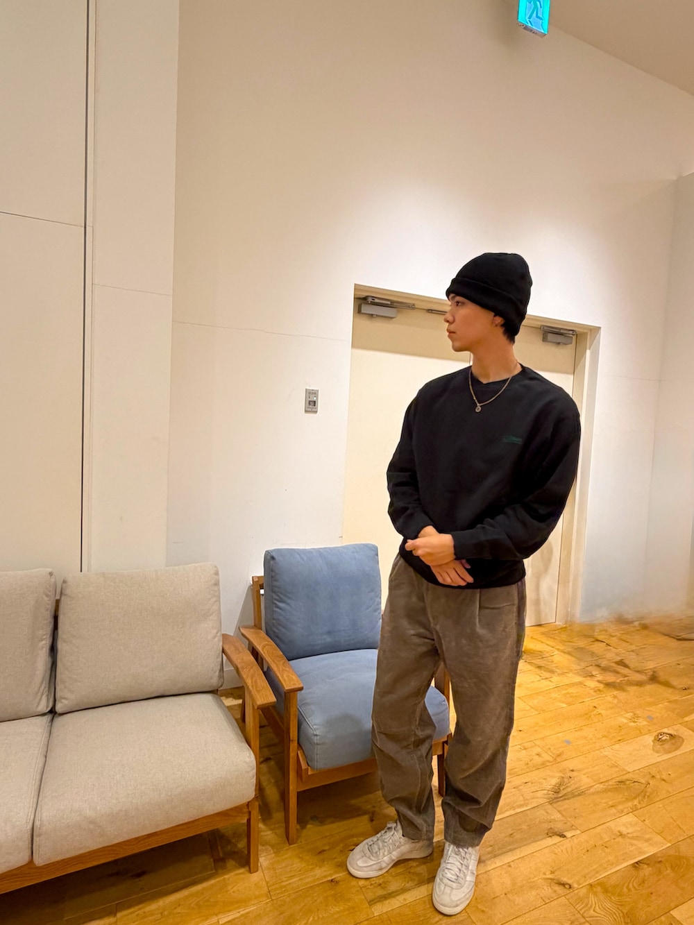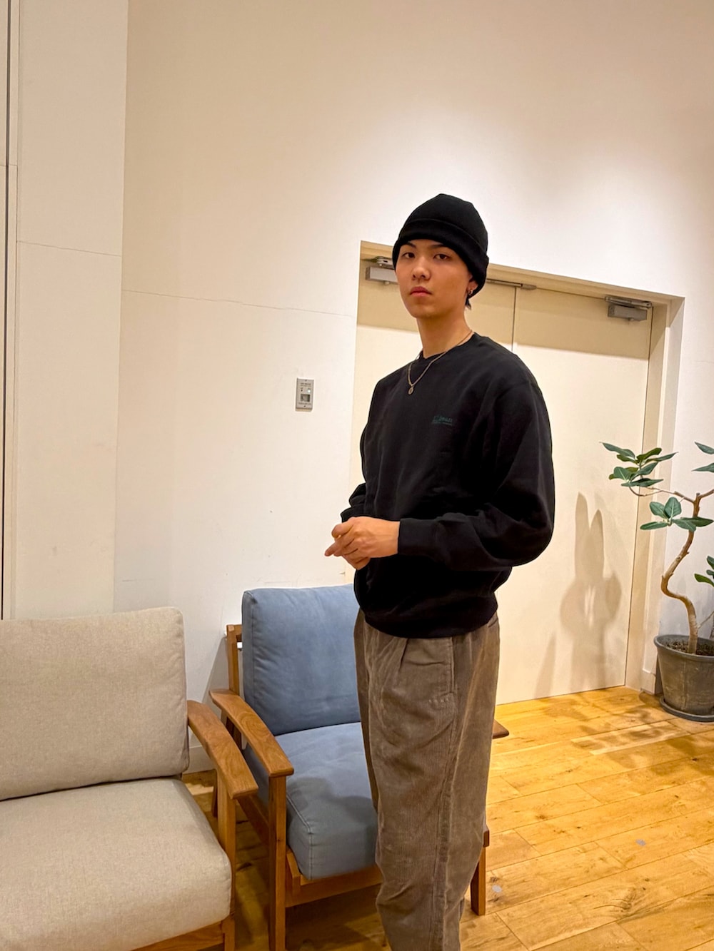 スウェットと太めのコーデュロイパンツで