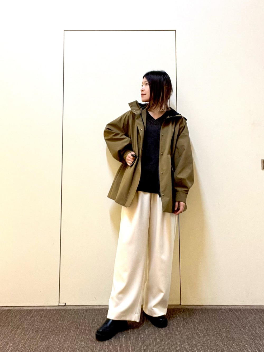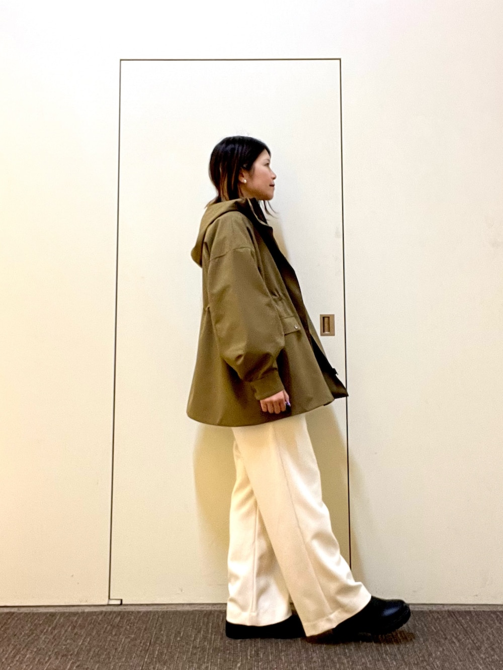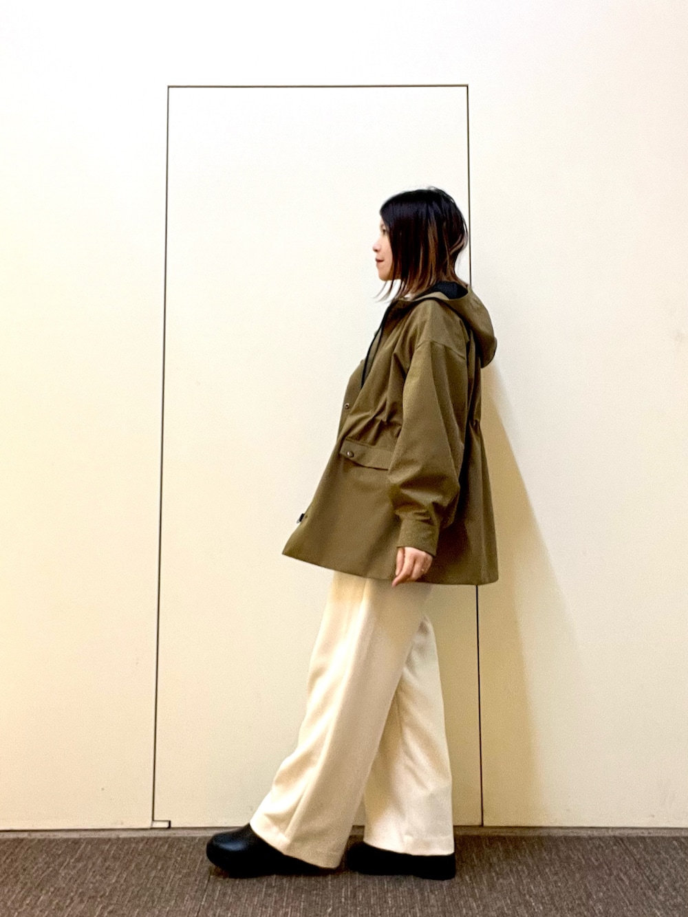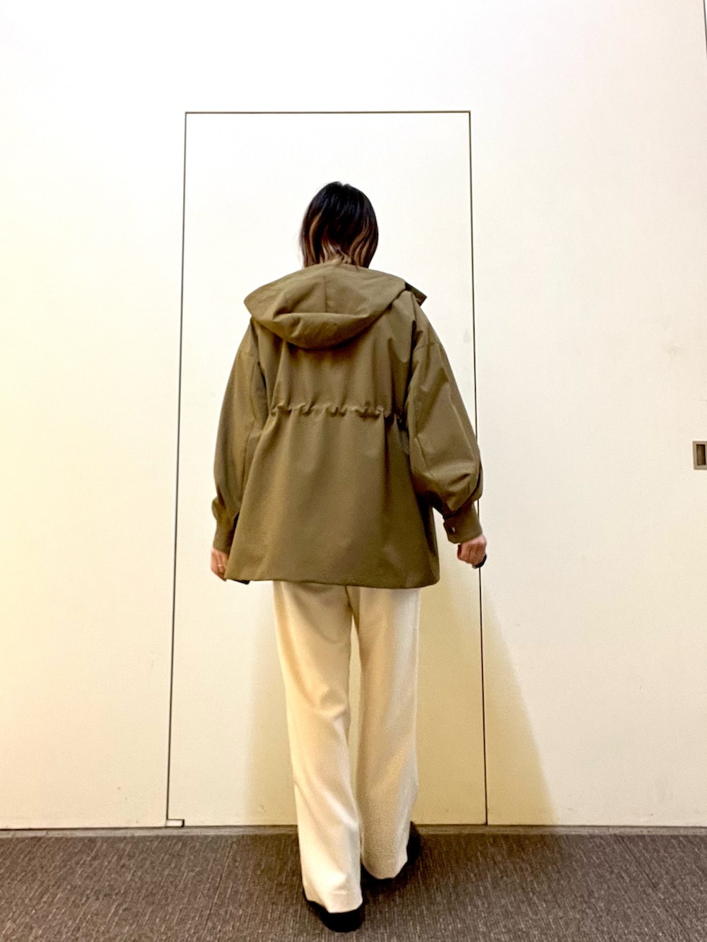 アウターは防風、撥水機能付きで軽い着心地な優秀アイテム◎袖に少しボリュームのあるデザインが女性らいです👌🏻ウエストのドロストで絞るとシルエットを変えて着ていただけます!