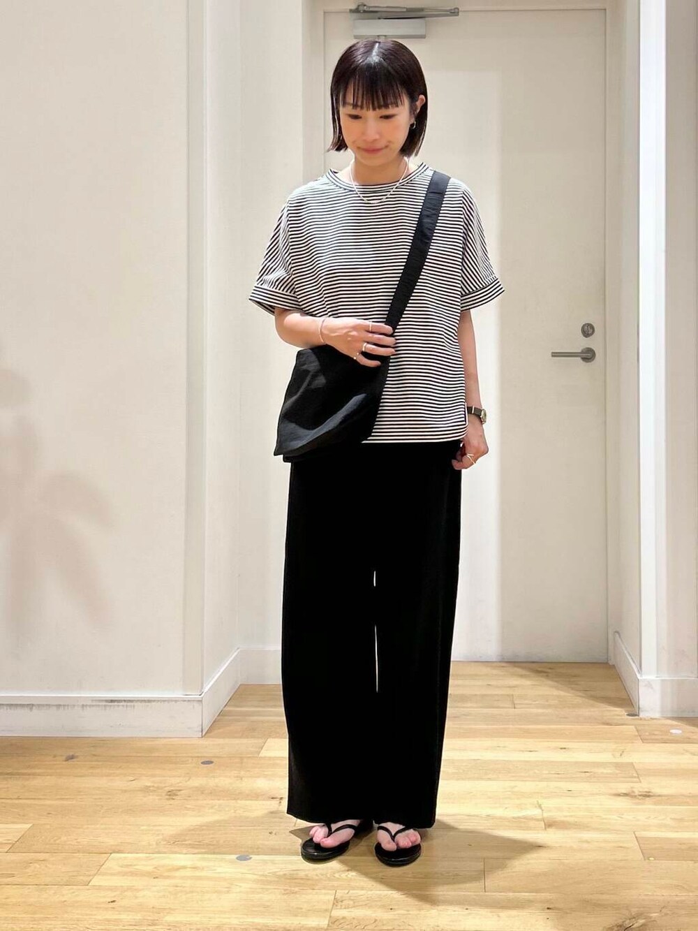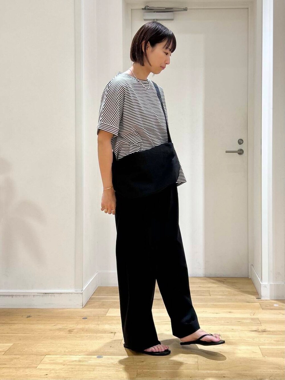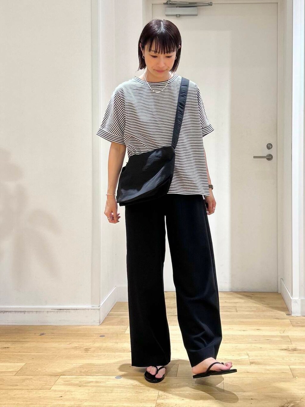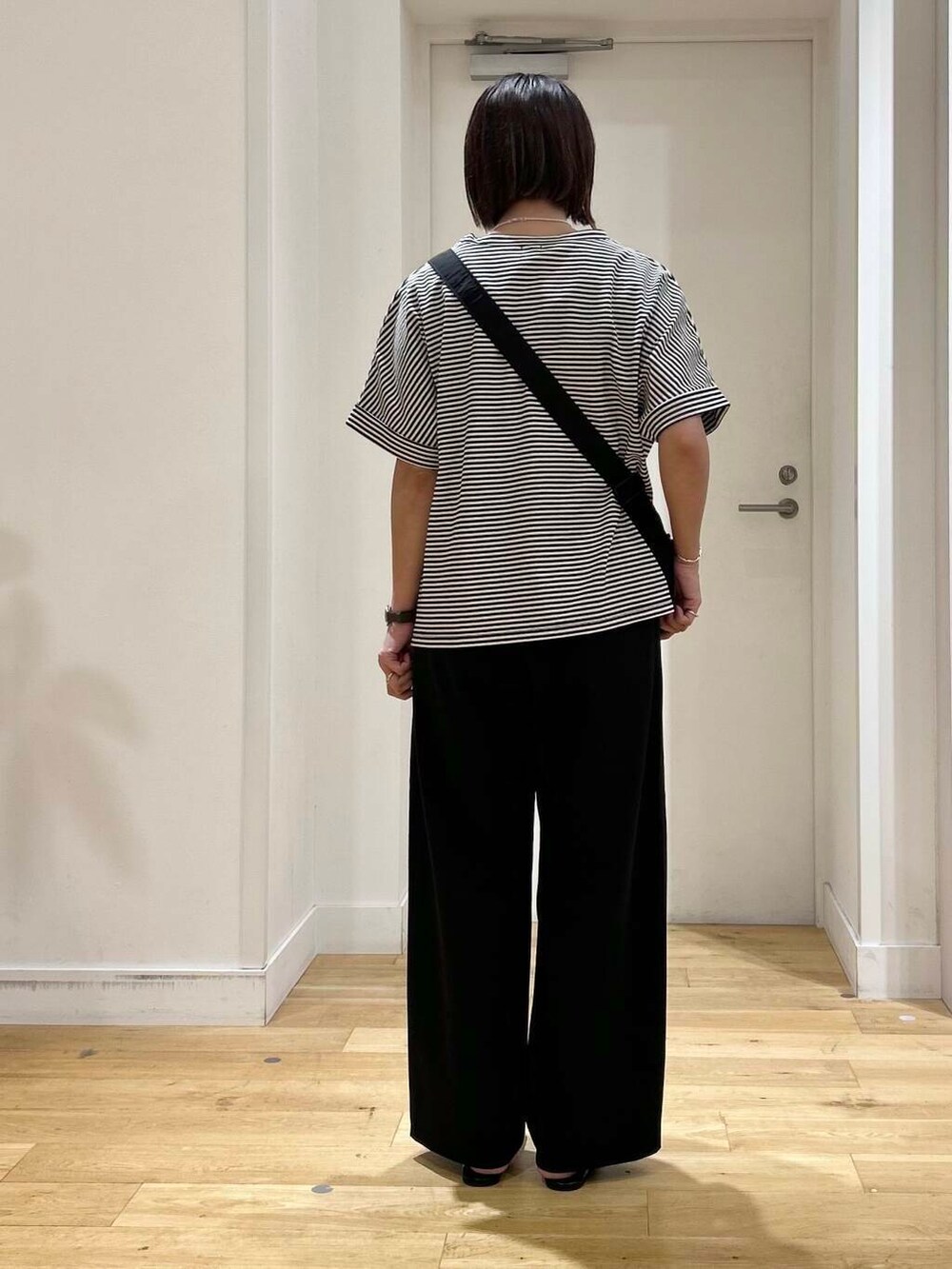 トップスはカジュアルなボーダーTシャツなのでラフになりすぎないように、ボトムスにはトラウザーを合わせてバランスを取りました!