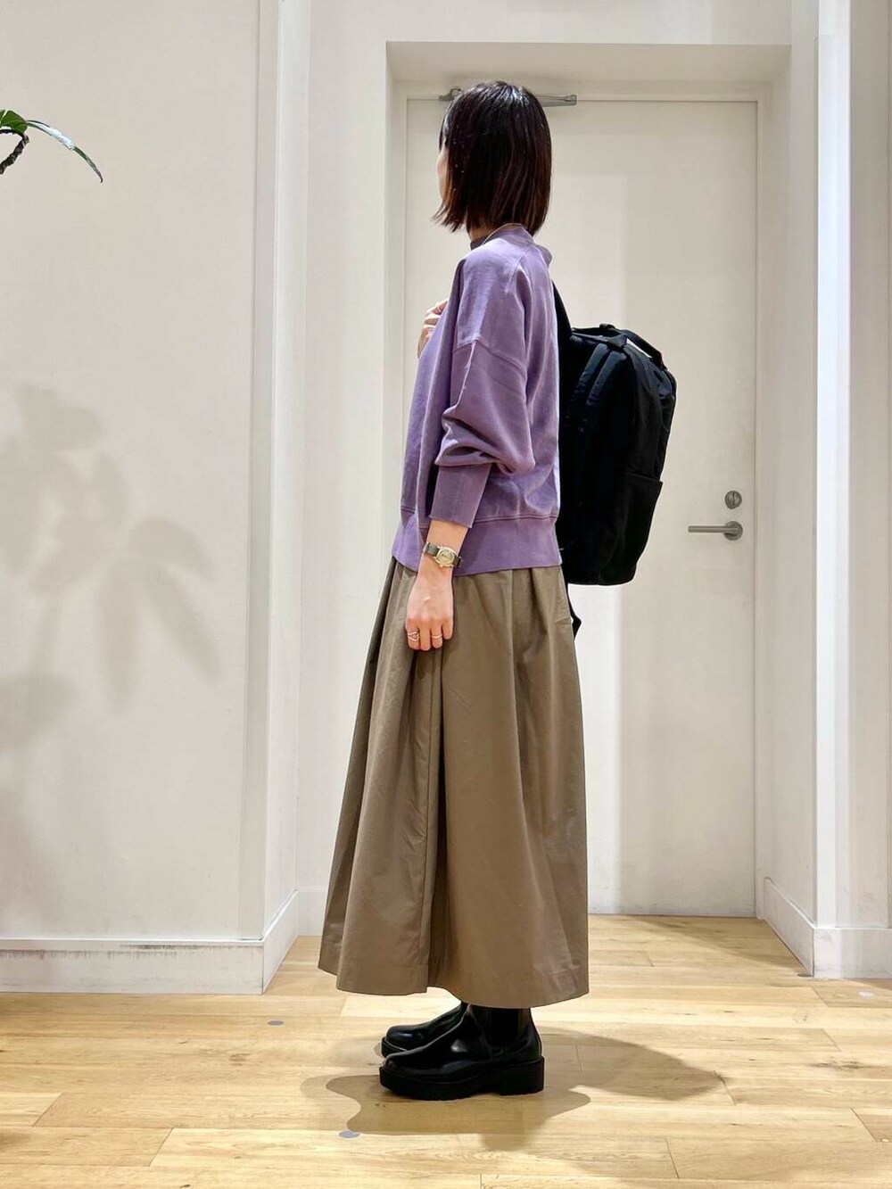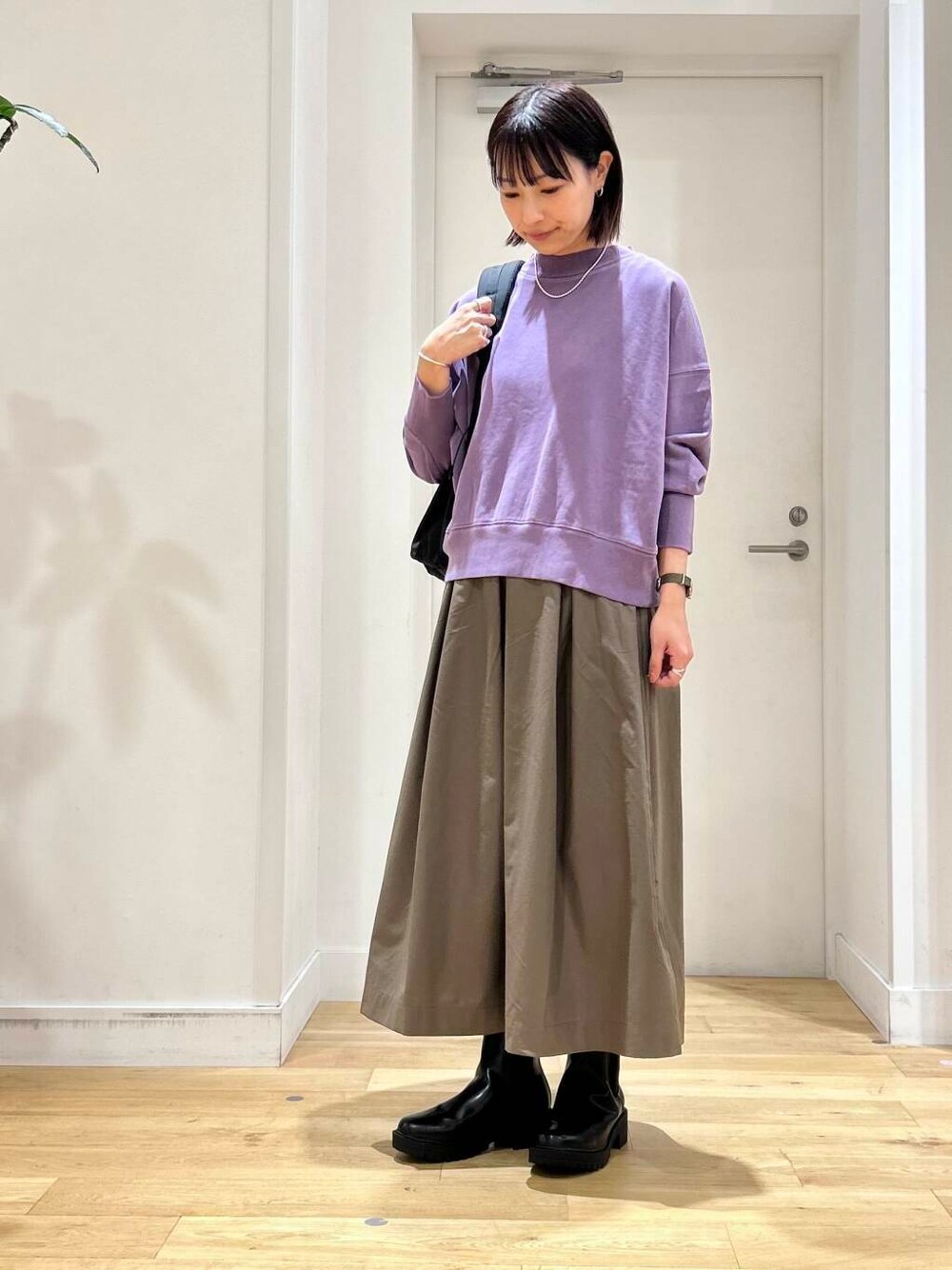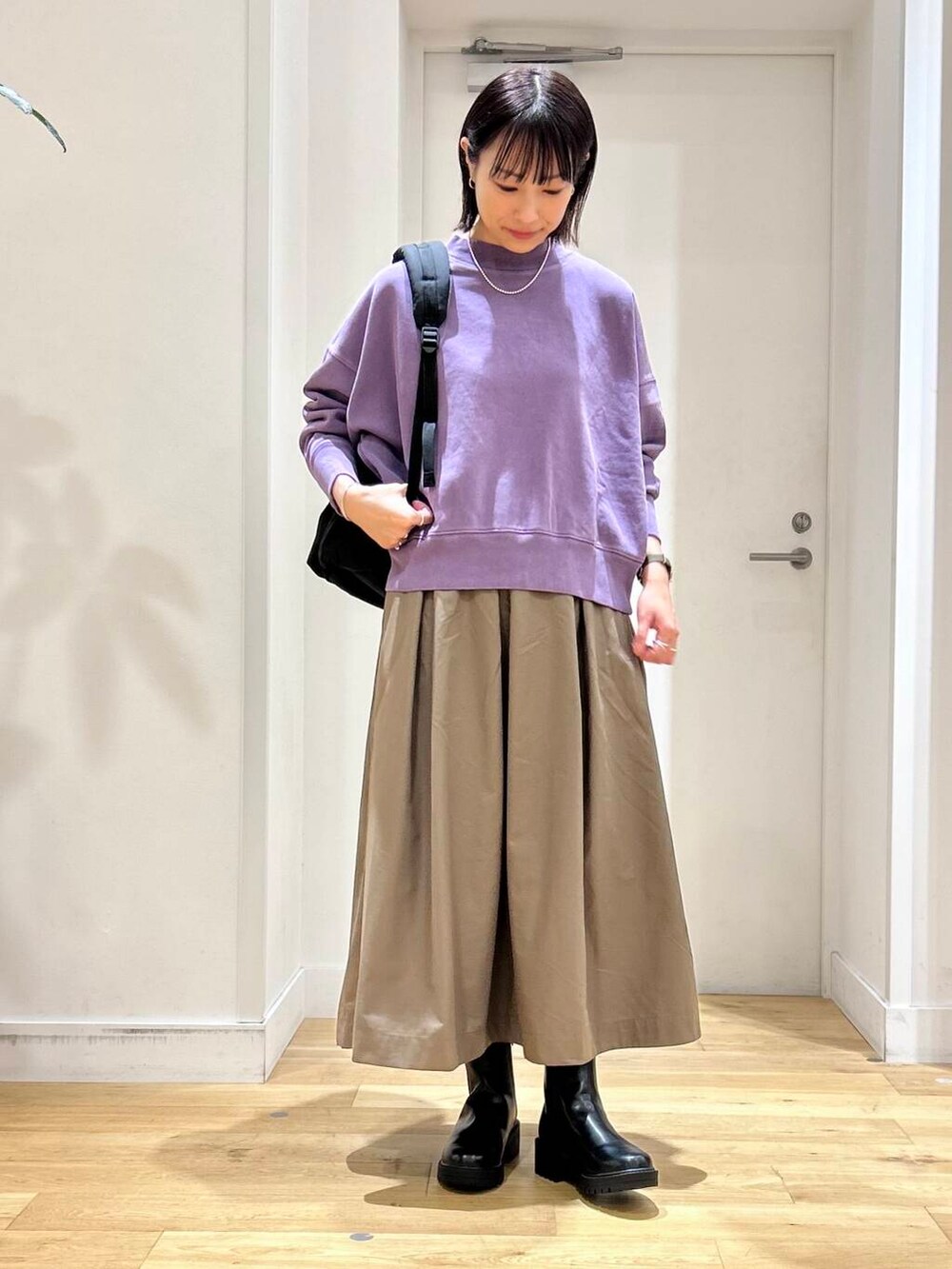 スウェットは、一見シンプルなデザインですが、ドロップショルダーや短めの丈感などさりげなくポイントが詰まったアイテム!