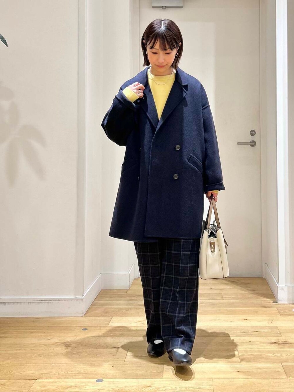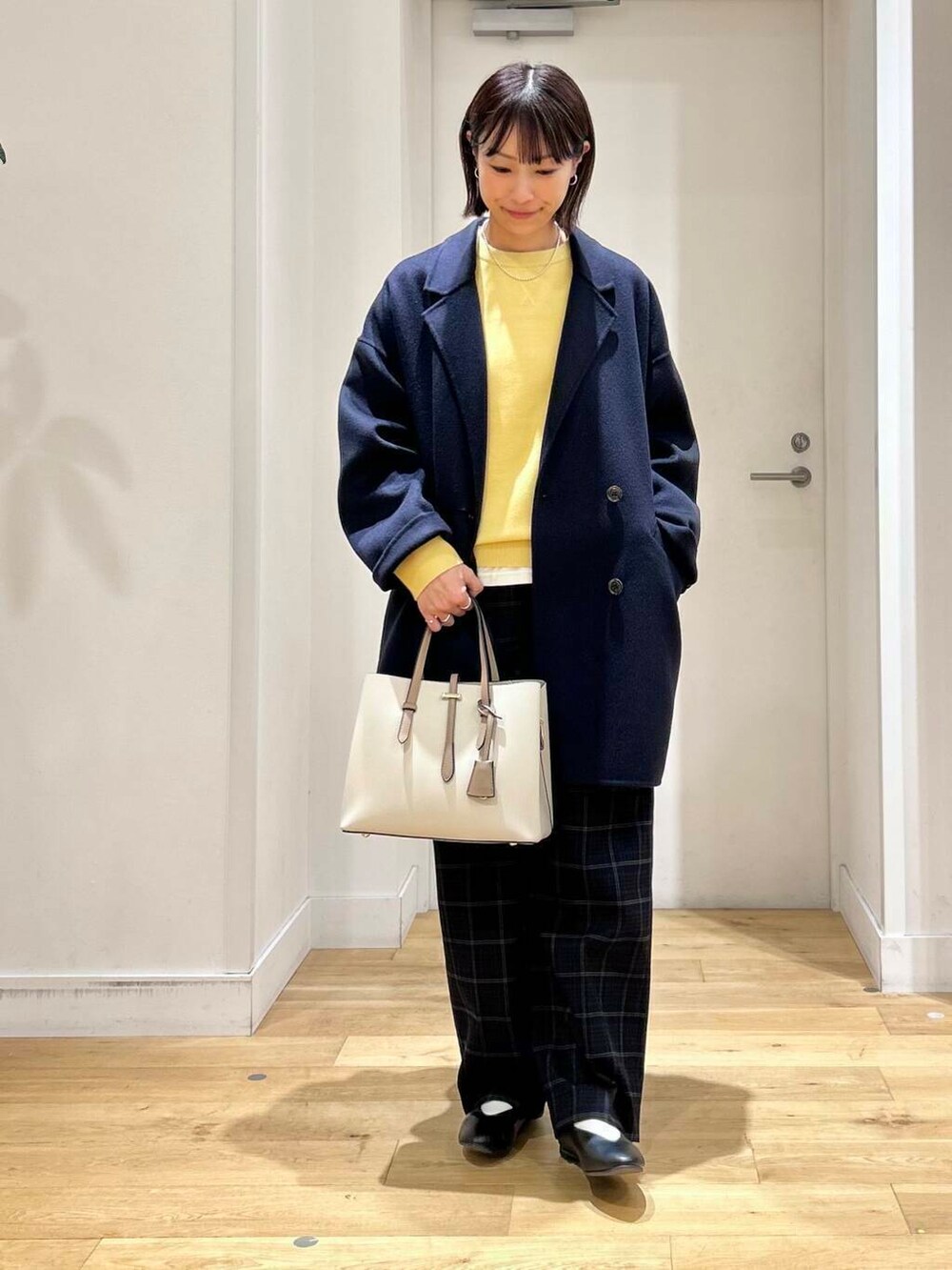 インナーには、綺麗なイエローのニットを合わせてコーディネートのポイントに♪