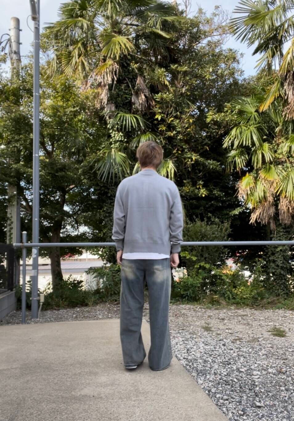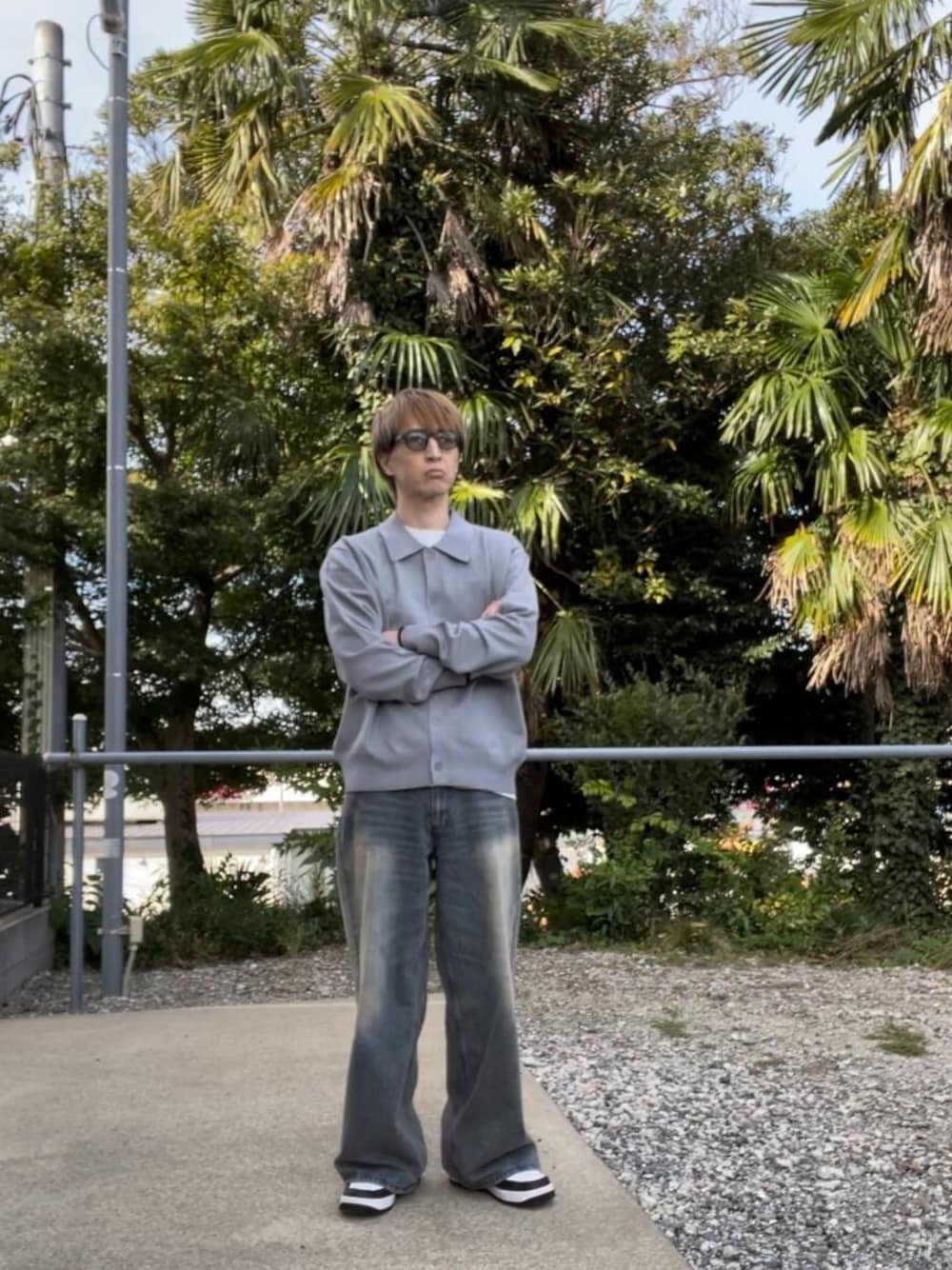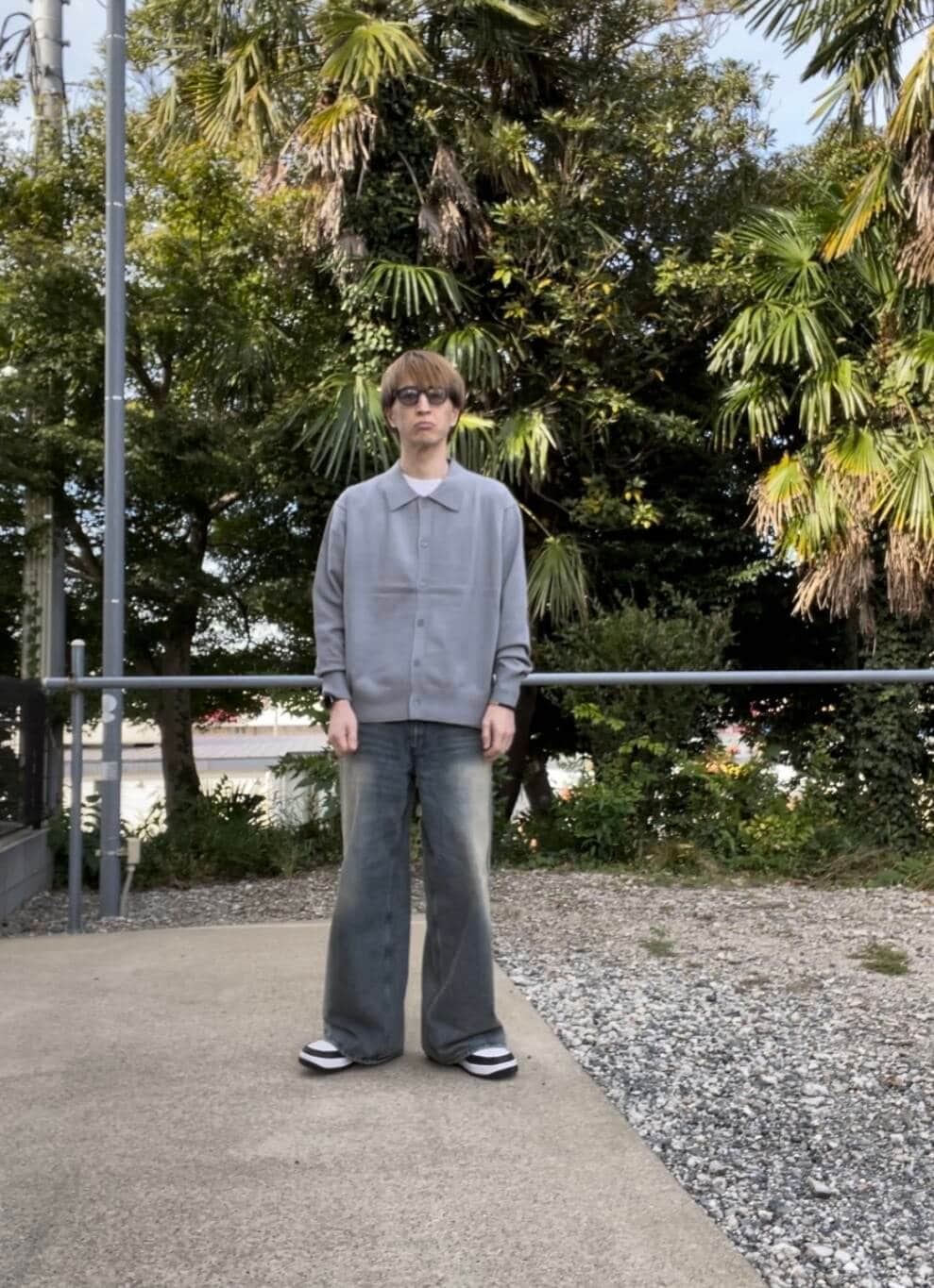 ニットシャツのカーディガンを使ったスタイリング。ユニセックスで着れるアイテムになります。