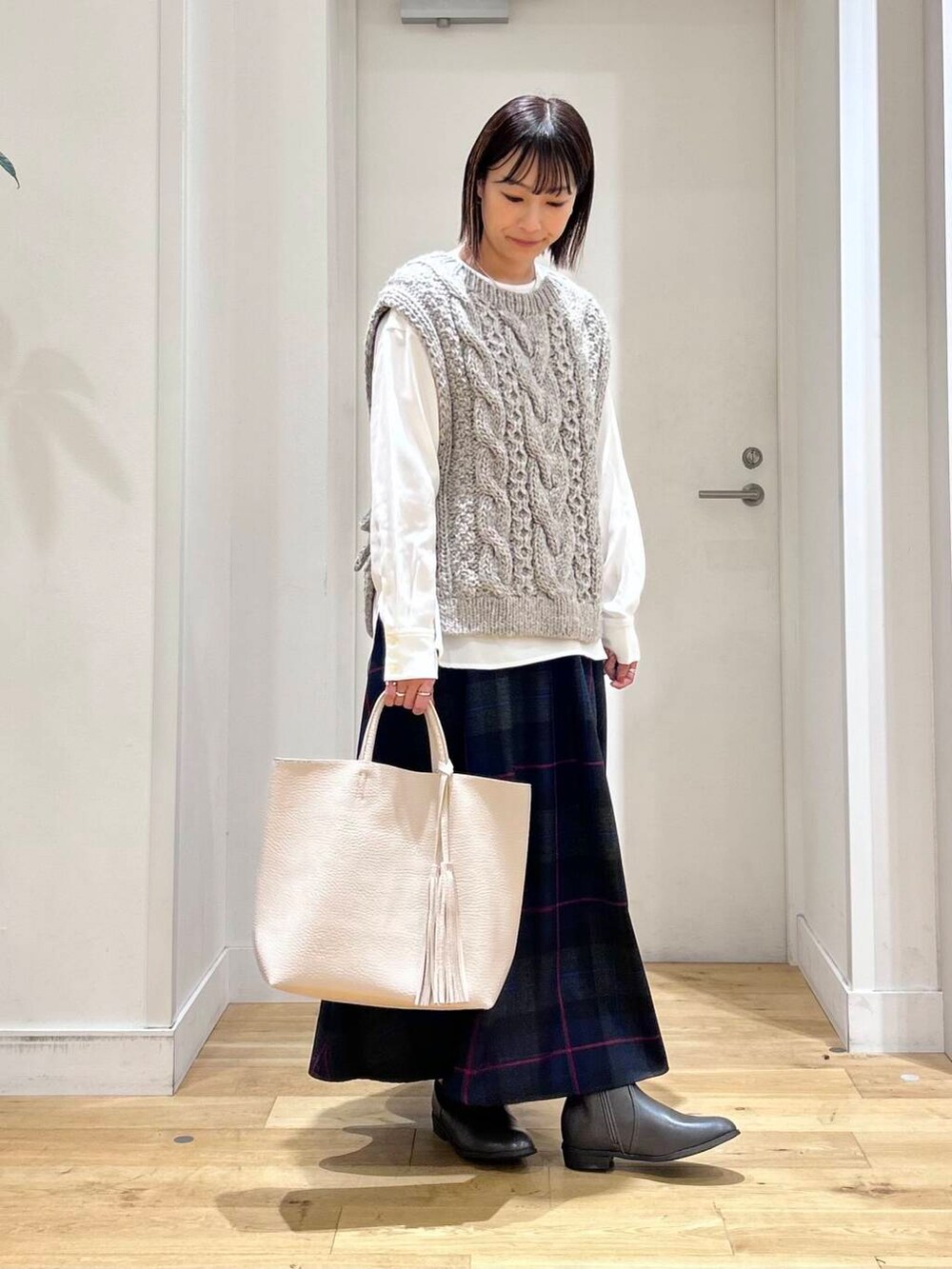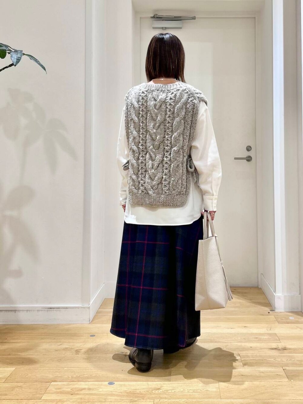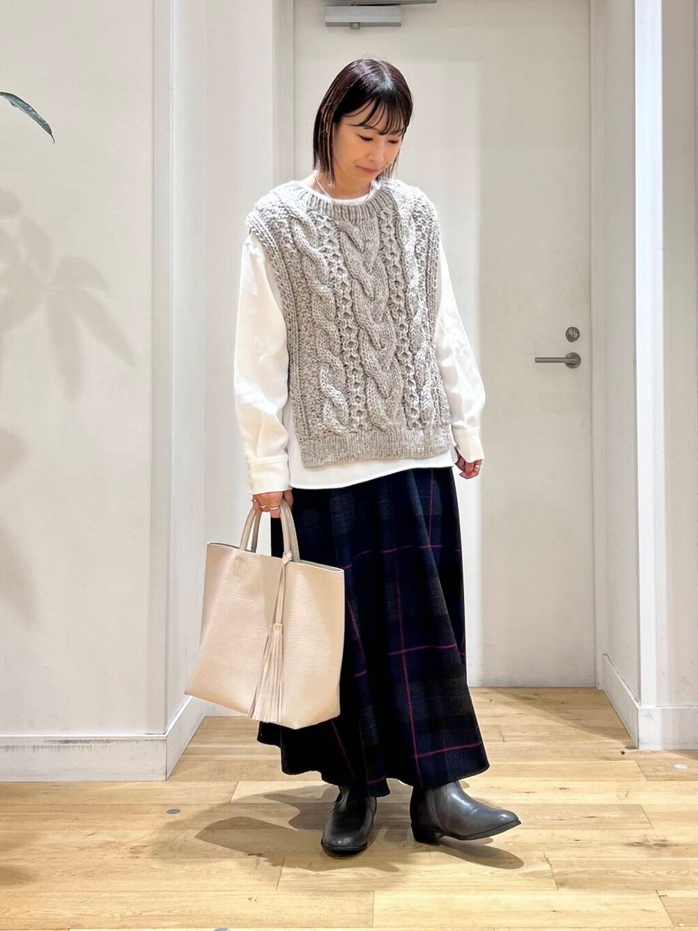 ざっくり編みが可愛い立体感のあるニットベストは、軽くて暖かいので秋口から活躍間違いなしですよ◎