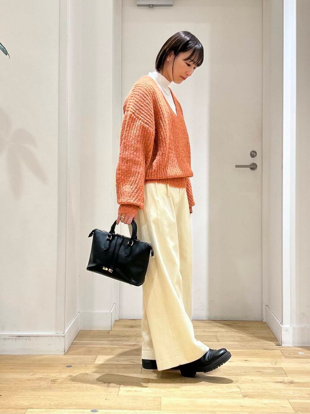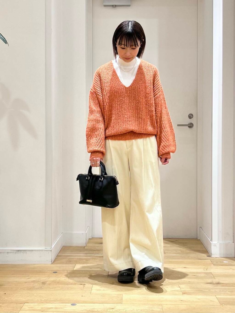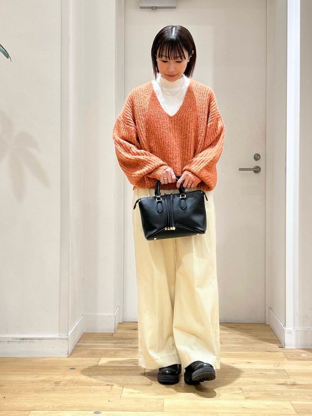 キレイなオレンジが目を引くニットは、深めのVネックデザインやボリュームスリーブが可愛いアイテム!
