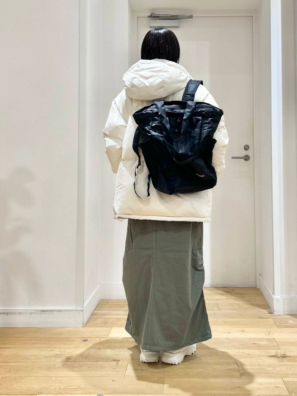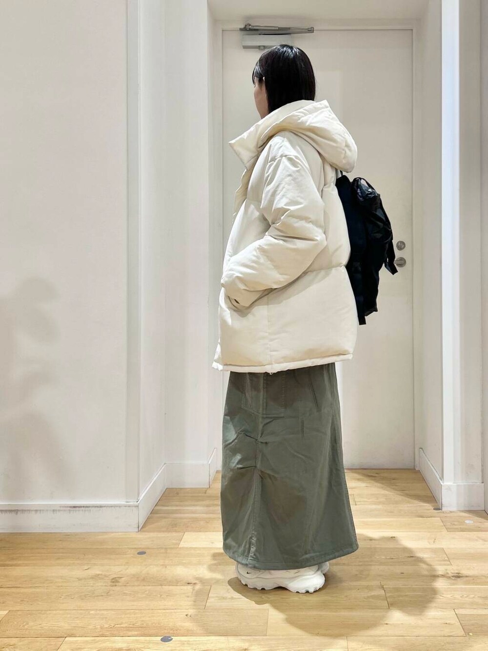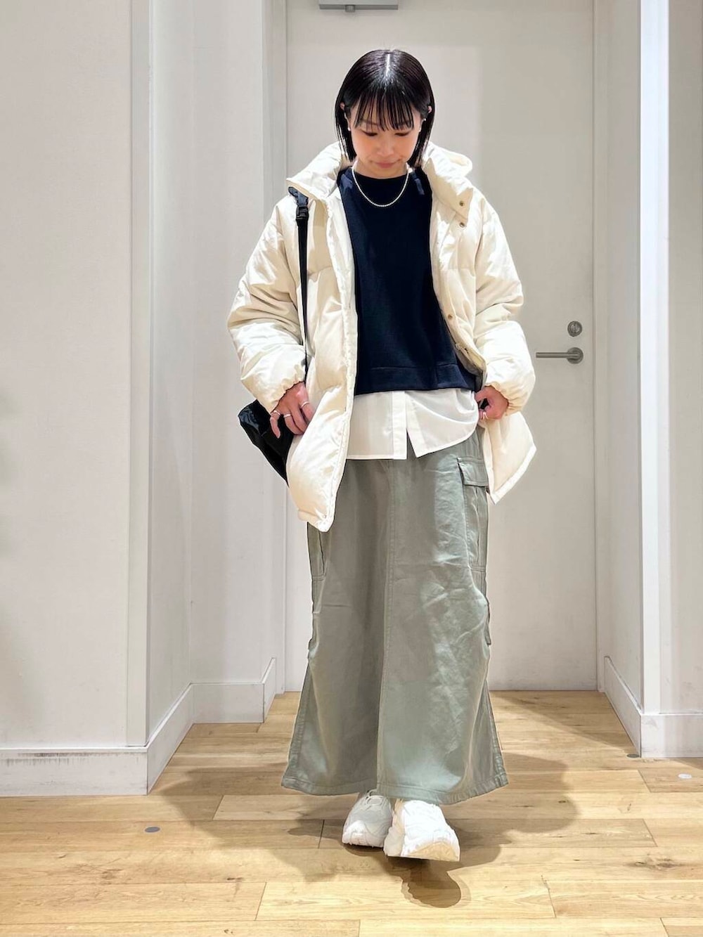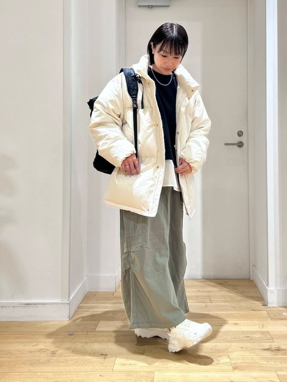 グリーンダウンジャケットは、しっかりお尻が隠れるミドル丈で暖かさや安心感のあるアイテム!