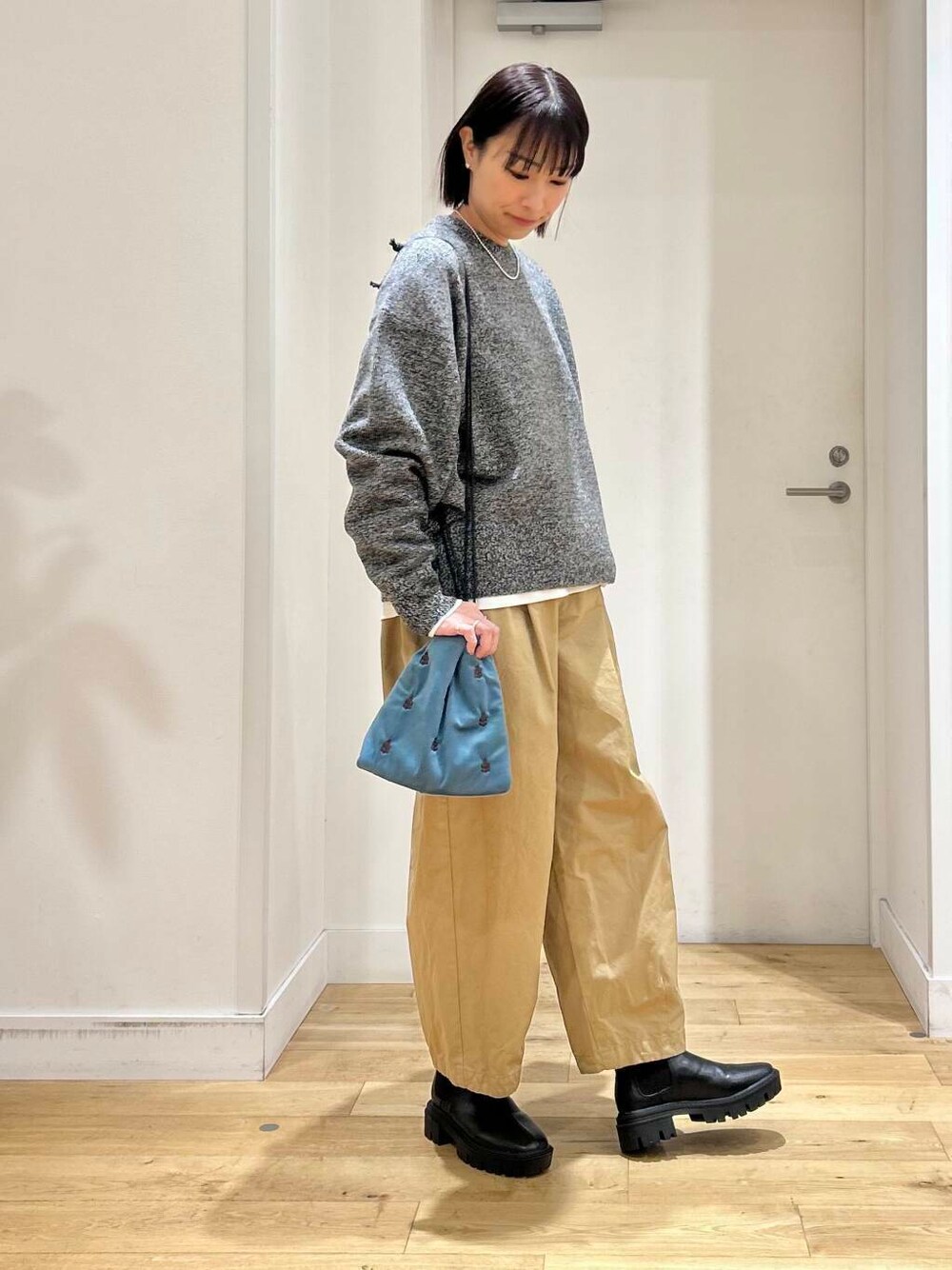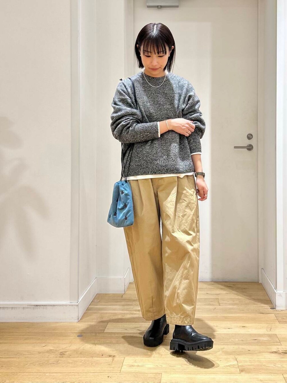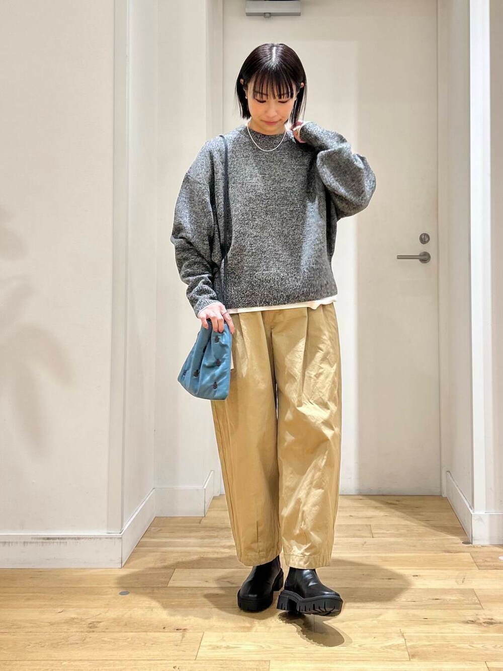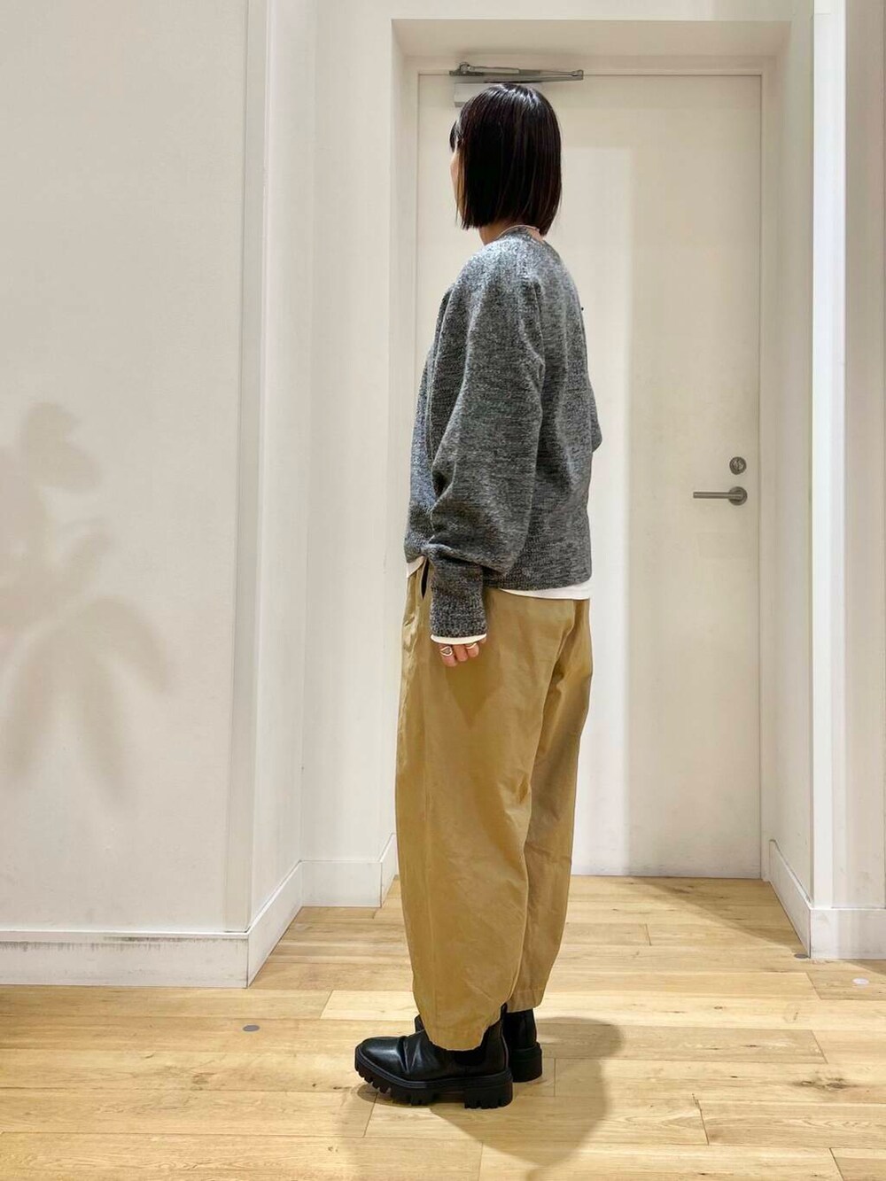 ウールのニットは、腕周りや身幅はゆったりですが、着丈は短めなのでインせずにバランスの取りやすいアイテムです!