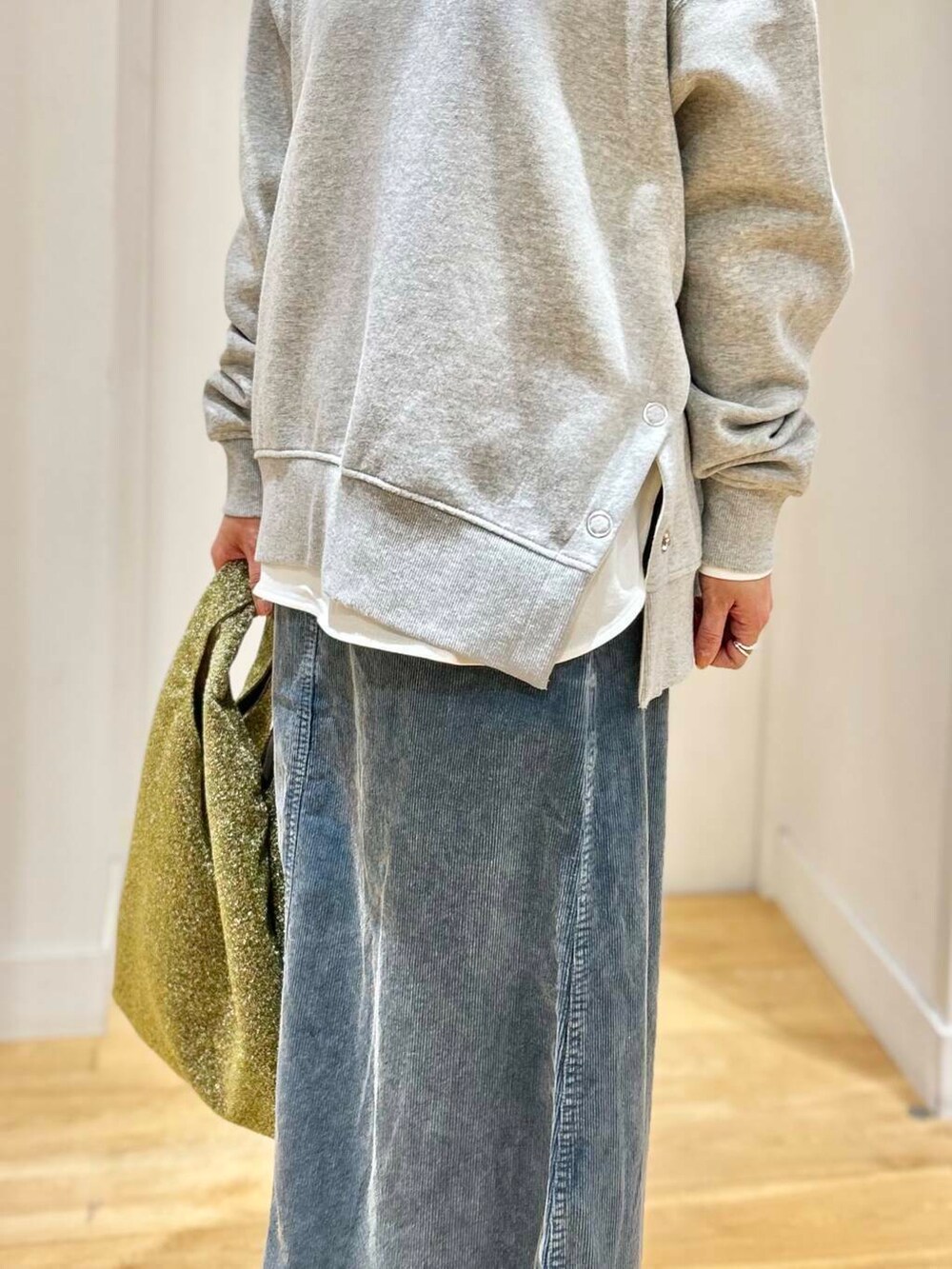 裏起毛のスウェットは、サイドがボタンになっていて、開けるとインナーをちらっと見せるレイヤードが楽しめます!