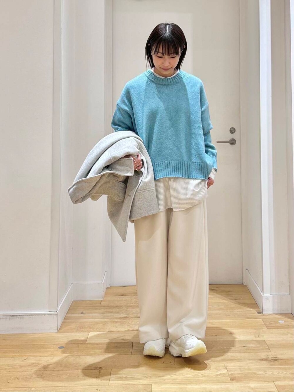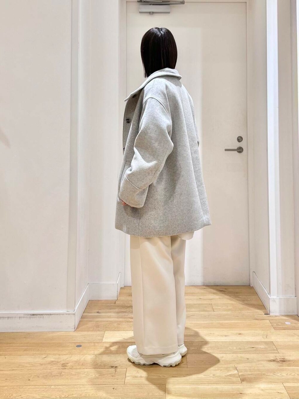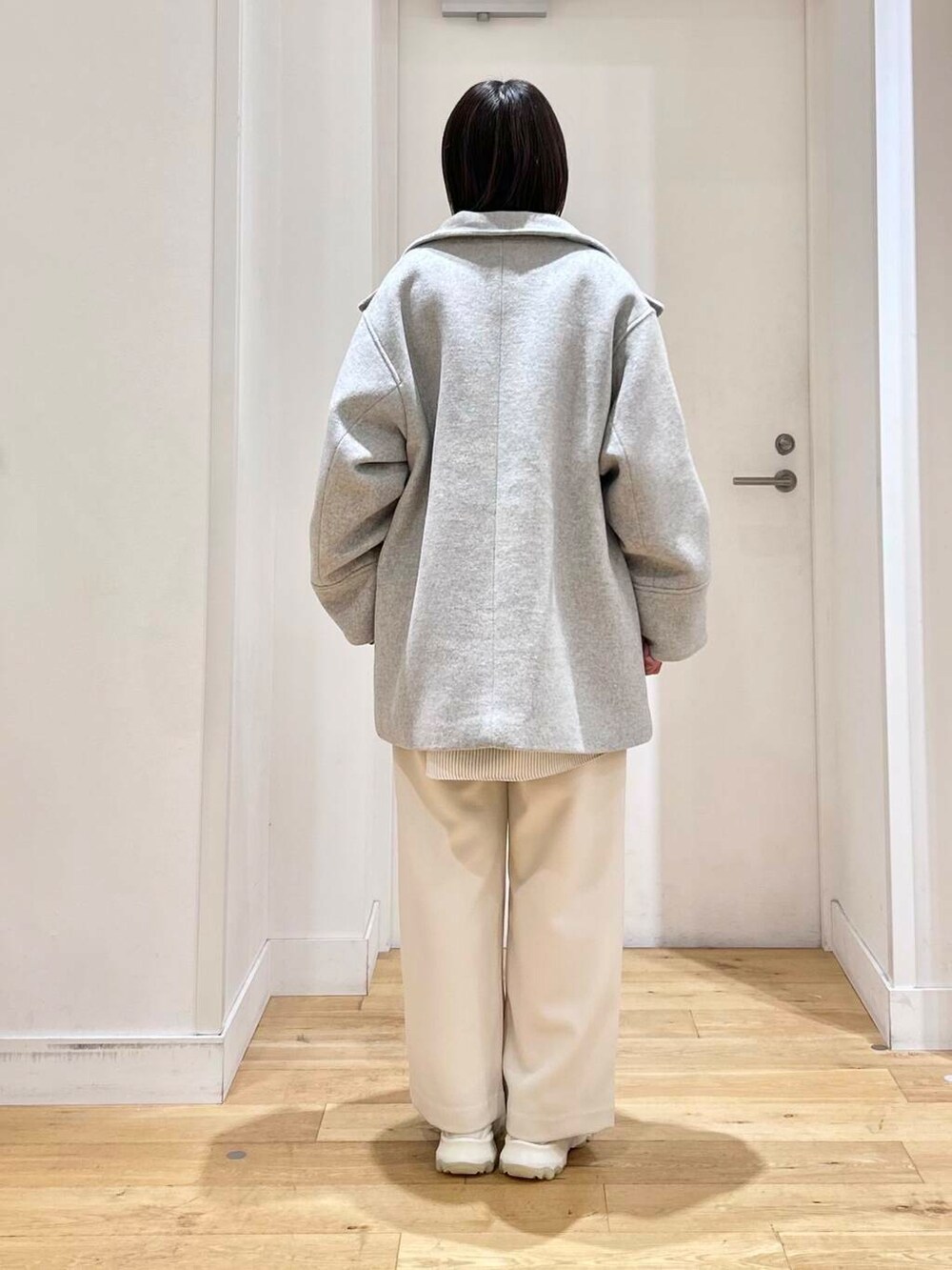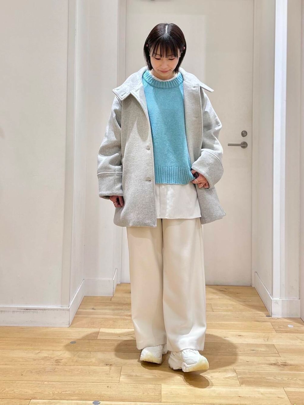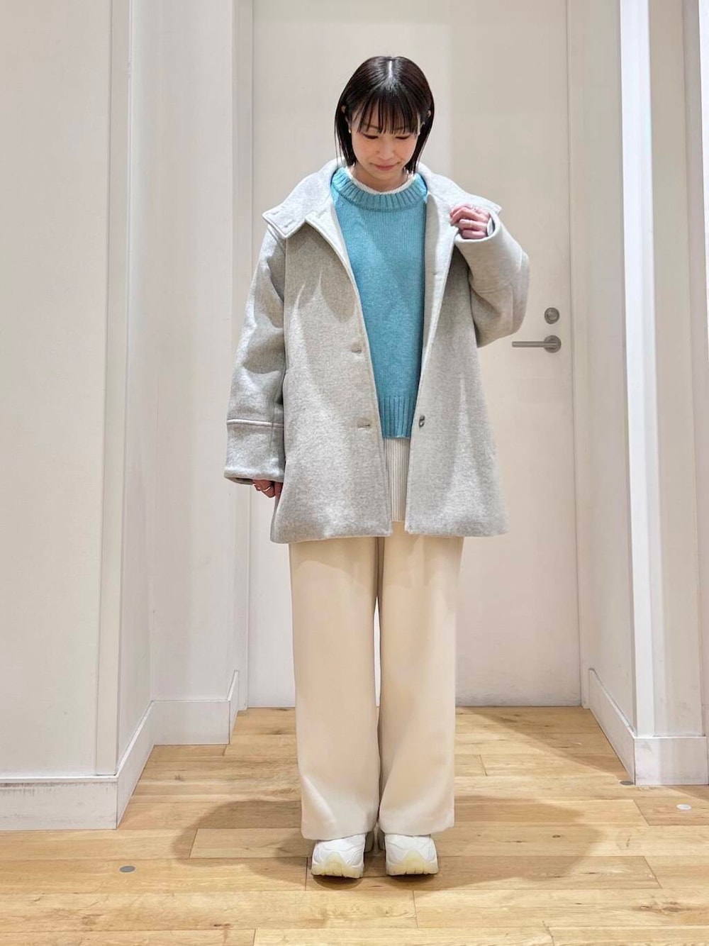 スタンドカラーのコートは、ゆとりのあるサイズ感なので厚手のインナーも楽に合わせていただけます!