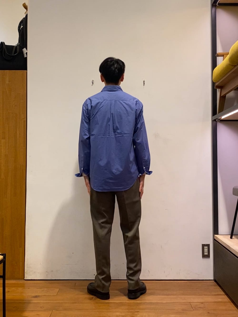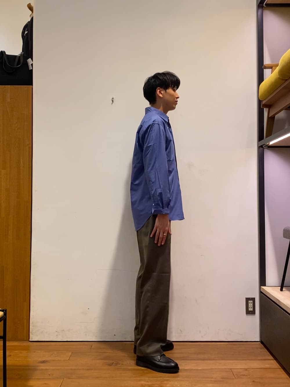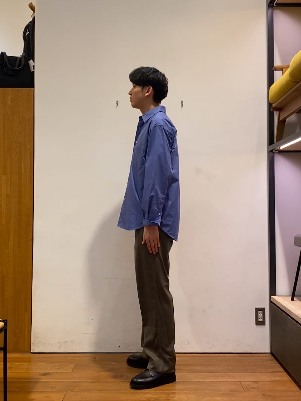 ブルーのカラーが映えるシャツにウールライクの生地を使ったストレートシルエットのトラウザーを着てみました!
