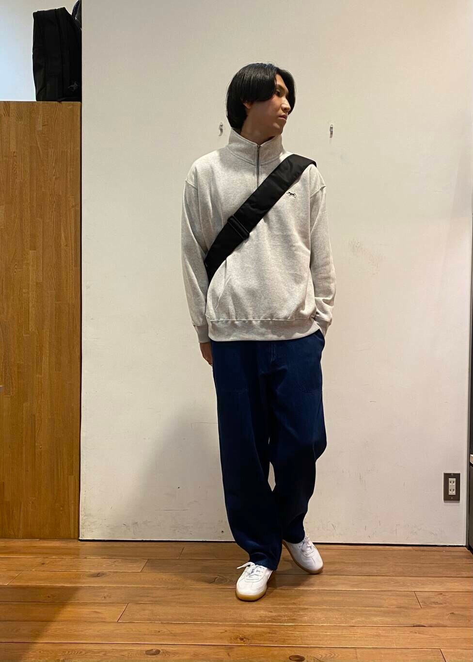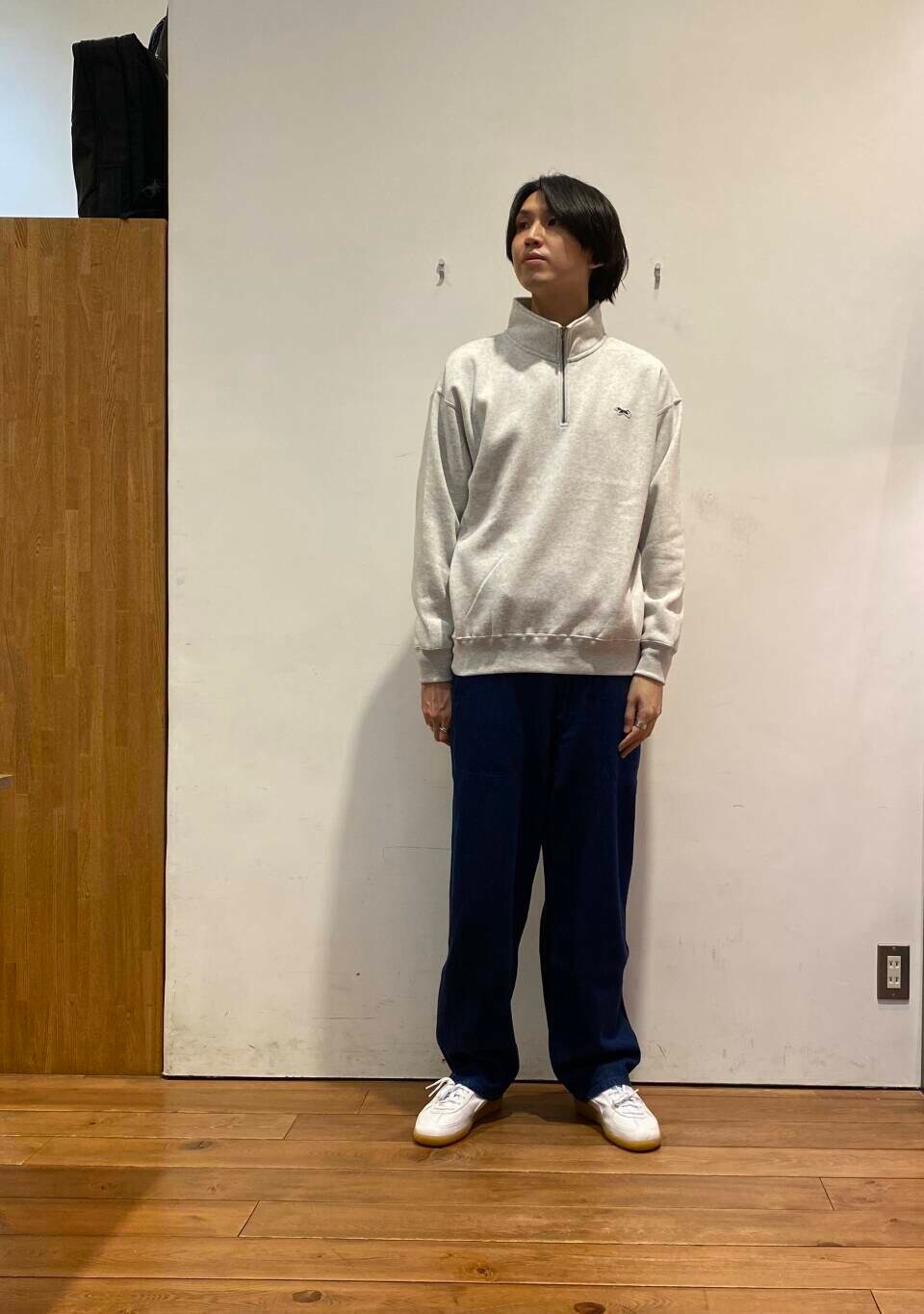 スウェットは、程よくゆとりのあるサイズ感で、首元のジップを閉めて1枚でさらっと着るのも良し、ジップを開けてカットソーやシャツなどのインナーをみせるのもかっこいいので着回しがききますね!