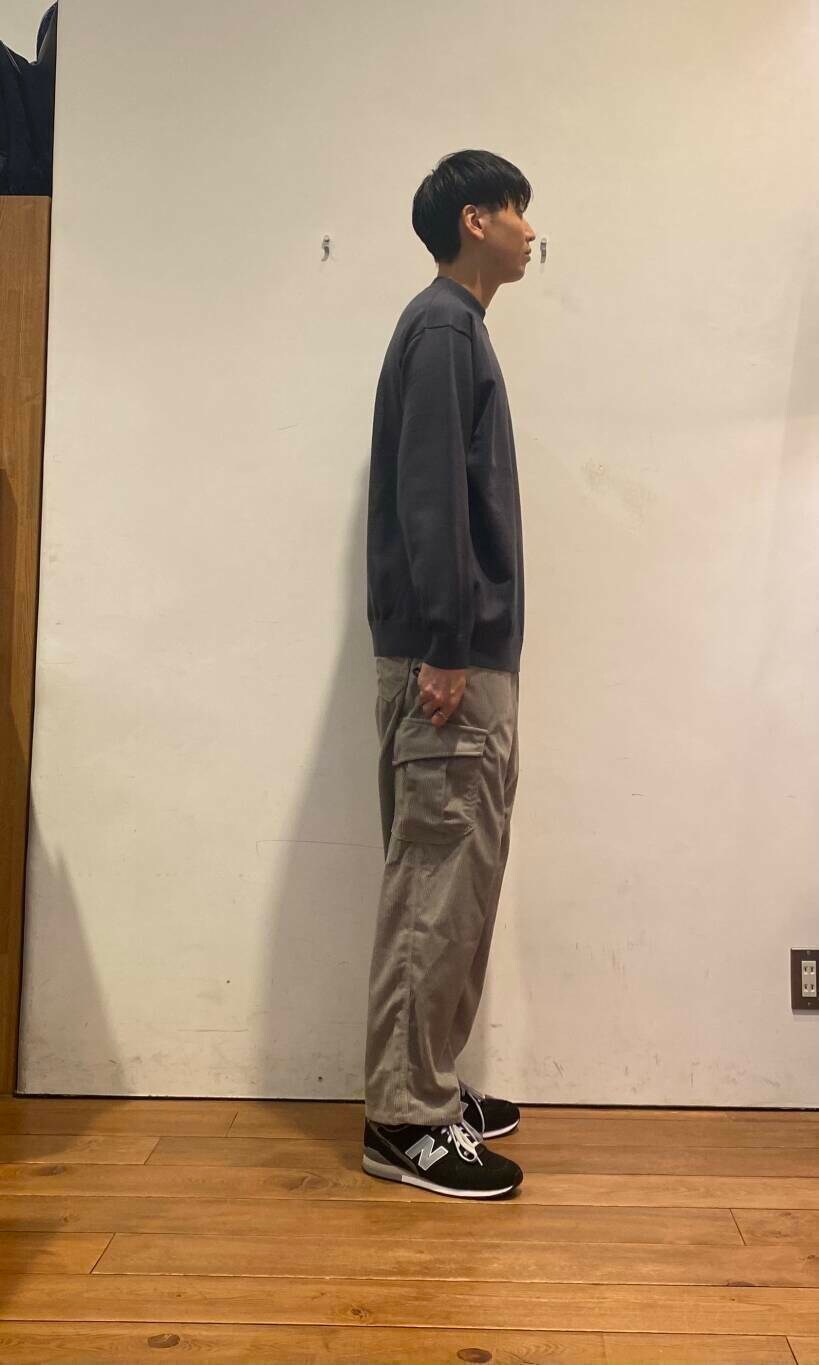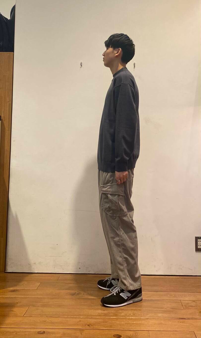 程よくゆとりのあるワイドシルエットなので、ワッフルTシャツのサイズ感と良く合いますね!