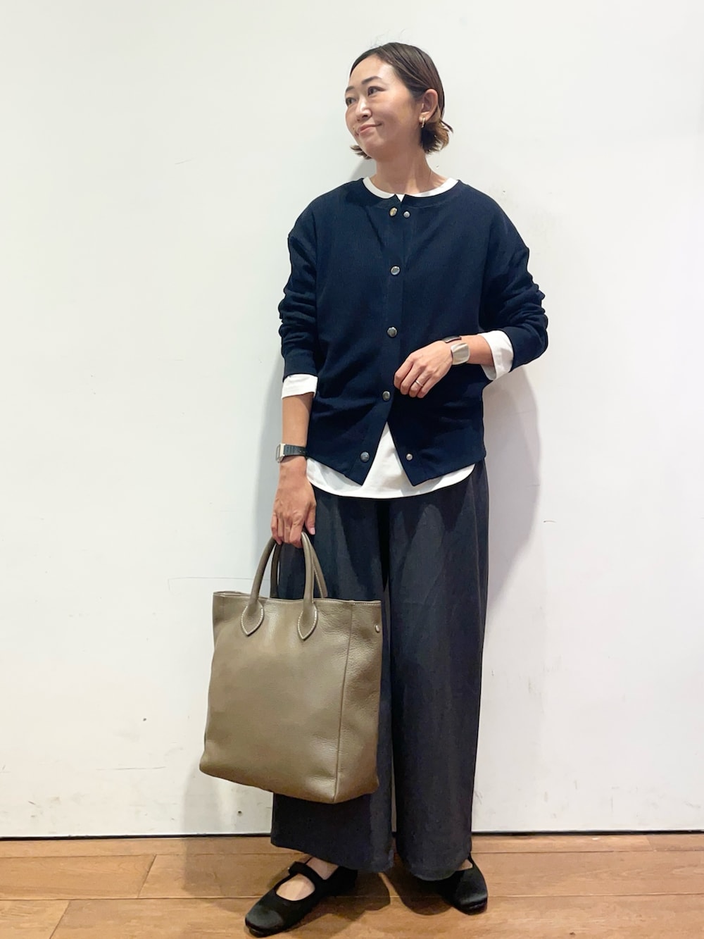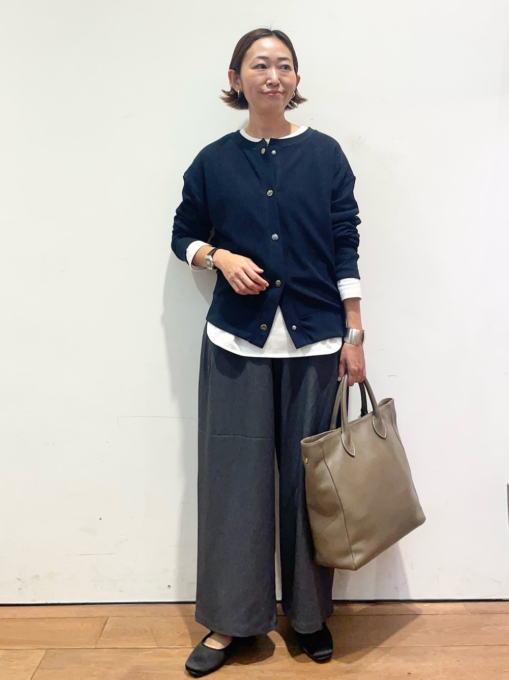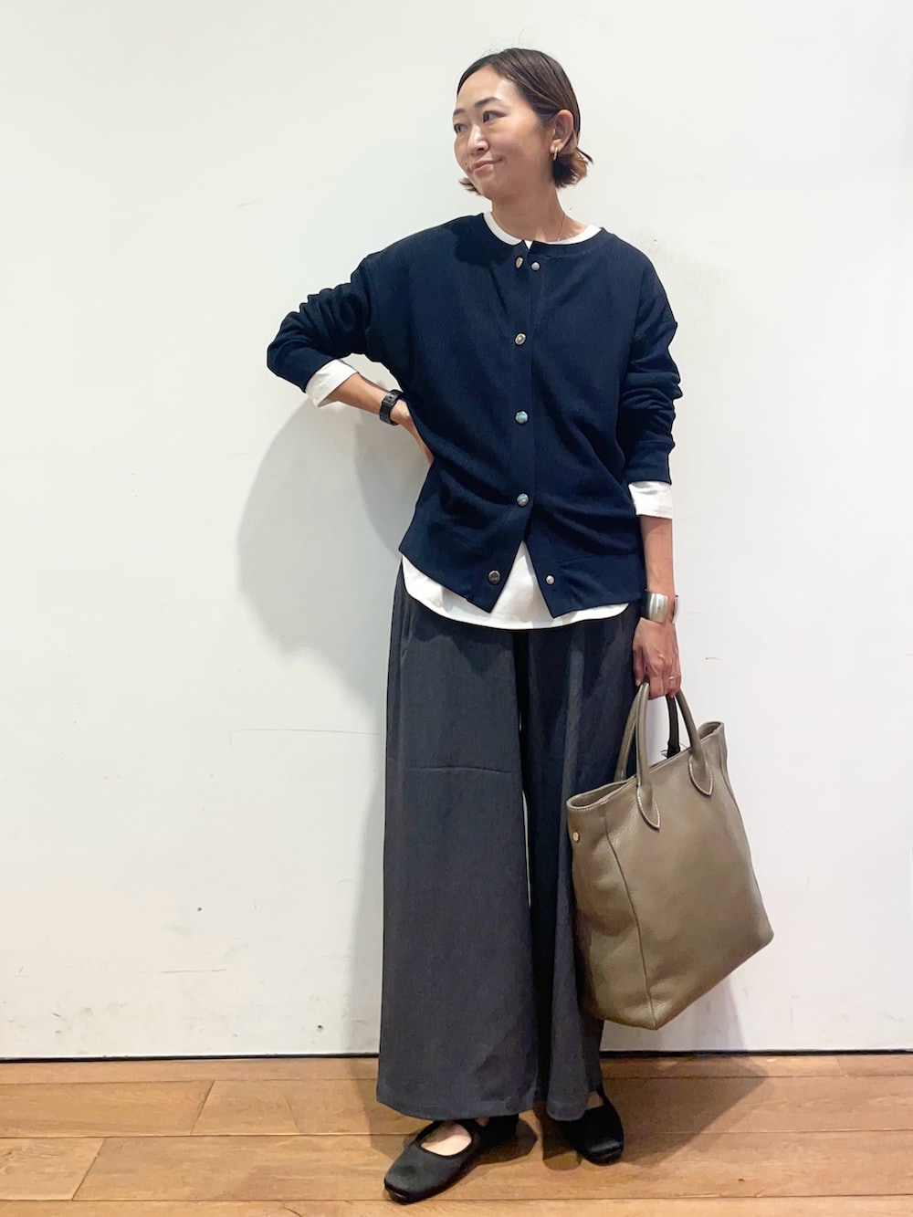タックフライスのカーディガンはスナップボタンで開け閉めもしやすく、