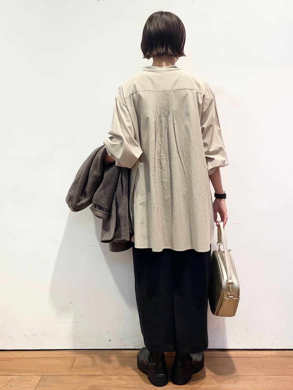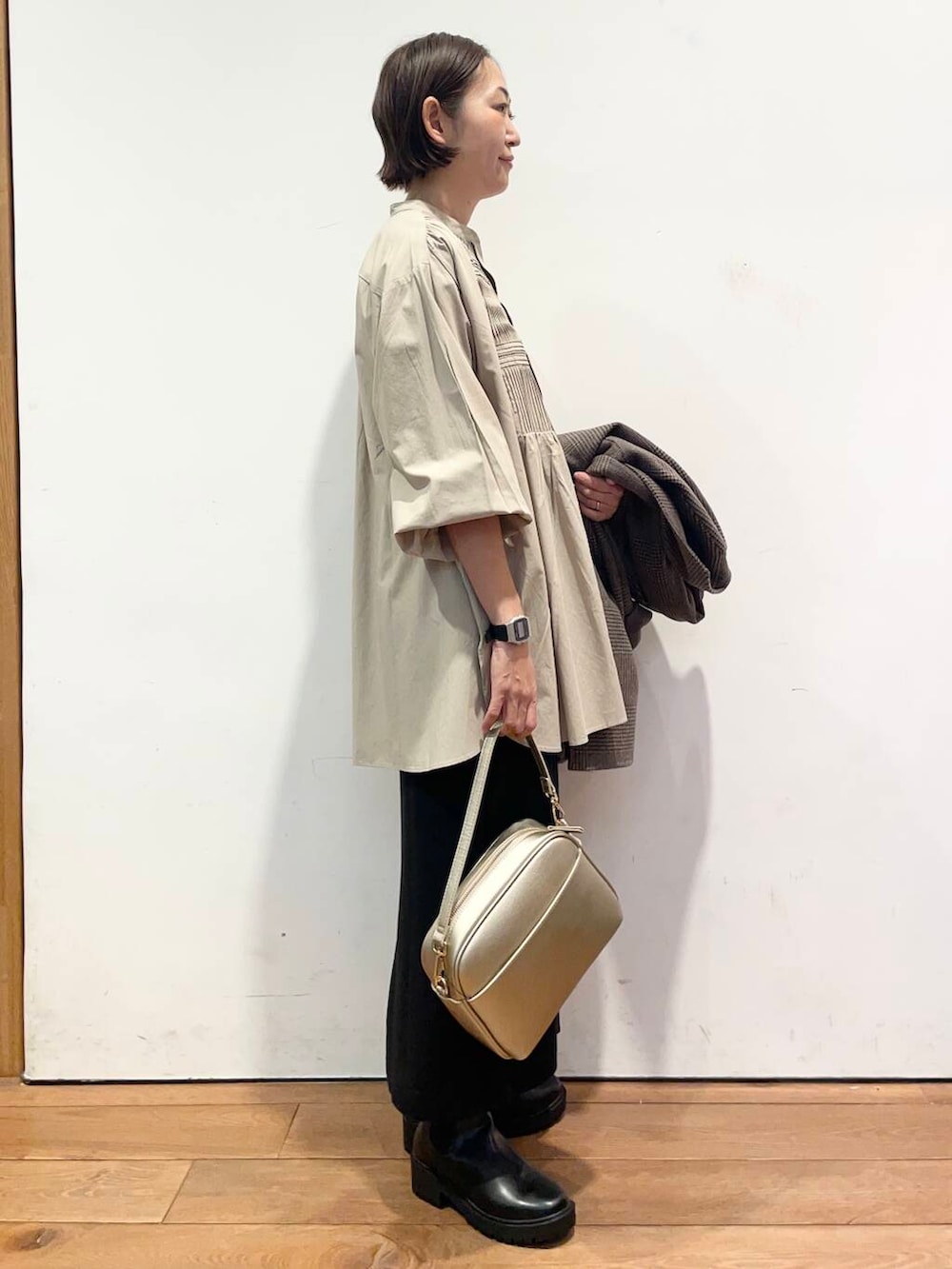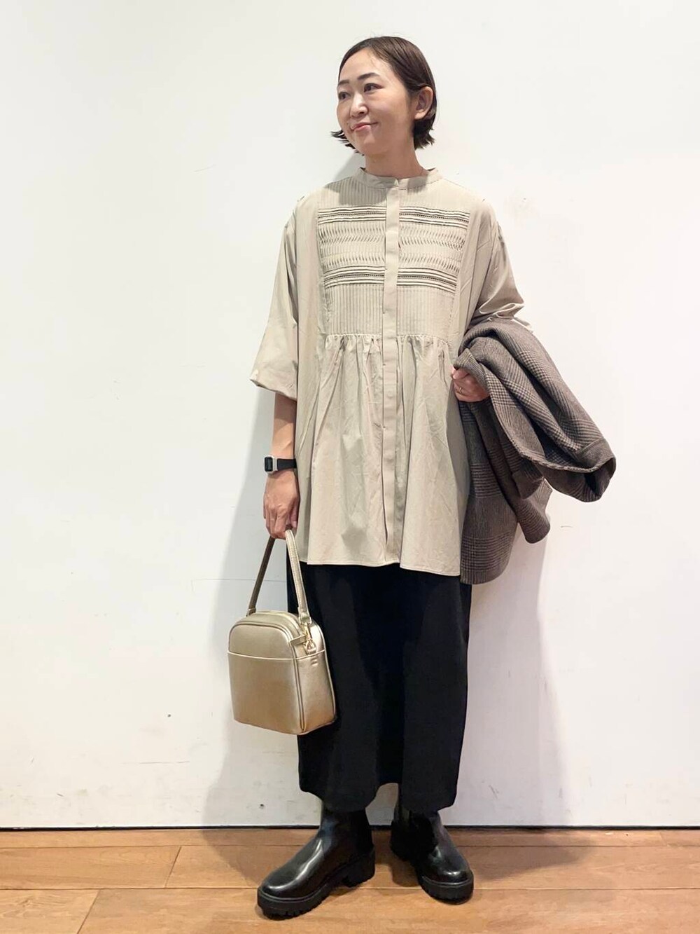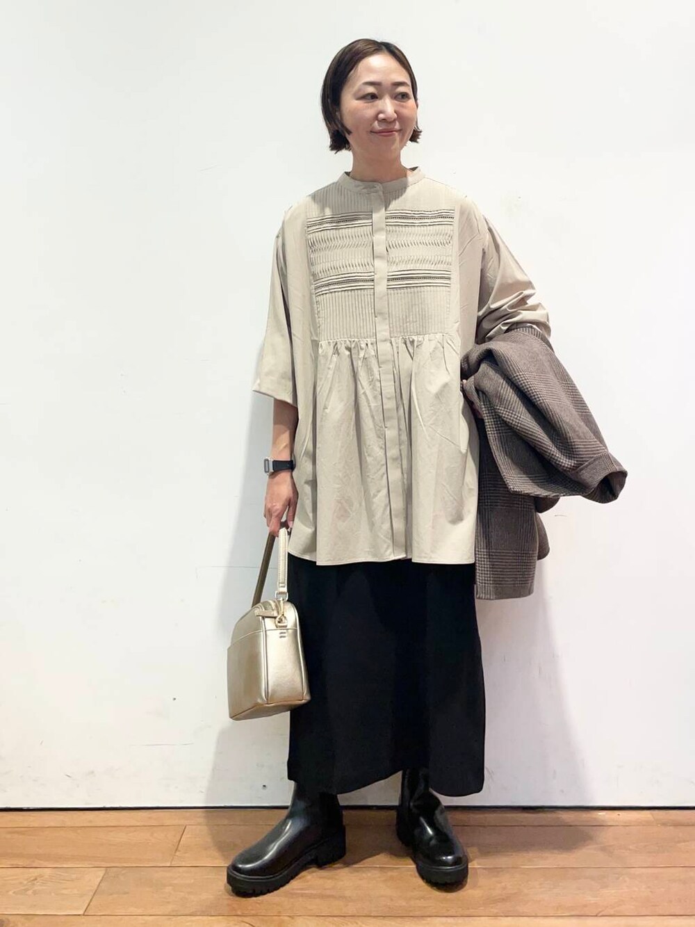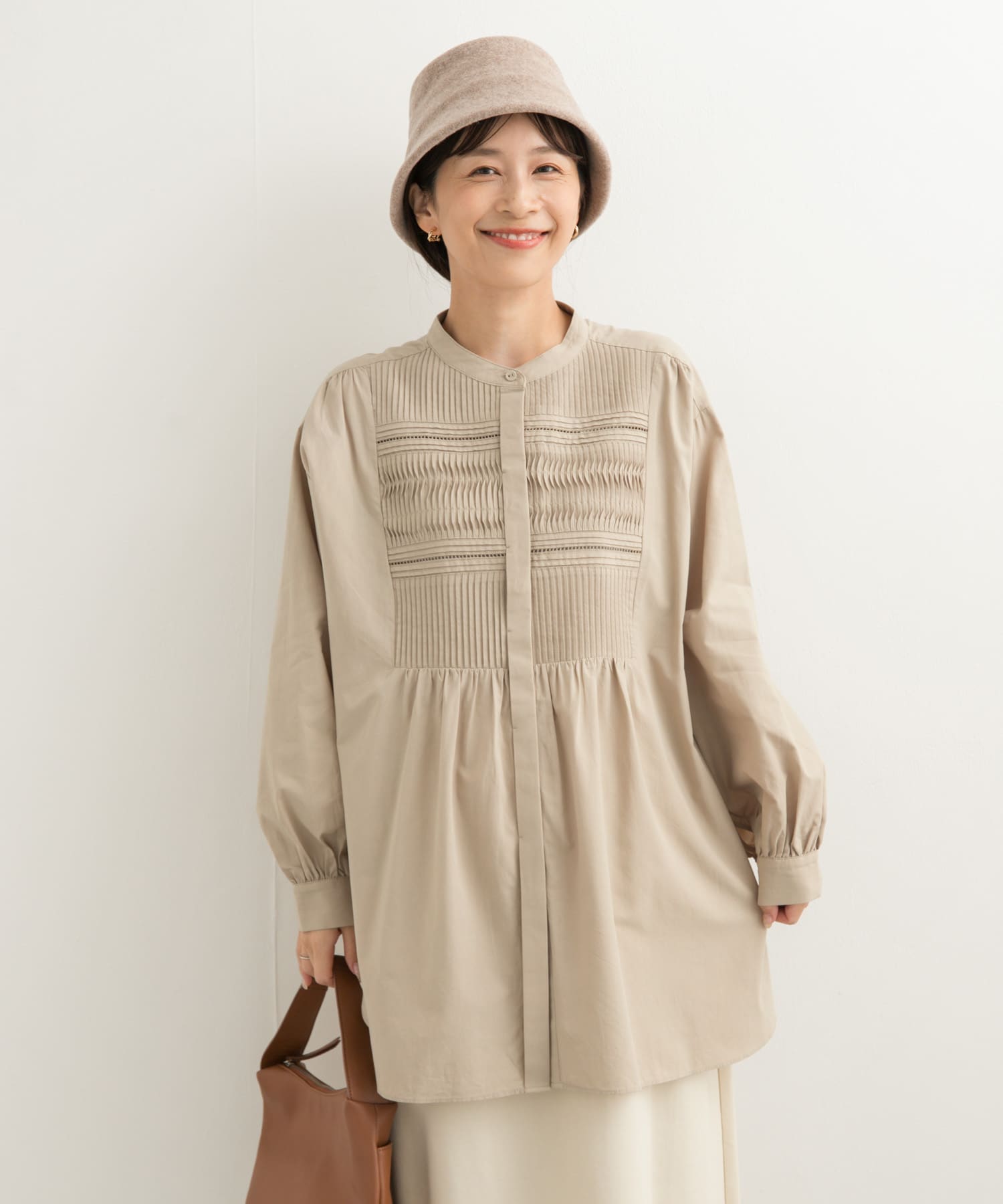 ピンタックチュニックシャツは幅広いシーンで使えるデザインで、オンオフ兼用で着られます。