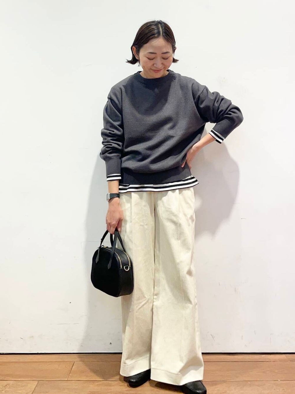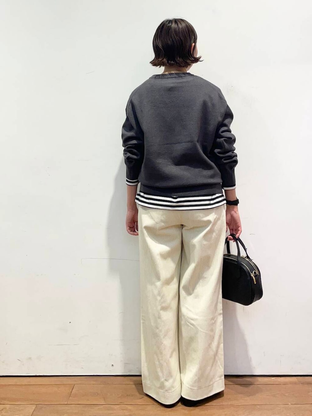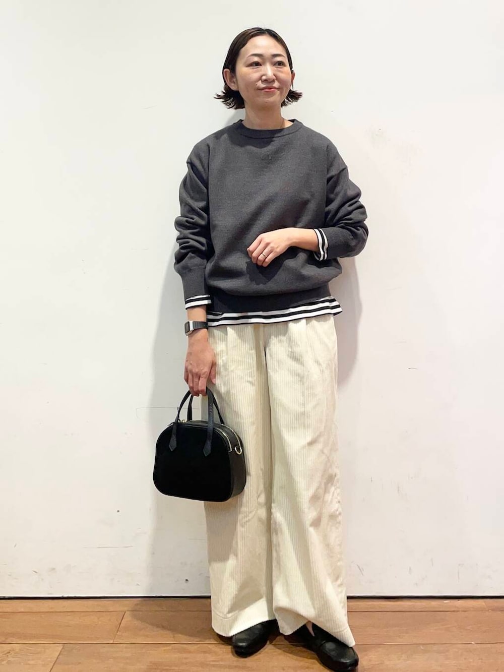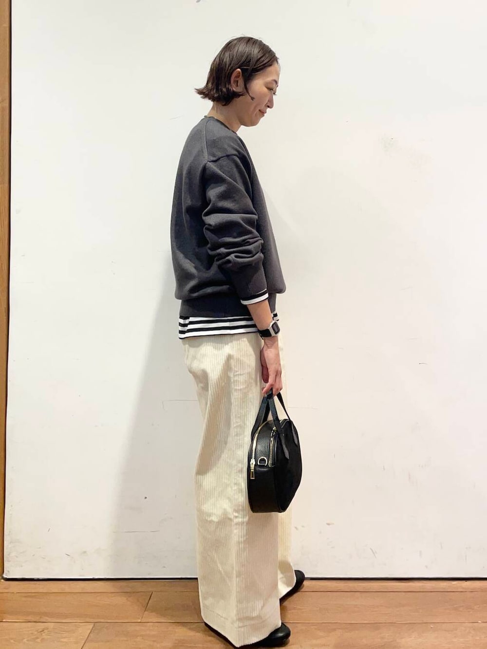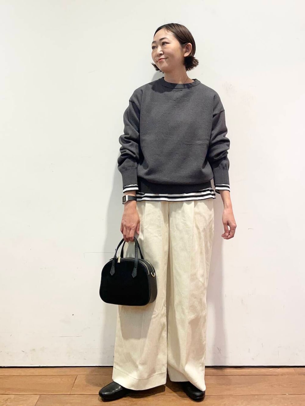 コーデュロイも太めのなので縦のラインが出て、すごくキレイなシルエットで履いていただけます💡
