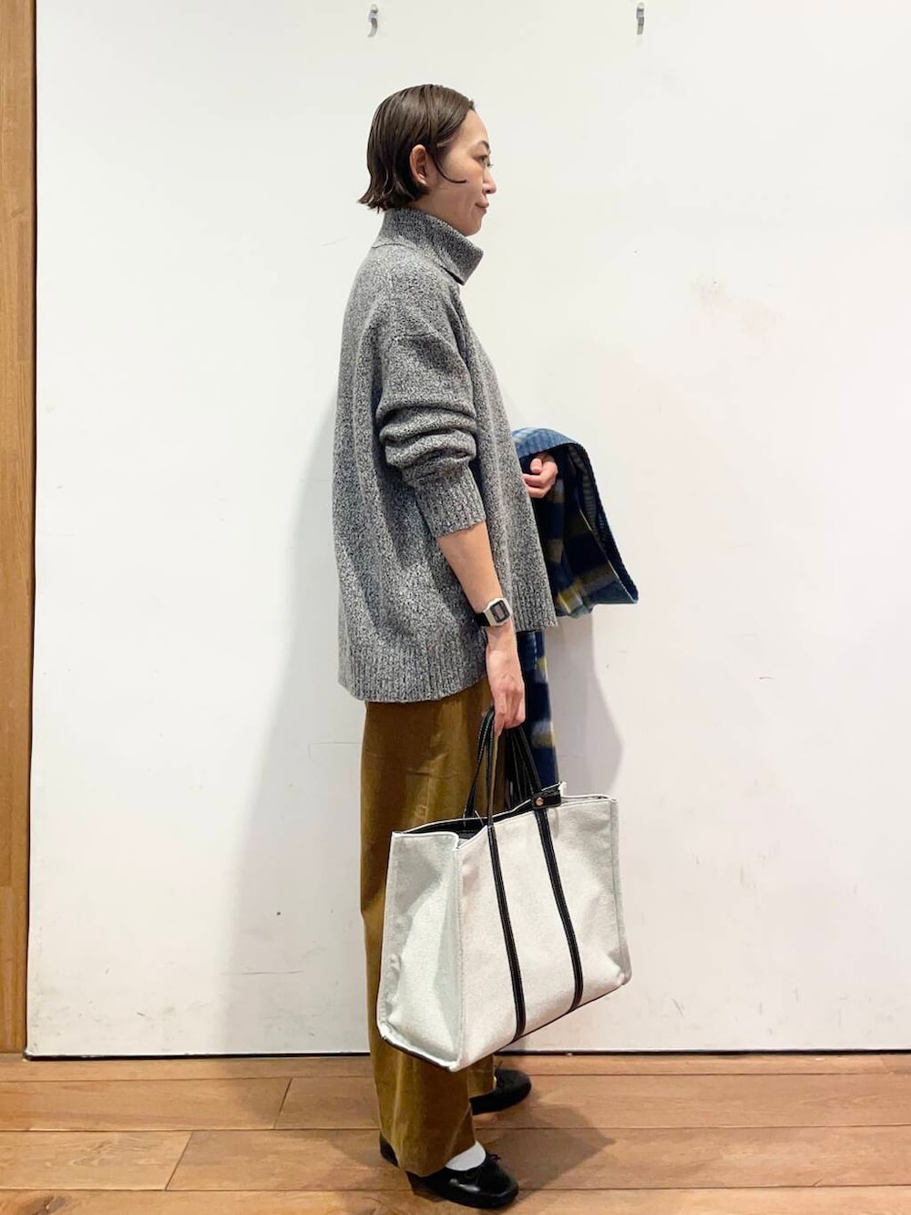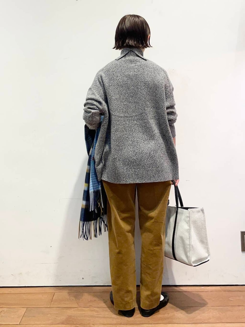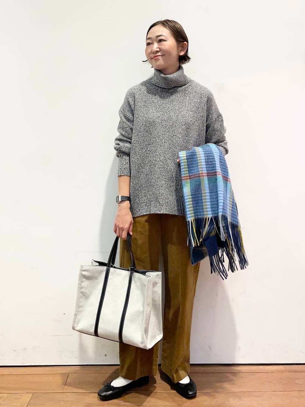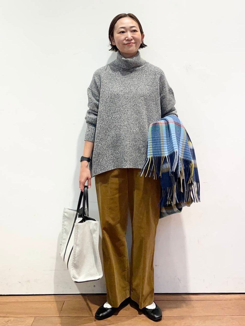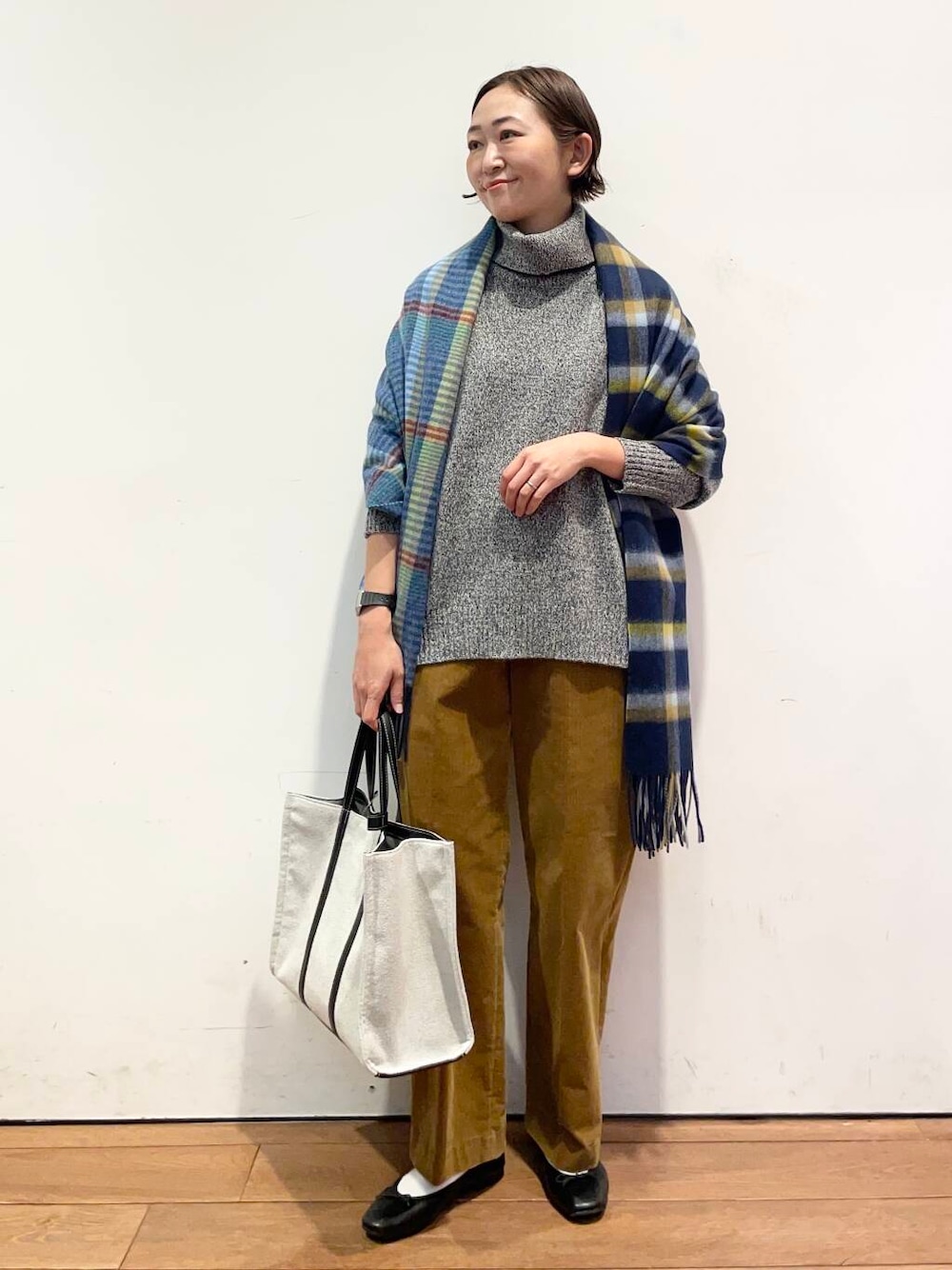コーデュロイのパンツも比較的スッキリとしたシルエットで、