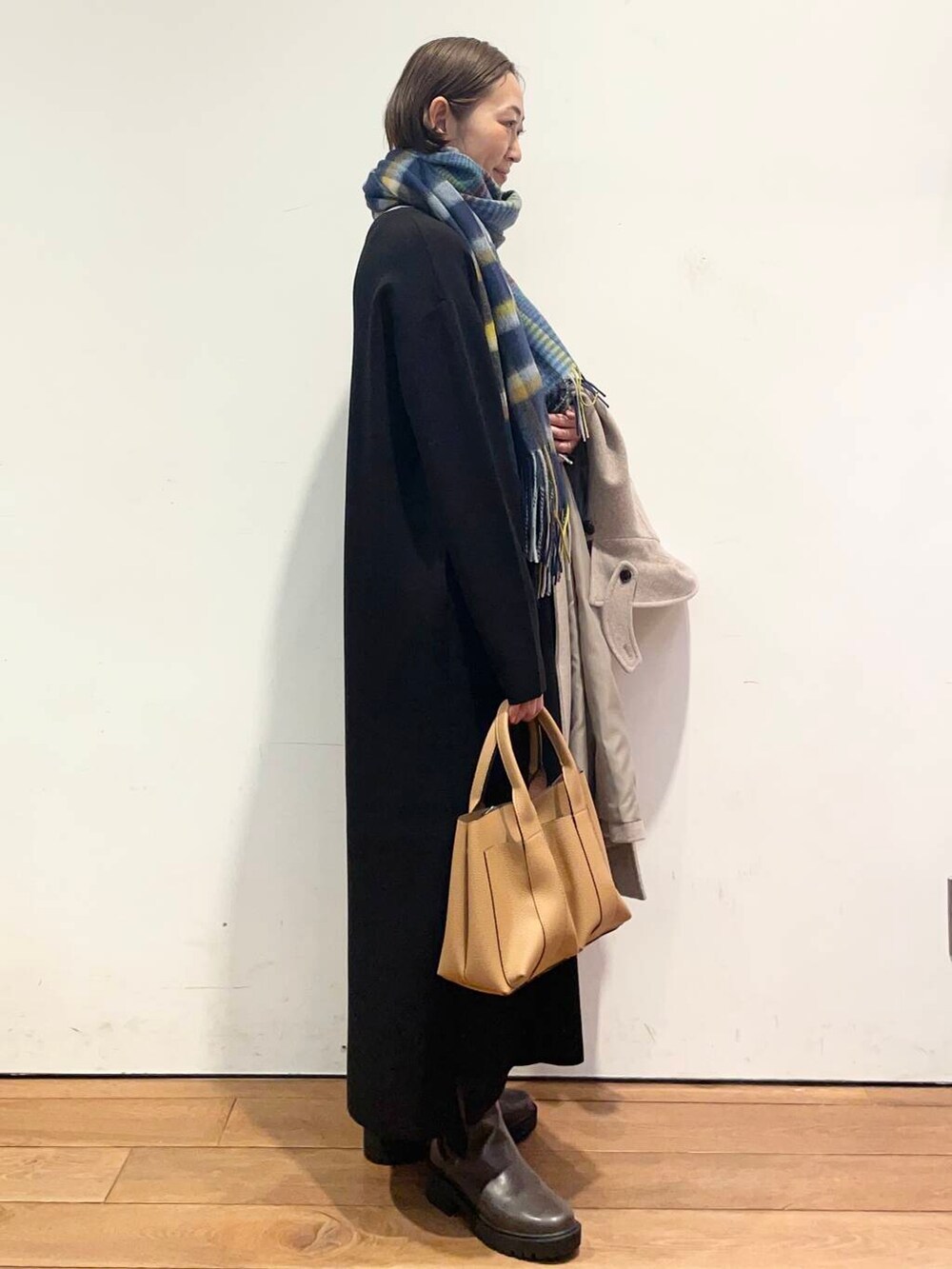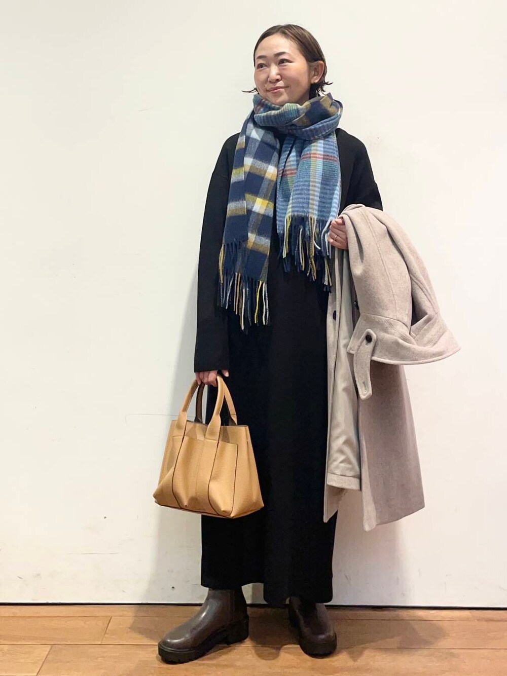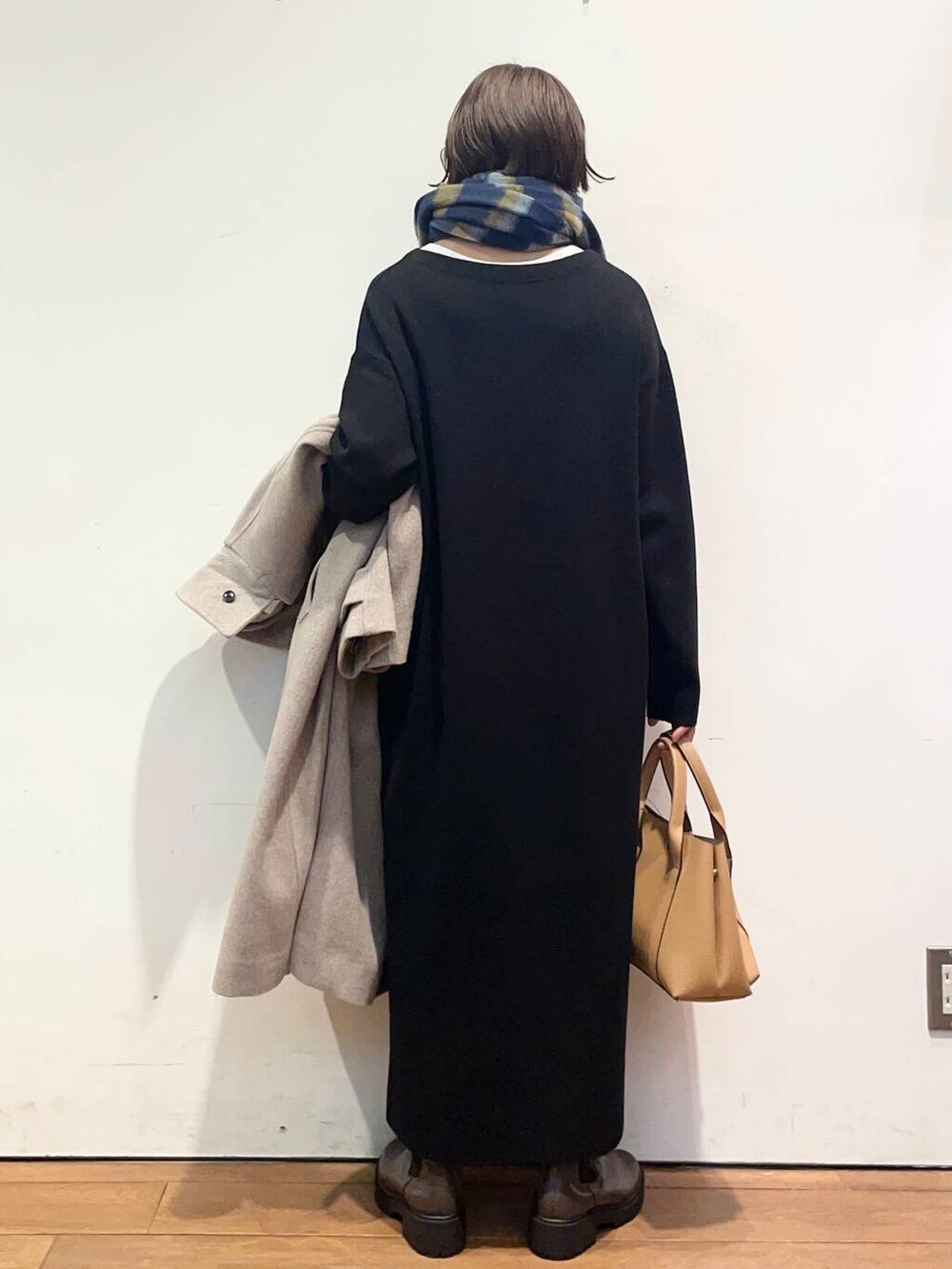 中に着たニットのワンピースもサラッとシンプルなデザインで、