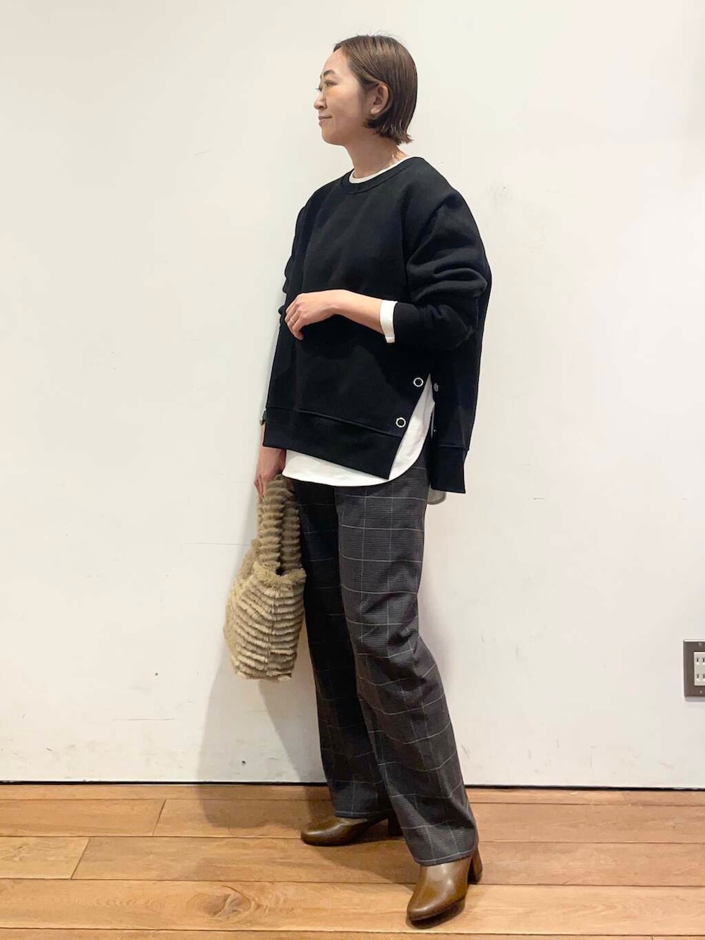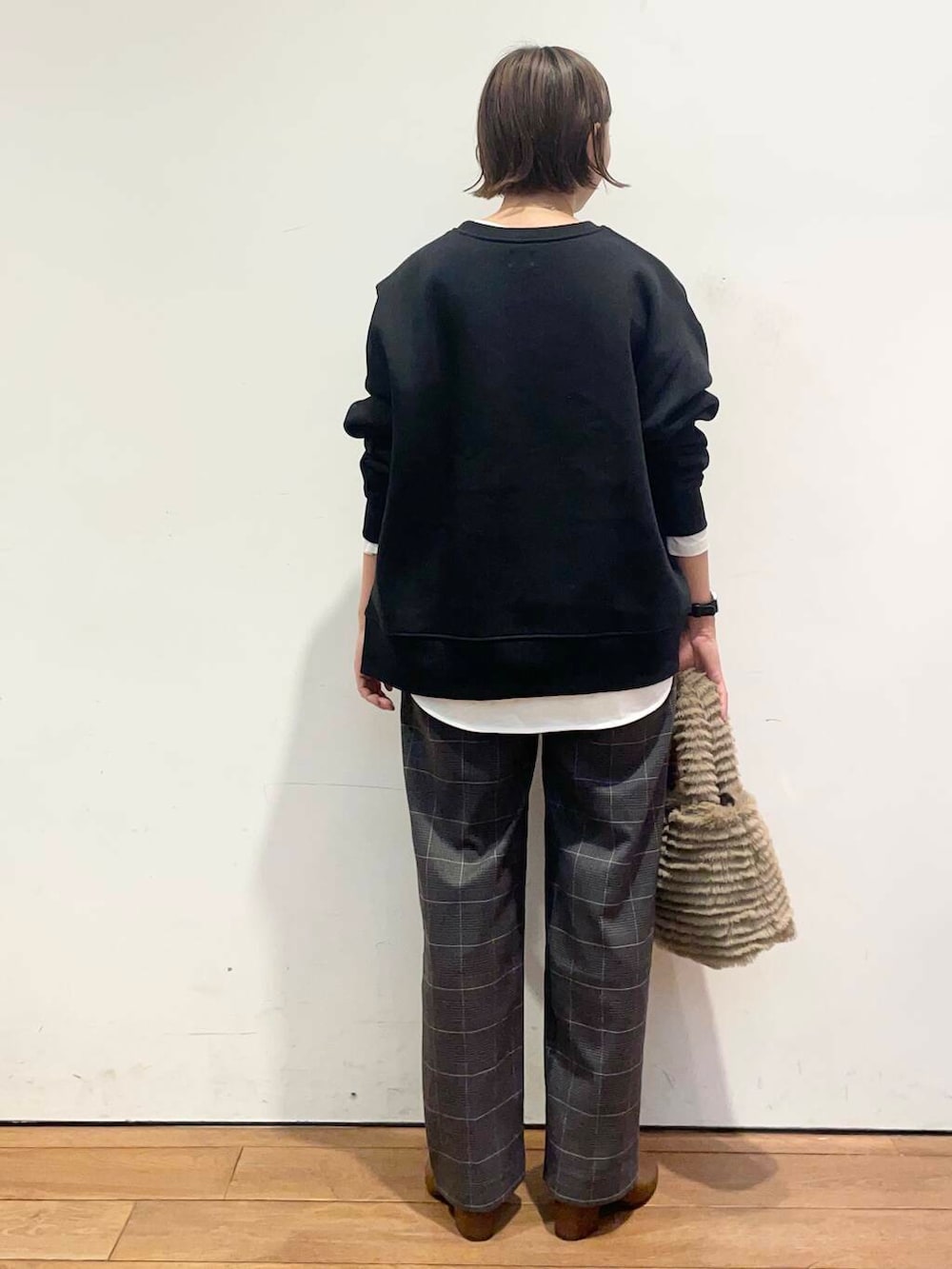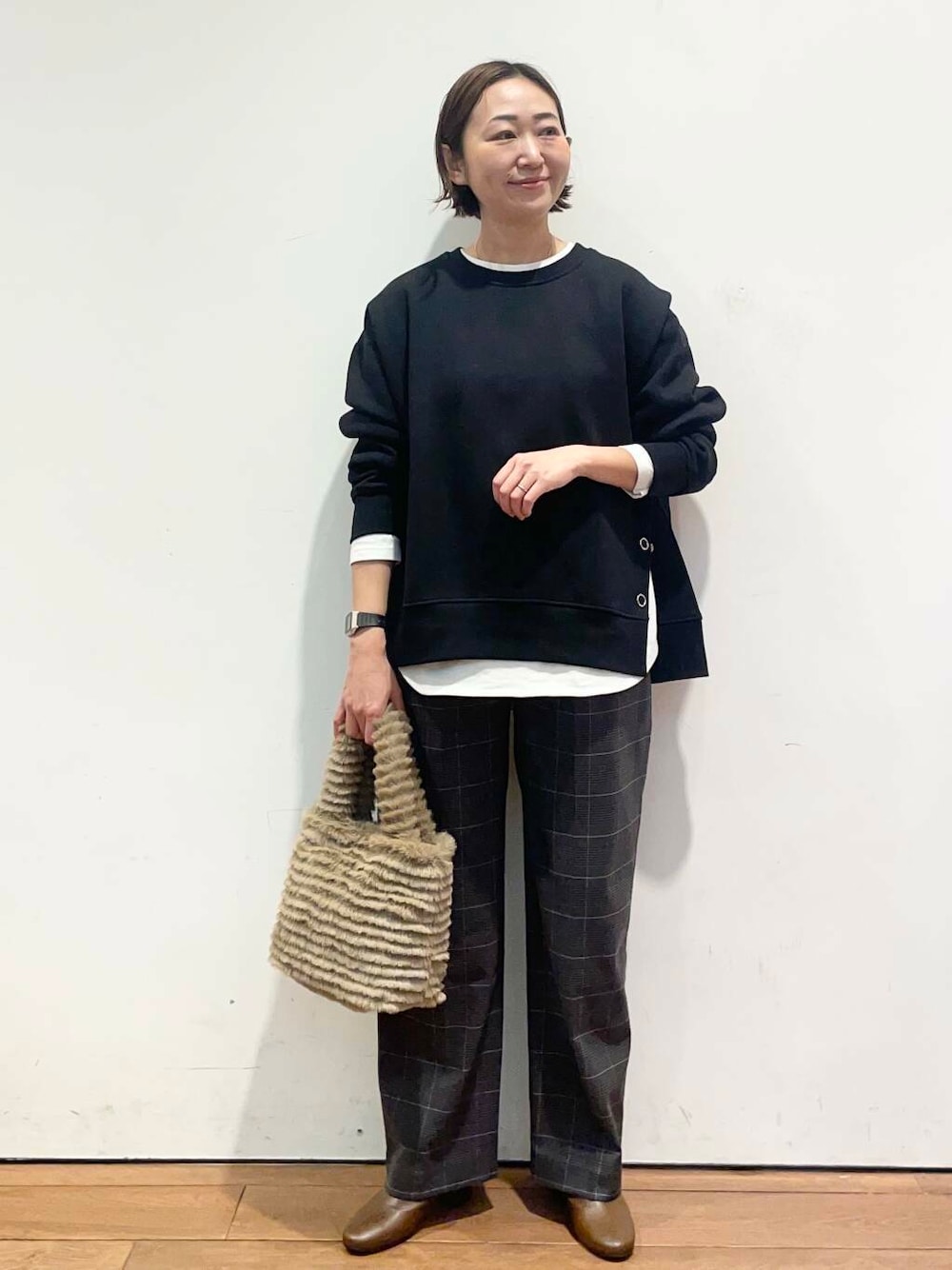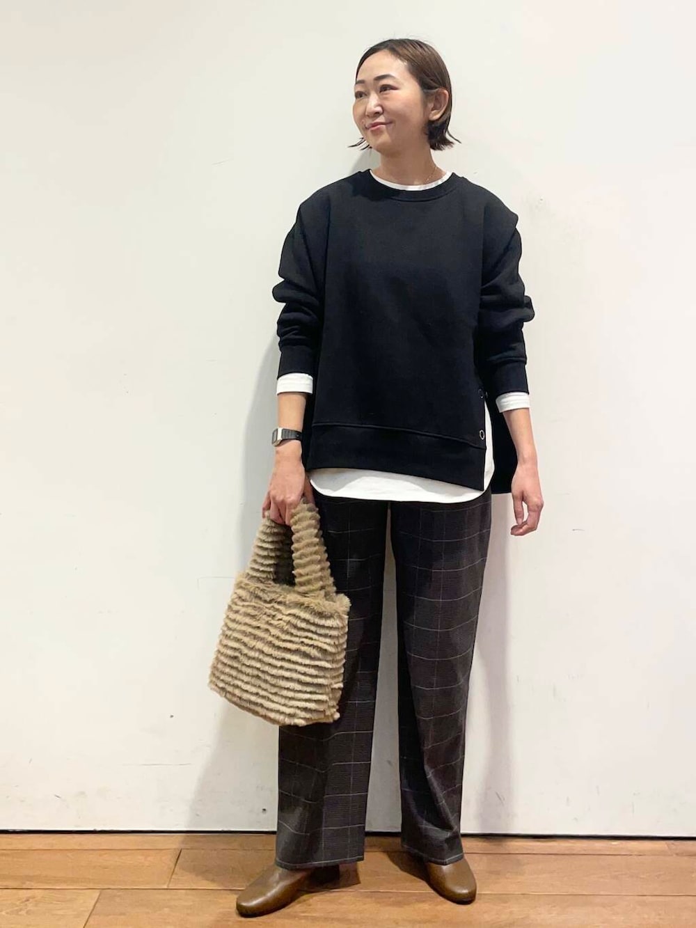 チェックのトラウザーパンツもゆるっとしたシルエットで、