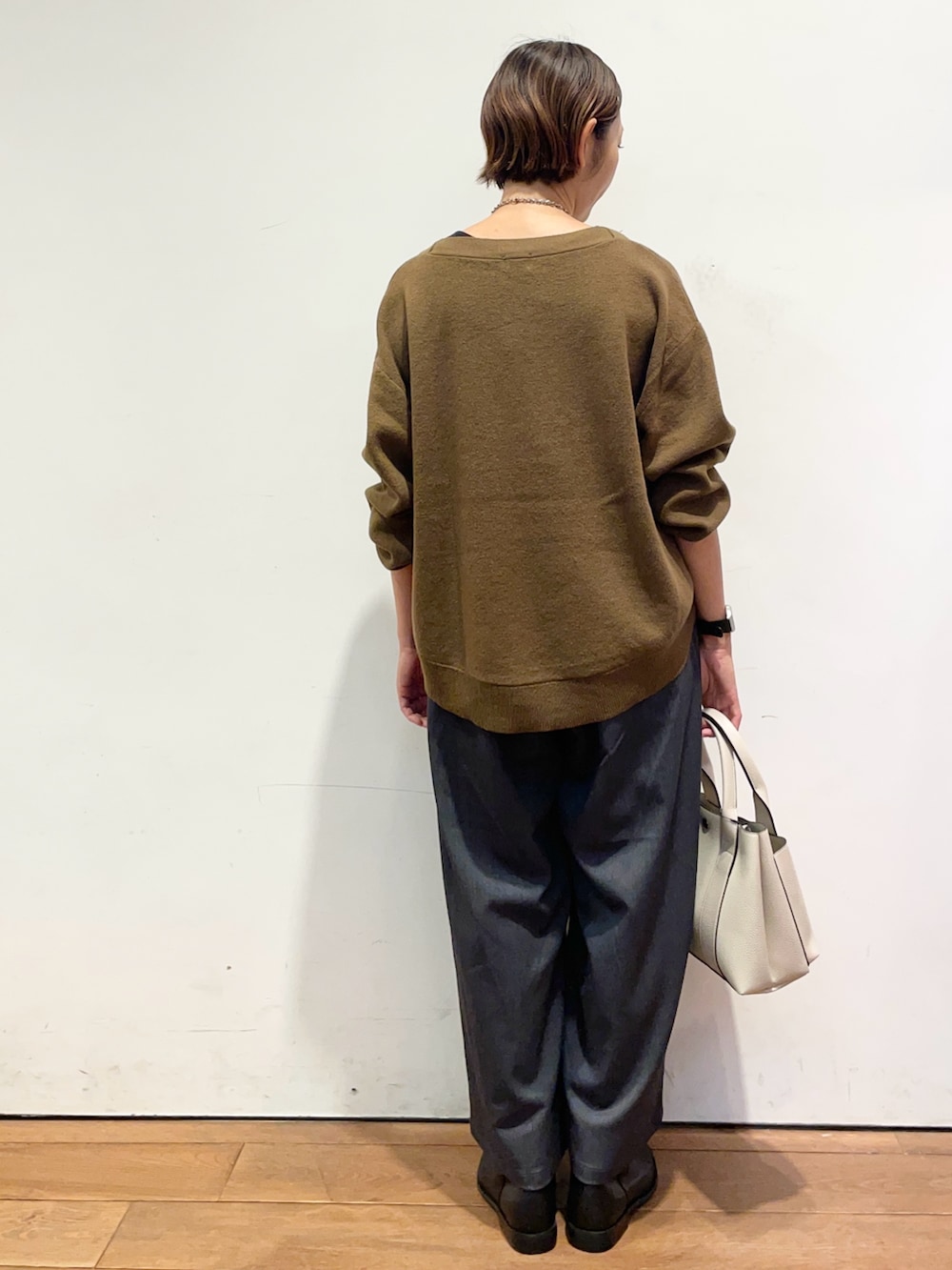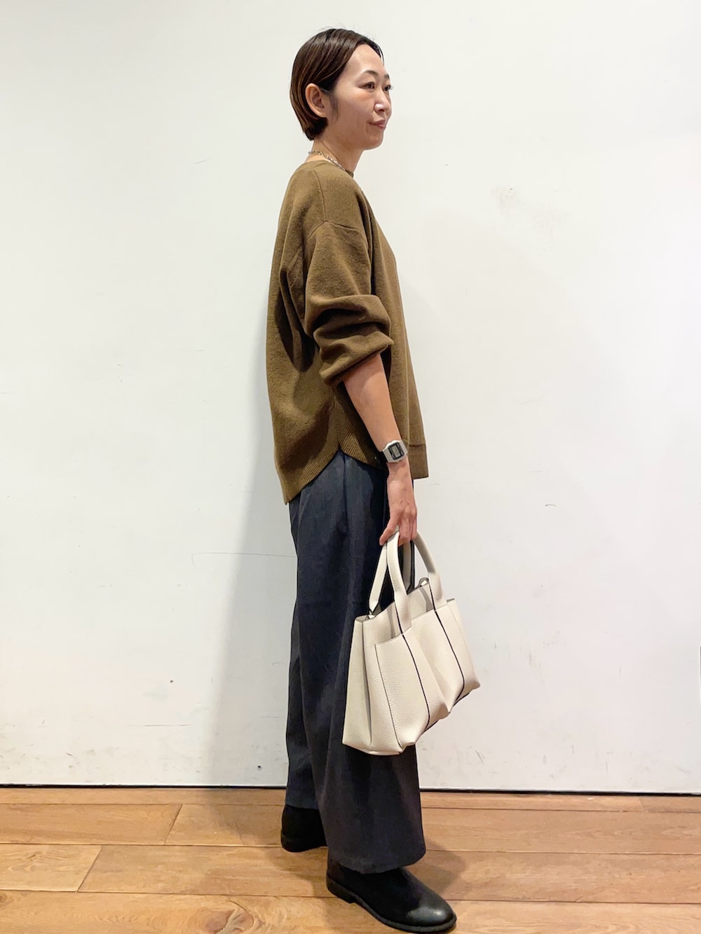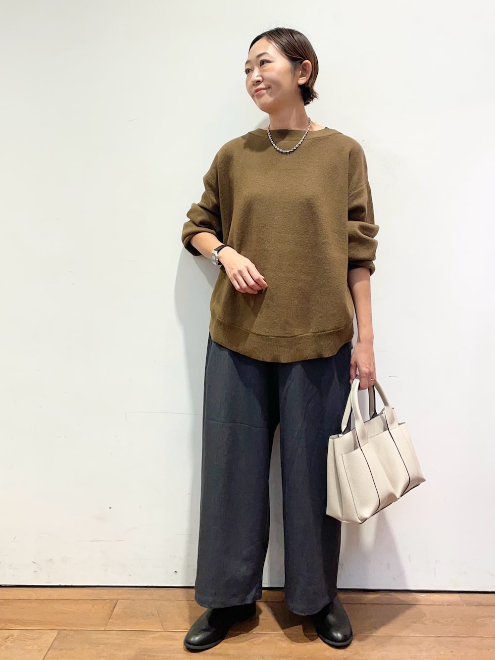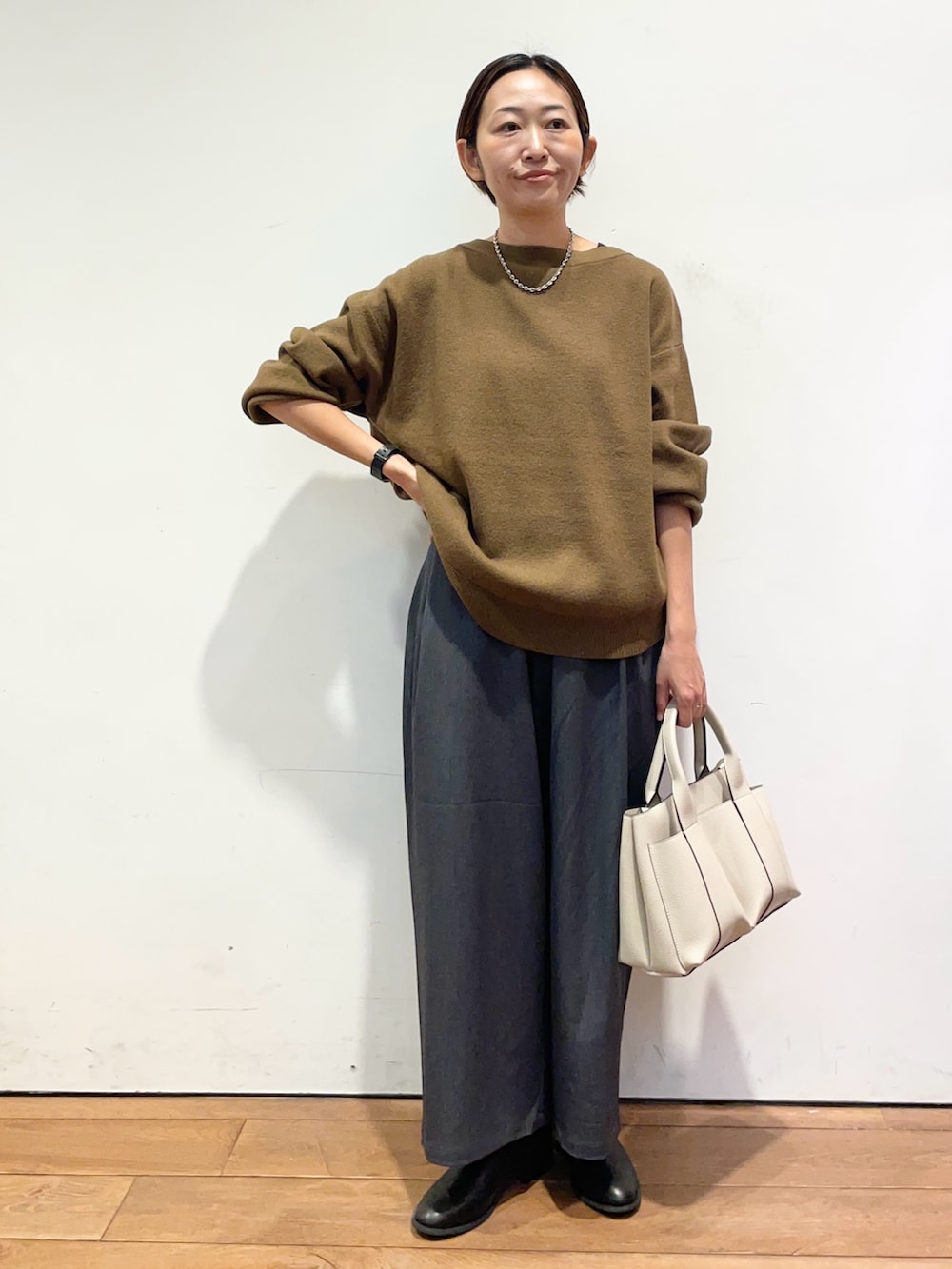 ニットはボートネックで、顔周りもスッキリした印象になります✨