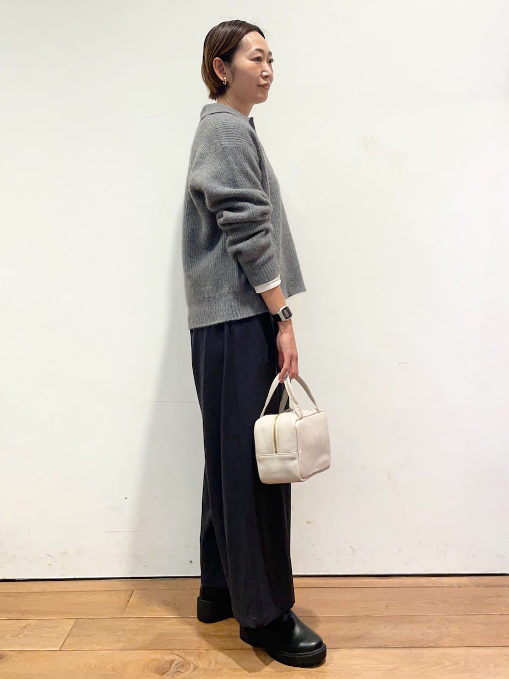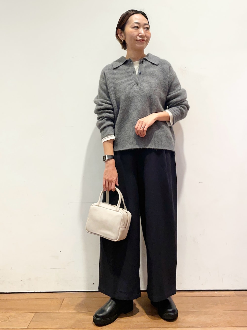 襟付きのニットはトレンド感があり、