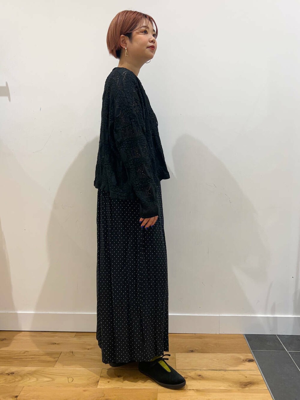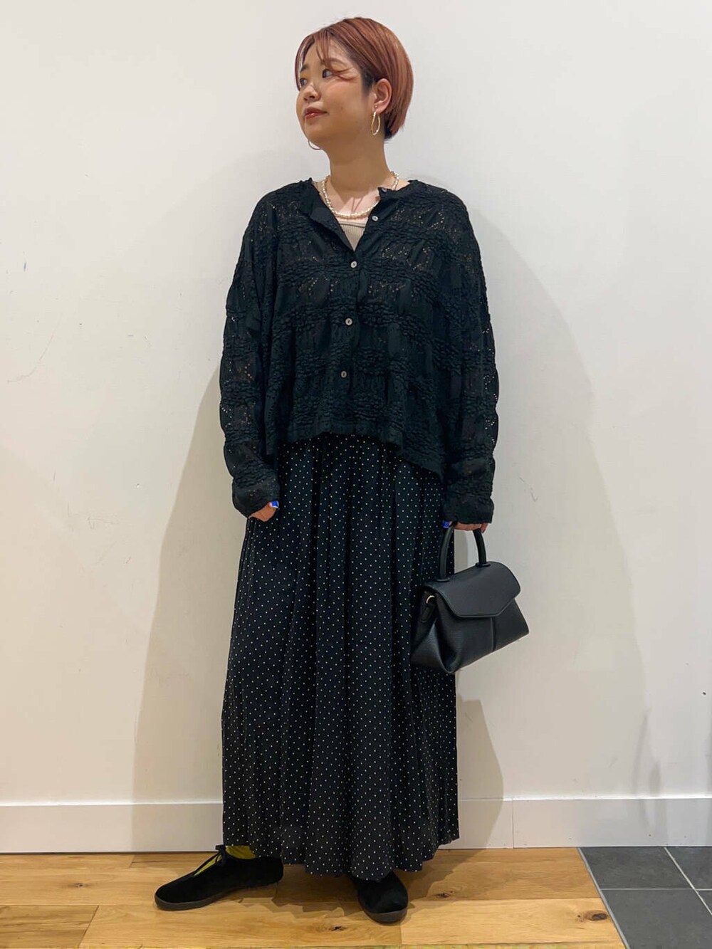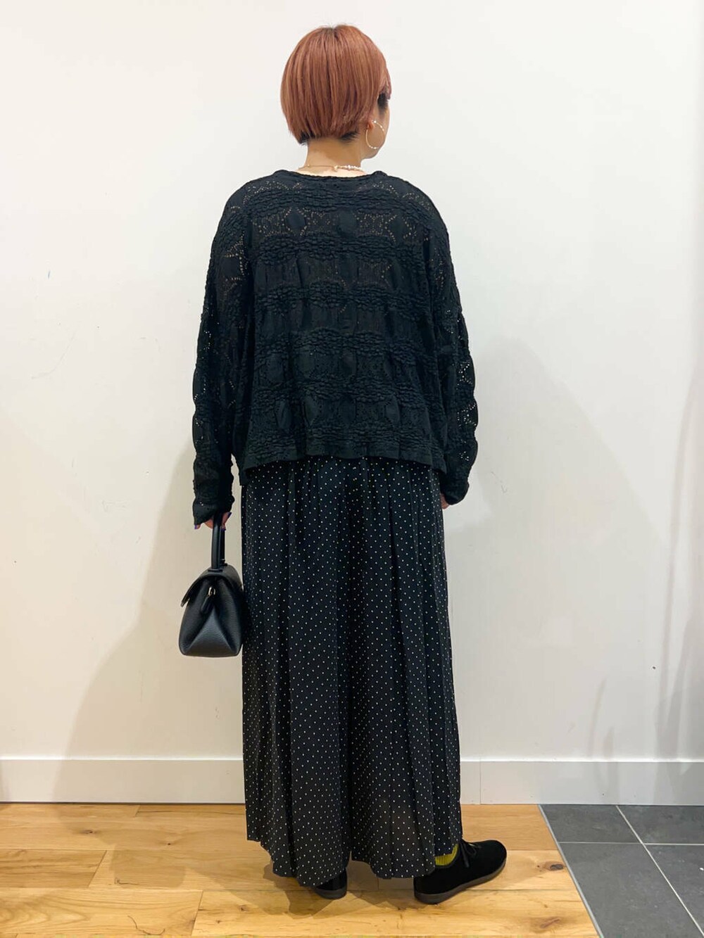 かぐれのパンツと合わせた大人ブラックコーデ。