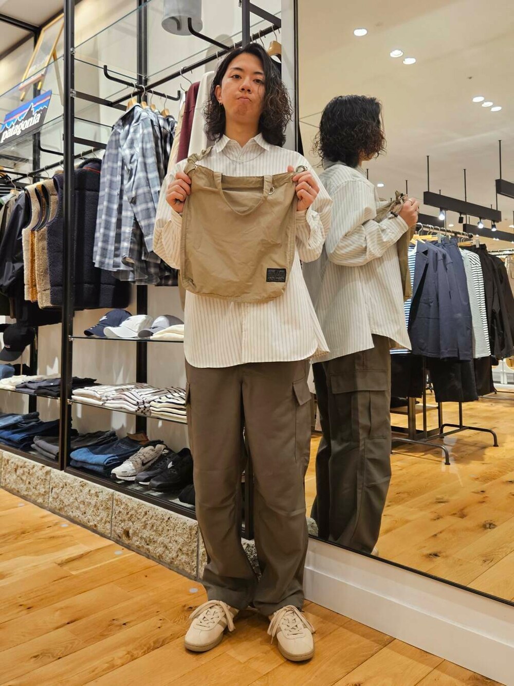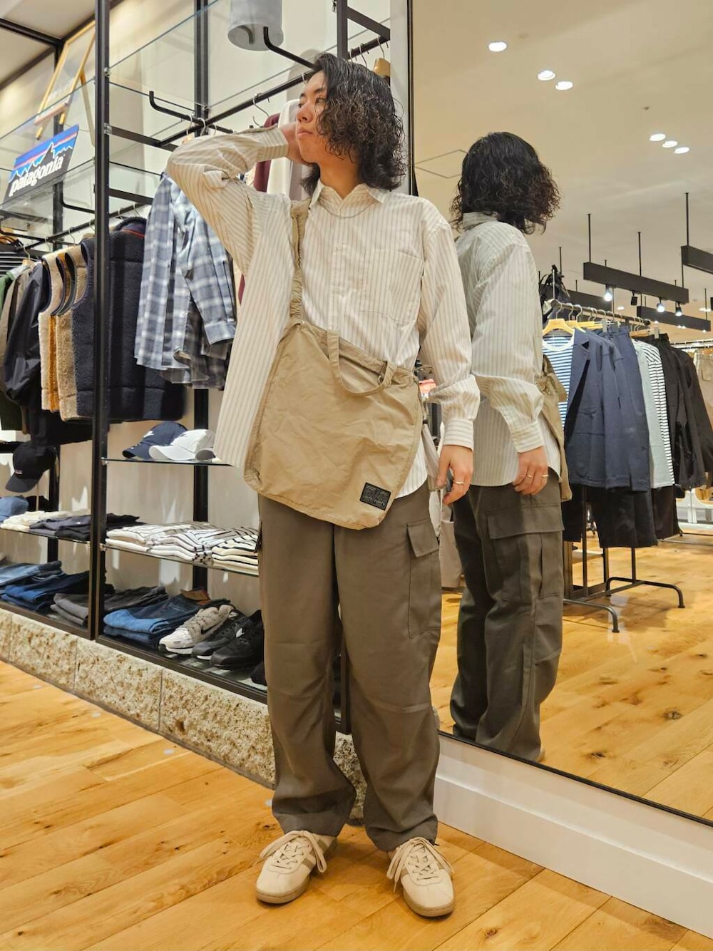 このカーゴは光沢みや、ハリ感が程よく、シルエットもワイドすぎないのできれいめあわせにぴったりですよ!