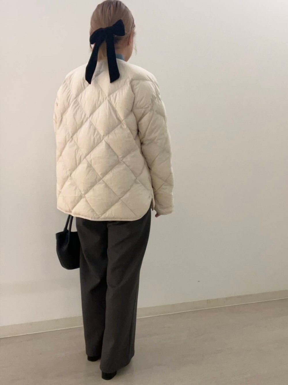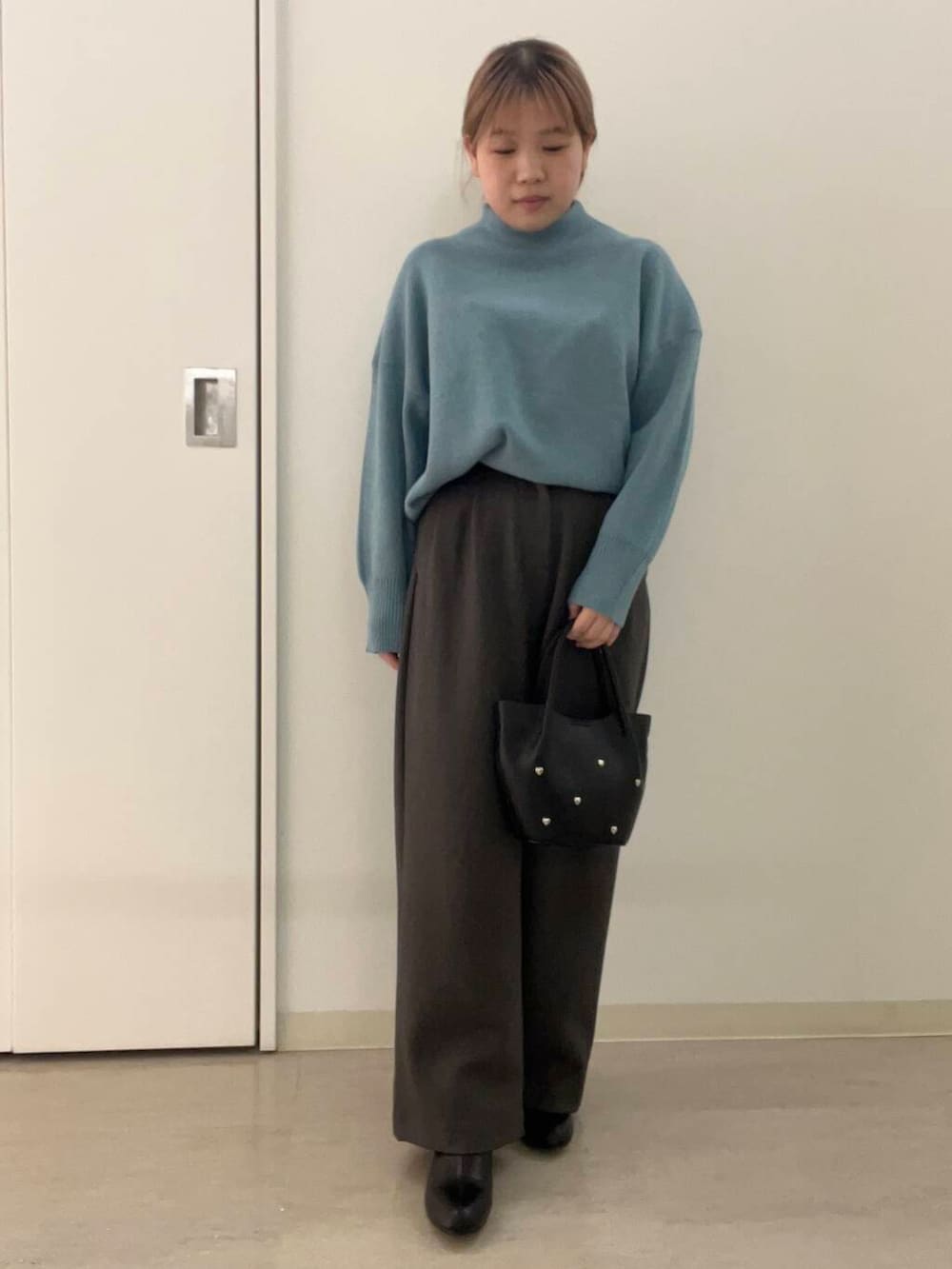 大人っぽいスラックスと冬らしい寒色系の爽やかなブルーを差し色にコーデを組んでみました❄️