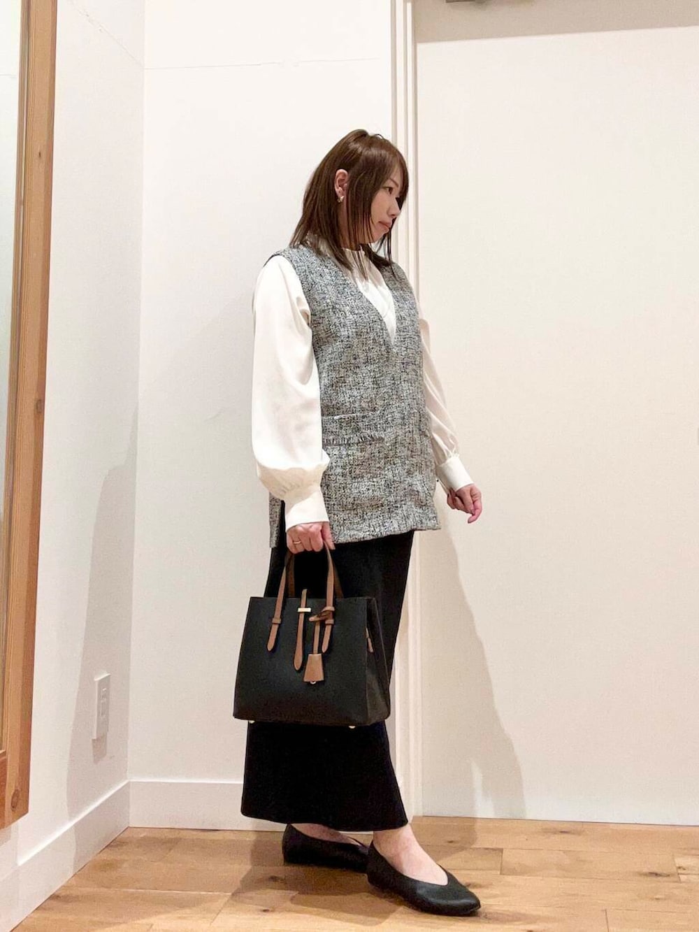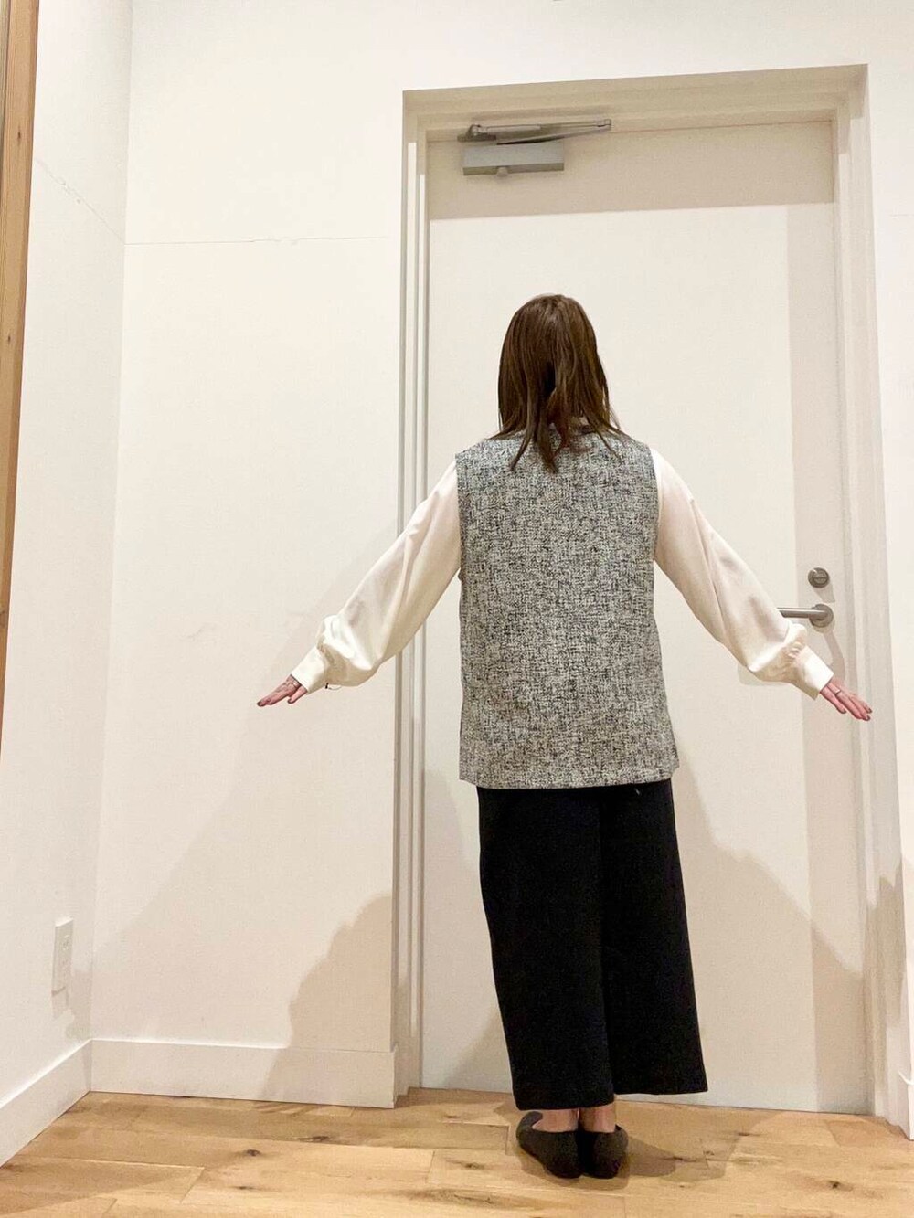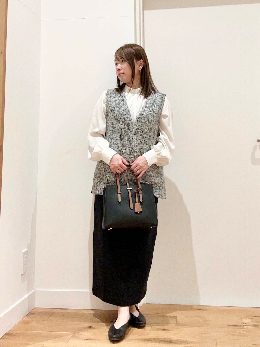 ツイードベストの深めのVネックが顔周りをスッキリと綺麗に見せてくれます。