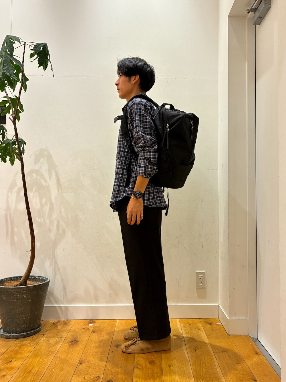 チェックシャツにスラックスとシンプルなコーデになっていますが、腕を捲ってアクセサリーを出してみたり、暗くなりすぎない様に靴はブラウンにしてみました!又、チェックシャツの上に暗めなジャケットを着ても似合うと思います!