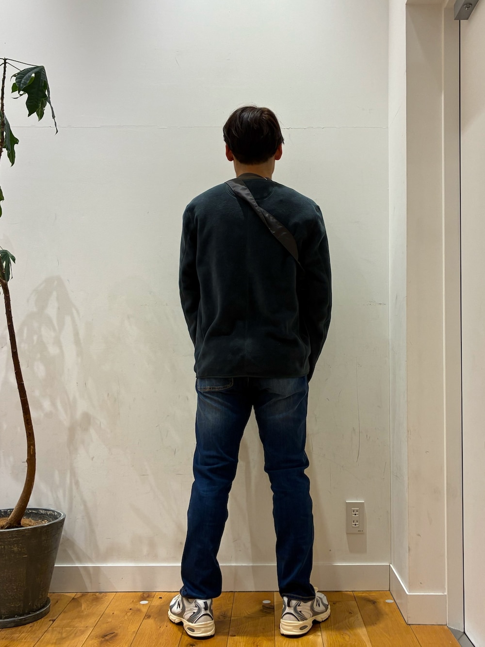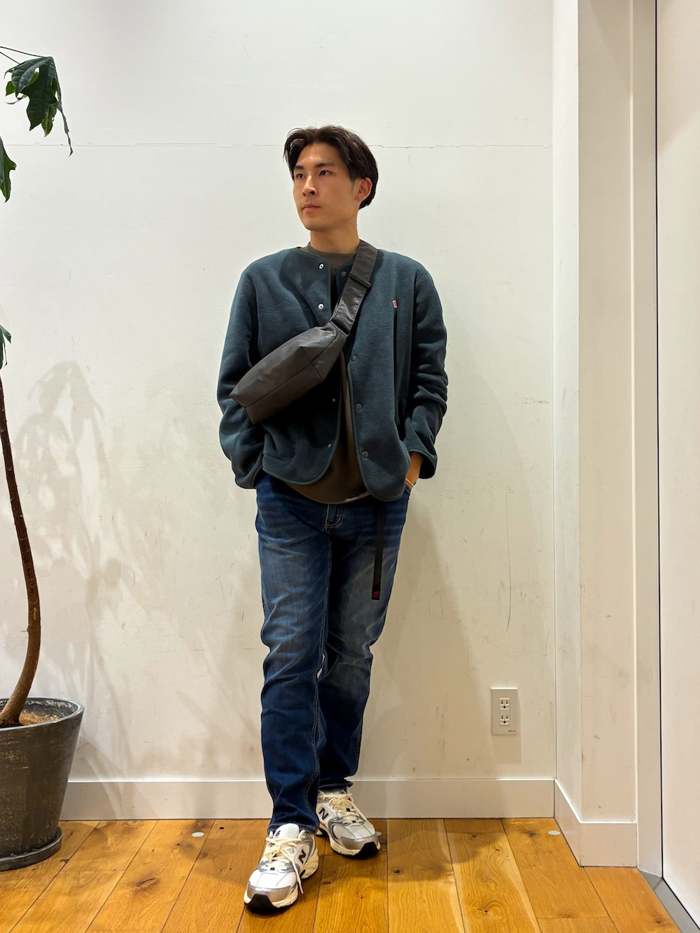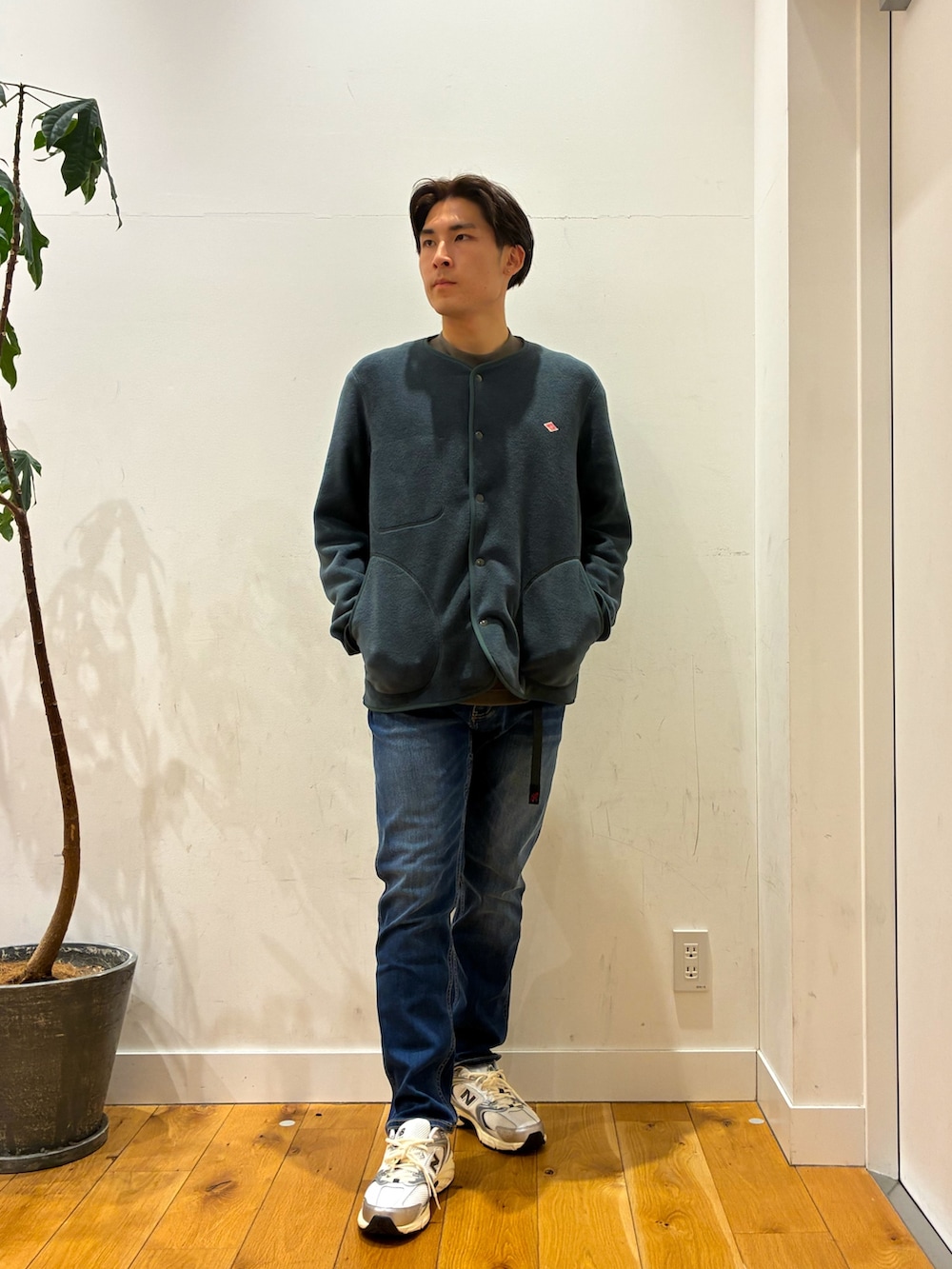 ダントンのジャケットはふわふわしていて肌触りが良くその中にラコステの暗めなブラウンを着てみました!1番小さいサイズですがゆったりと着ることが出来ます!そこにグラミチのジーンズを合わせることでスラットした見栄えになったり、大人な雰囲気が出たりして落ち着いたコーデになります!