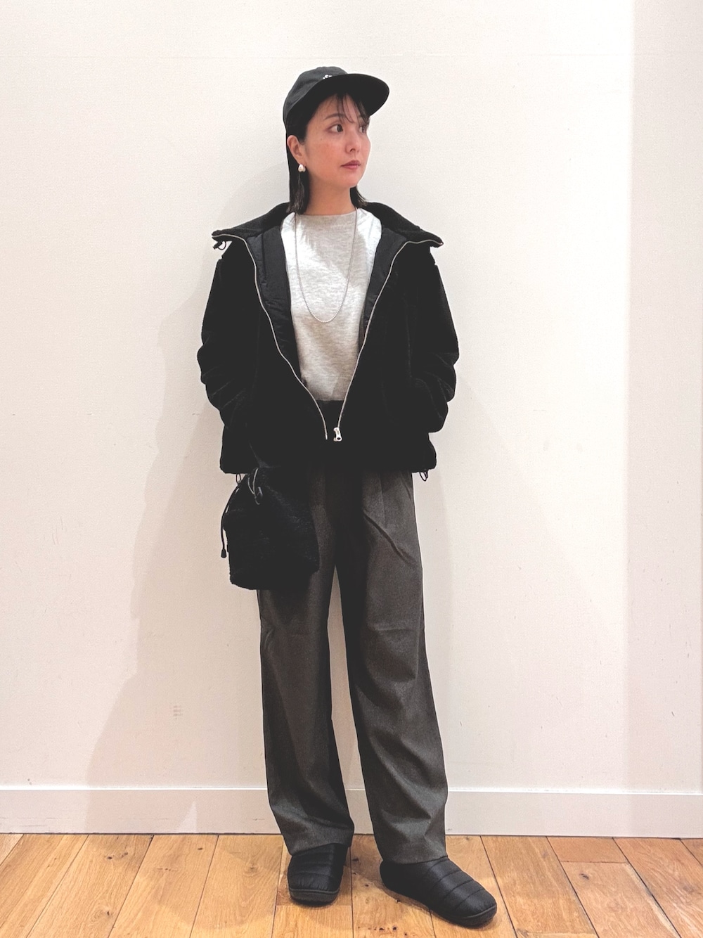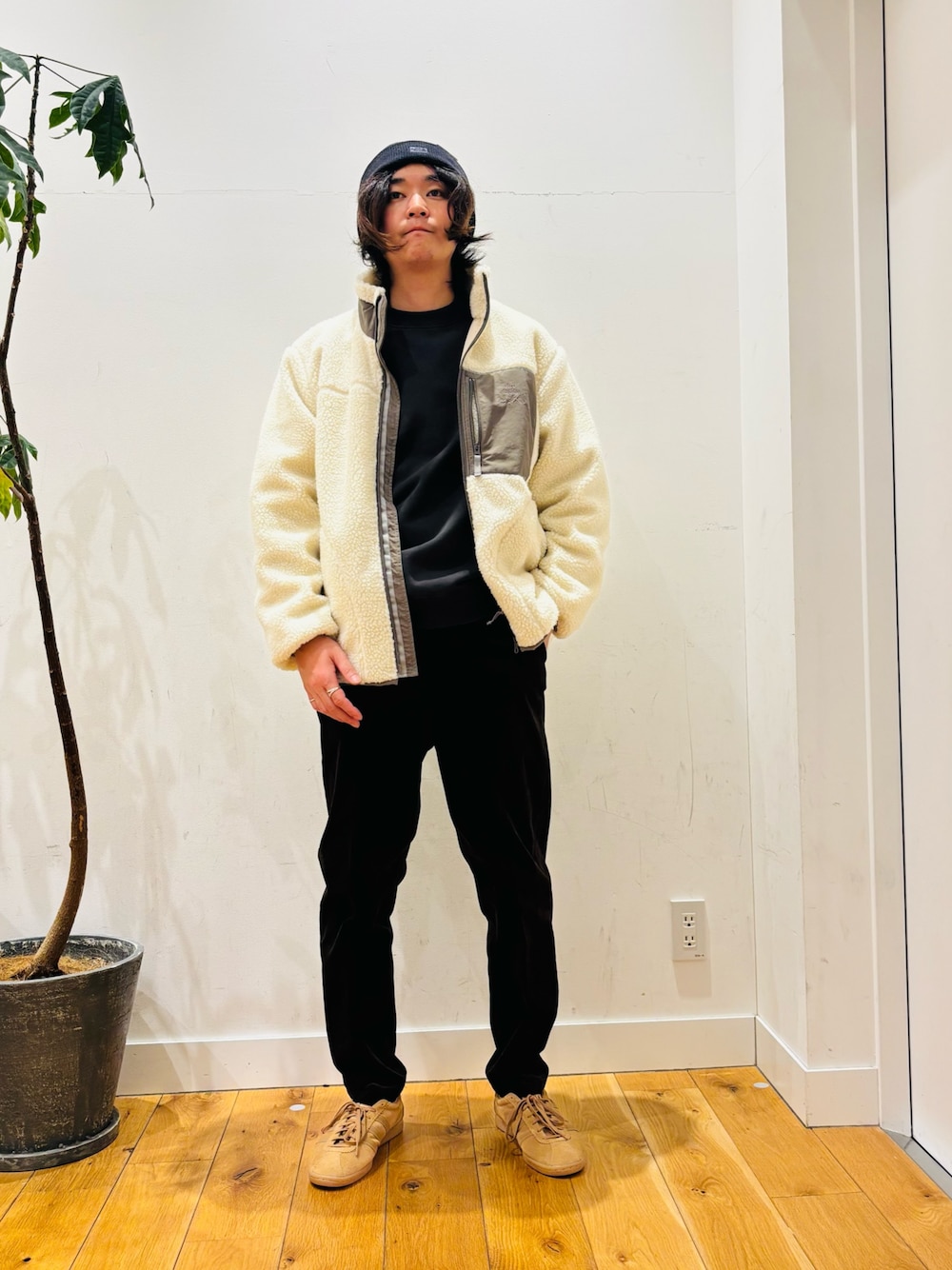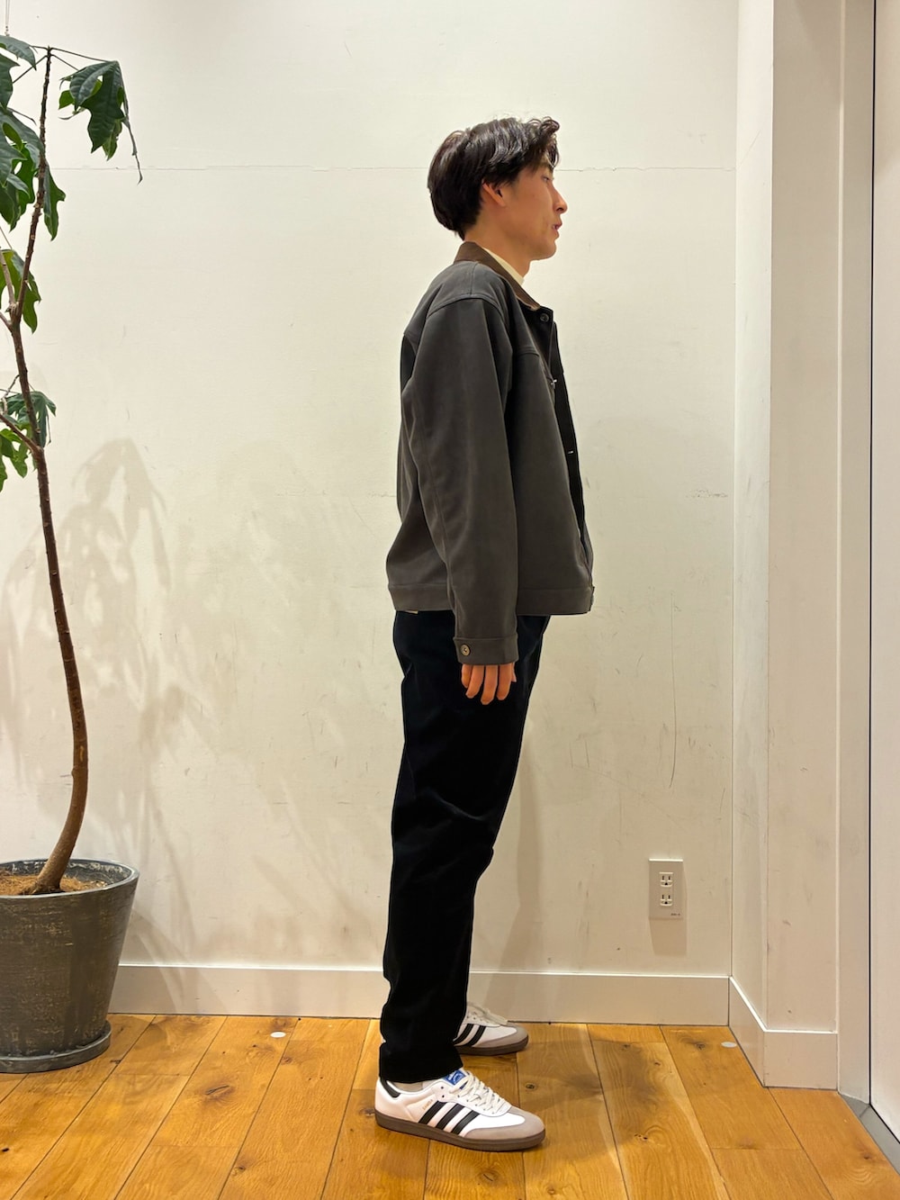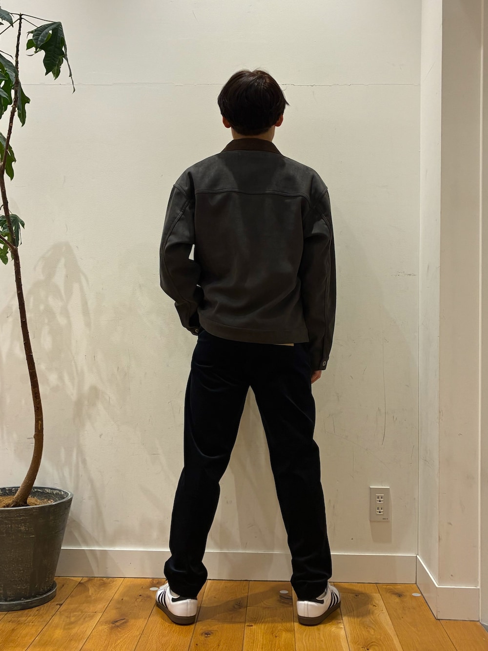 スウェードの様な触り心地のジャケットに暗め物のが多い為、シワや毛玉になりにくい生地を使用している200日ニットを着ています!ジャケットの襟がコーデュロイになっている為、パンツもコーデュロイパンツにしてみました!