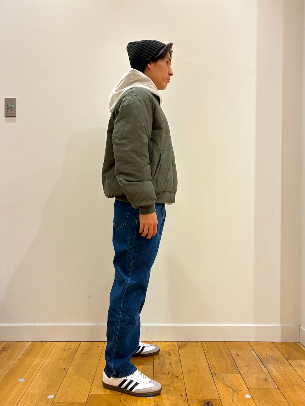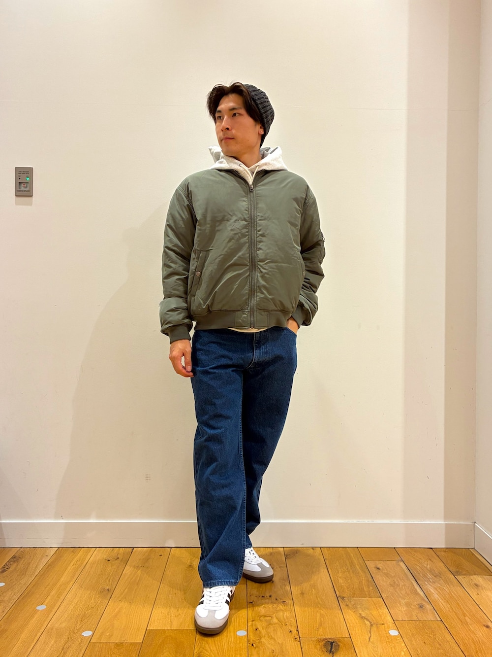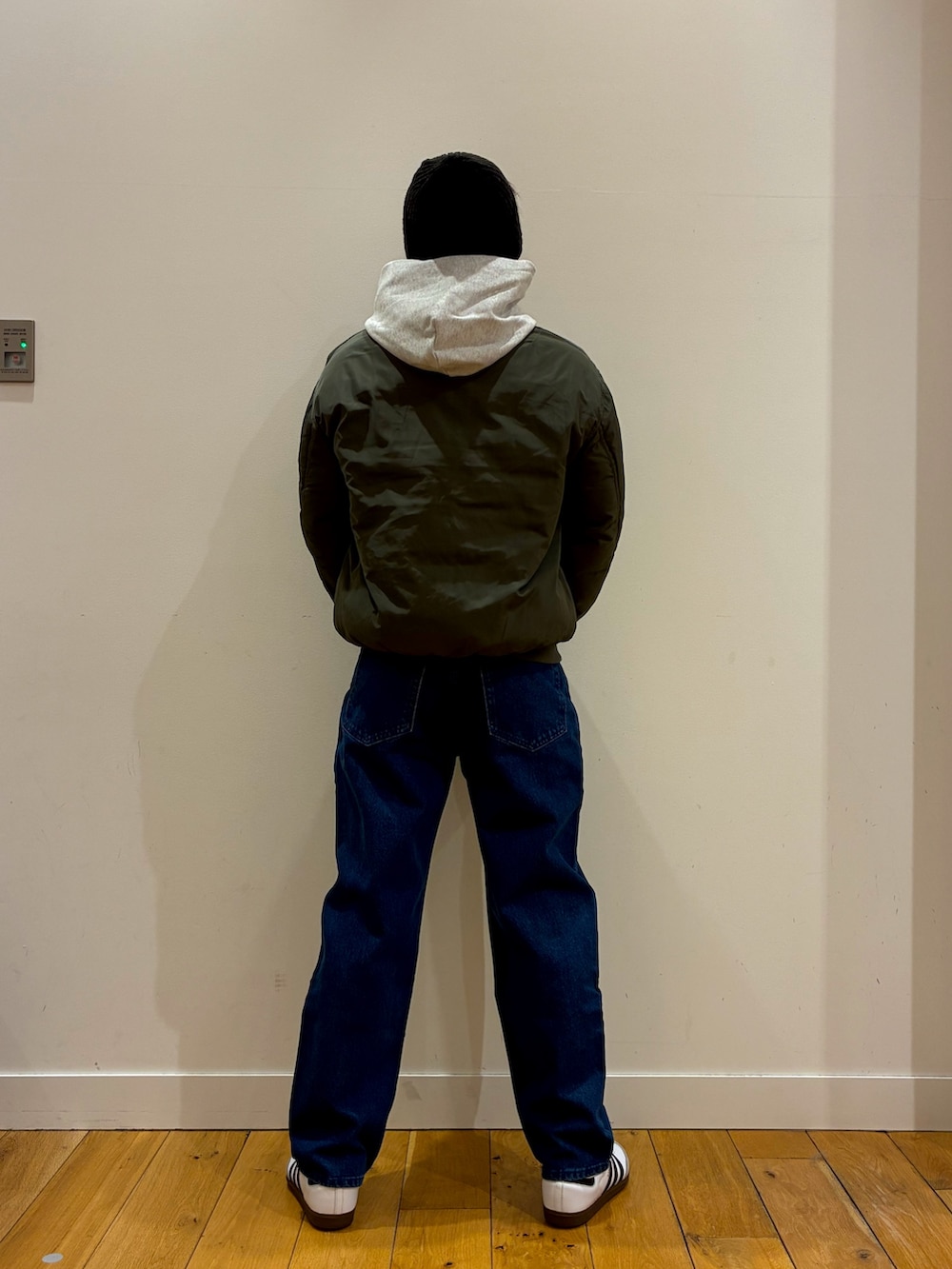 ゆったりとしたMA-1にパーカーを着てジーンズを履いてみました!MA-1は機能性がよくとても暖かく過ごすことが出来ます!又、フードを出す事によりまた雰囲気が違うと思います!