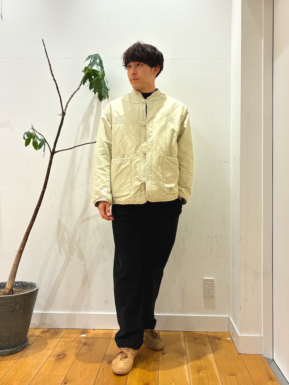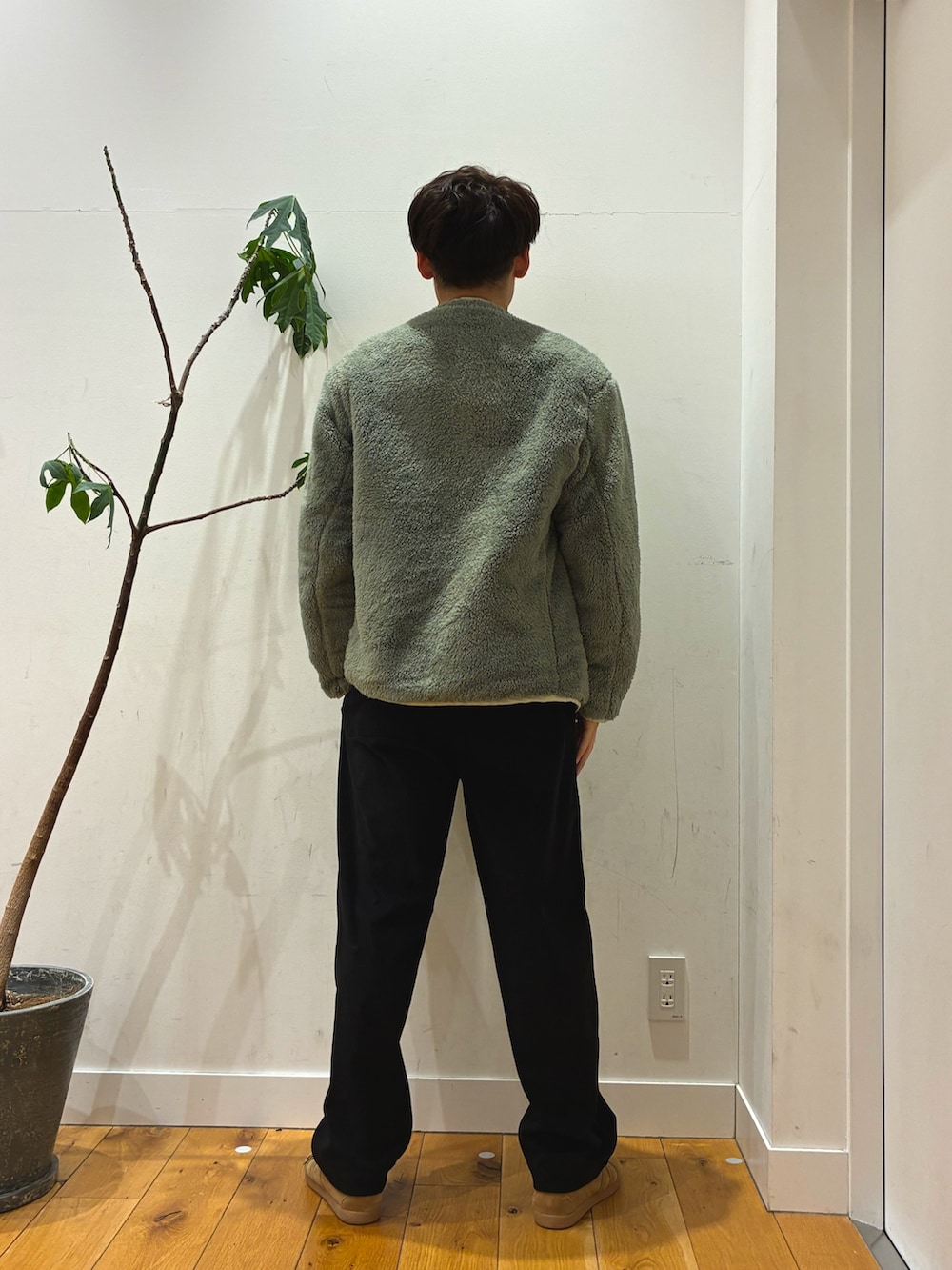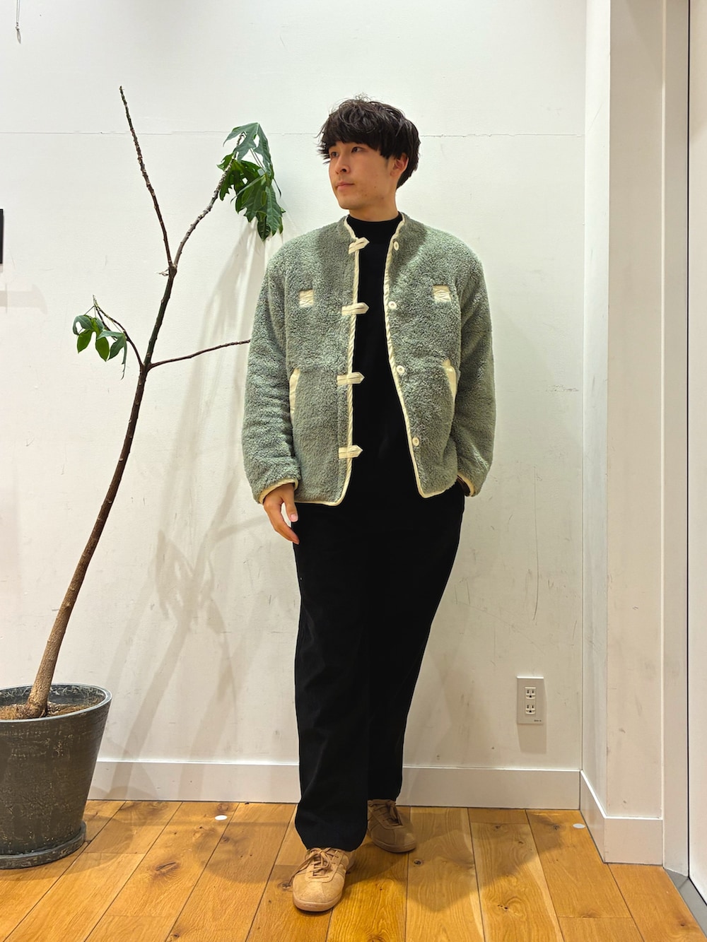 アーミーツイルというゆったりとして可愛いステッチがあるジャケットに中はモックネックニットパンツはニットのカラーに合わせた黒のコーデュロイパンツになっています!