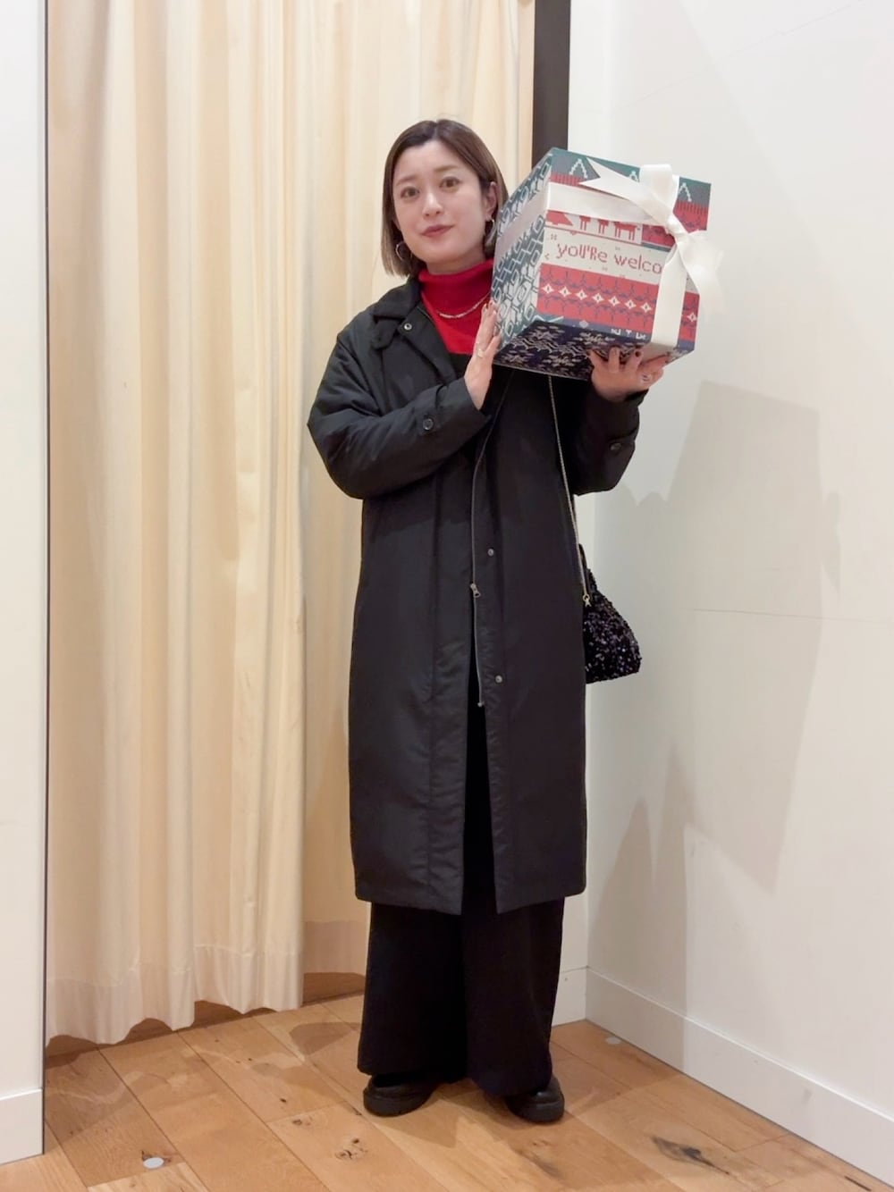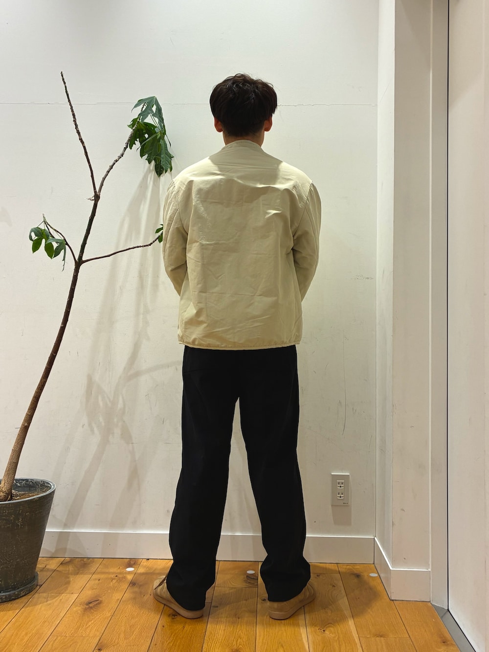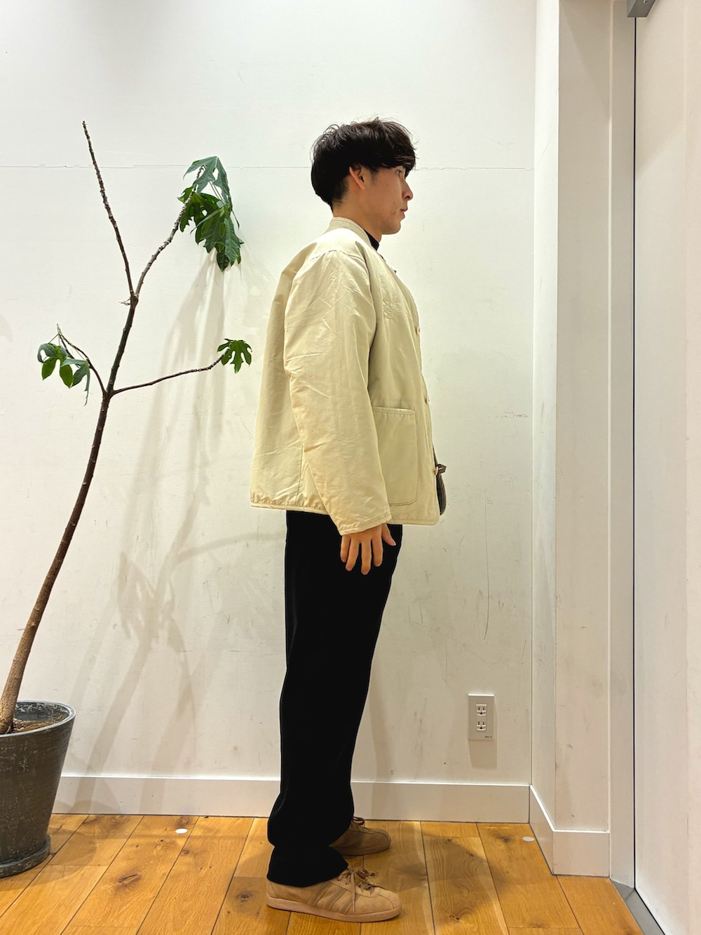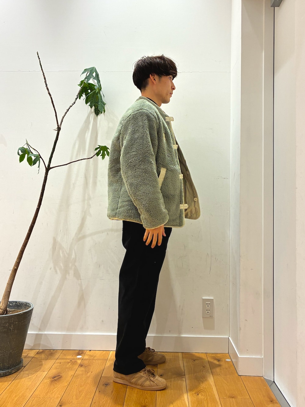 アーミーツイルというゆったりとして可愛いステッチがあるジャケットに中はモックネックニットパンツはニットのカラーに合わせた黒のコーデュロイパンツになっています!
