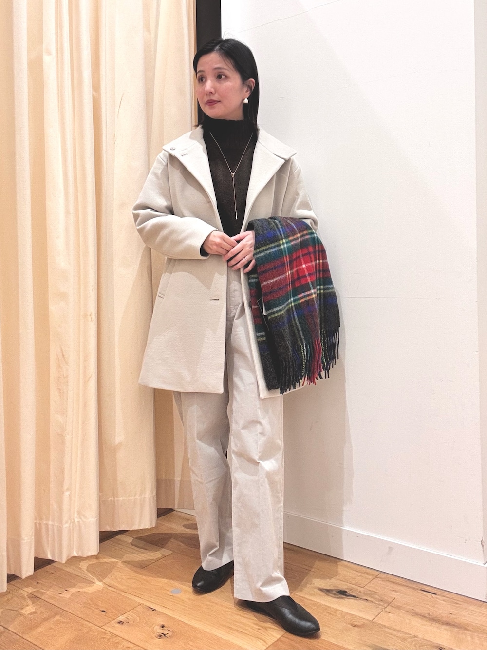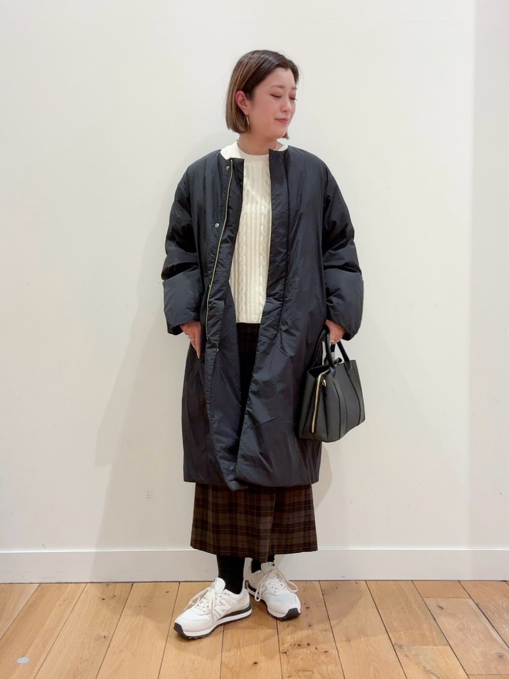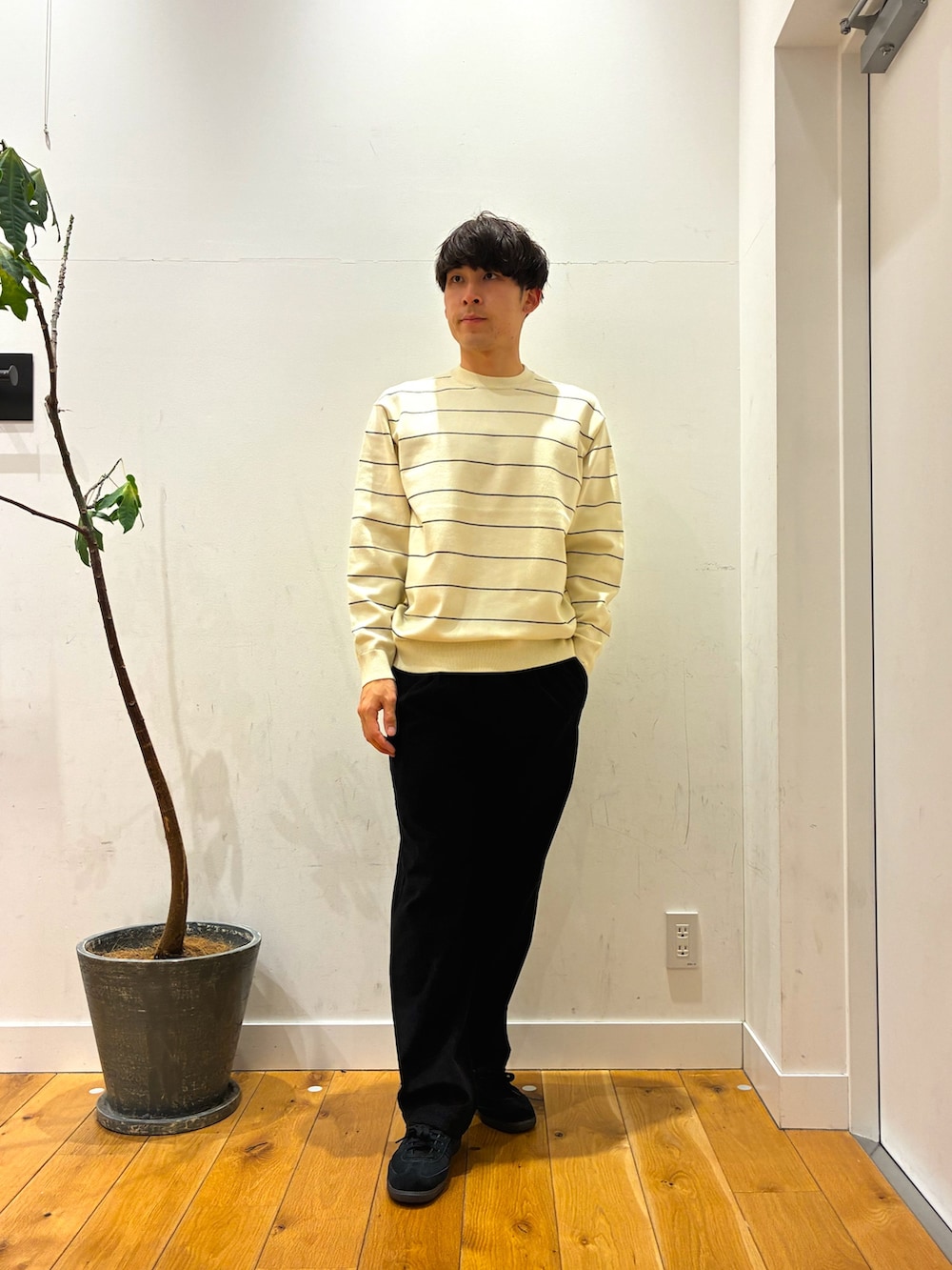 ゆったりとしたダウンに200日使っていても寄れたり、毛玉になりにくい生地を使っているボーダーニットを着ています!触り心地がとても良いです!パンツはゆったりしている暖かいです!