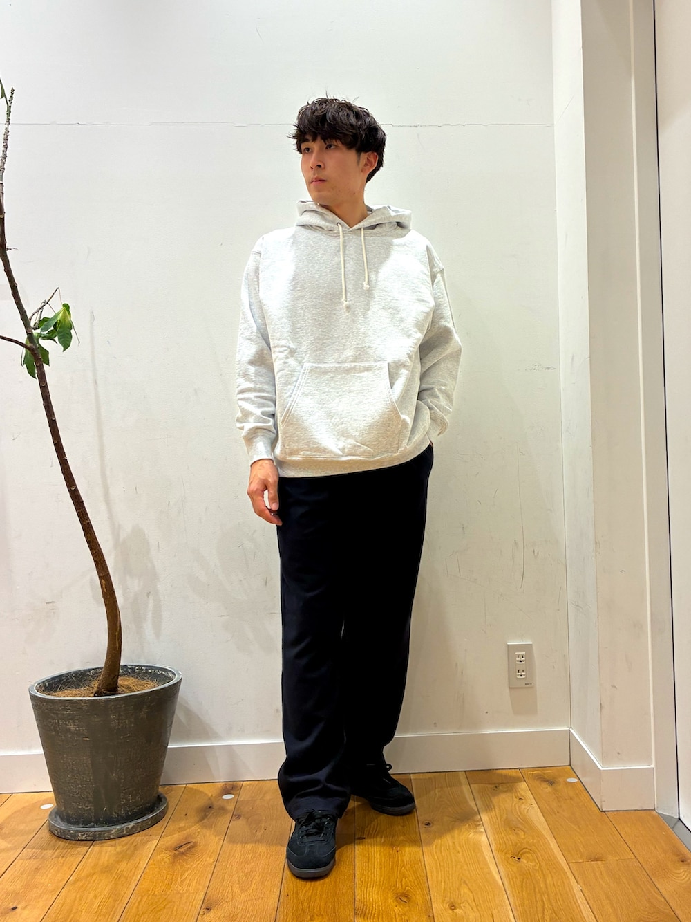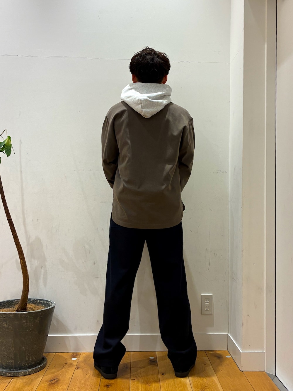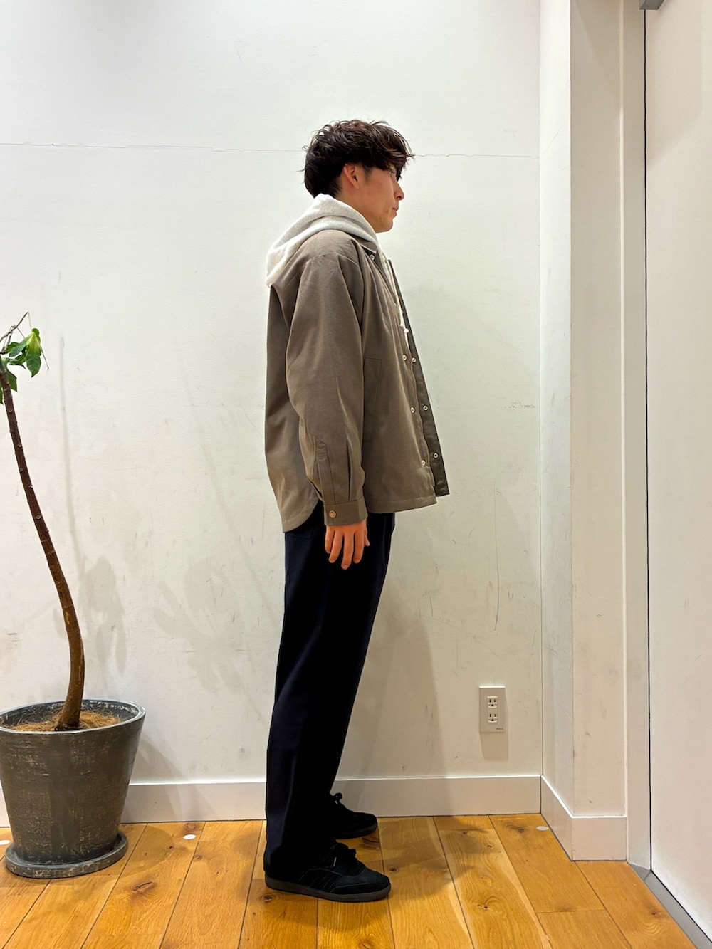 ダントンのコーチジャケットにパーカーを着ています!パンツはゆったりとしたコーデュロイパンツになっています!
