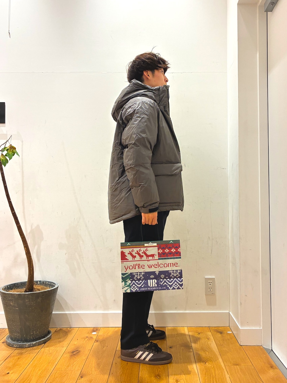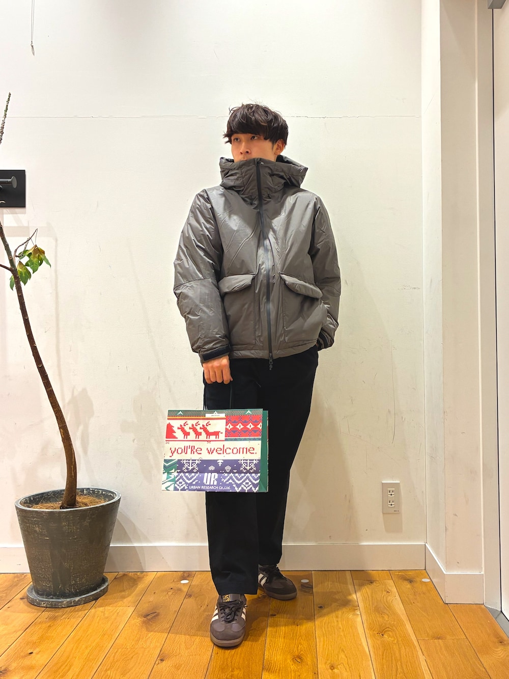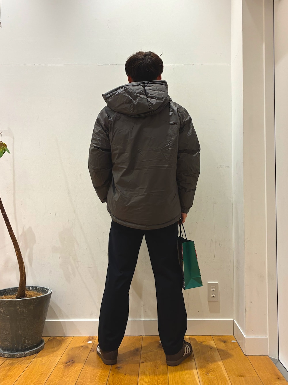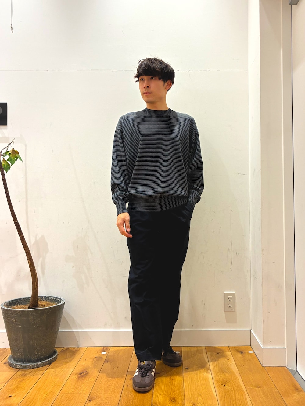 ポケットが特徴的なNANGAの別注ダウンに中はストライプが入って腰と腕がキュッとなっているゆったりとしたニットを着ています!パンツはシンプルに黒にしました!