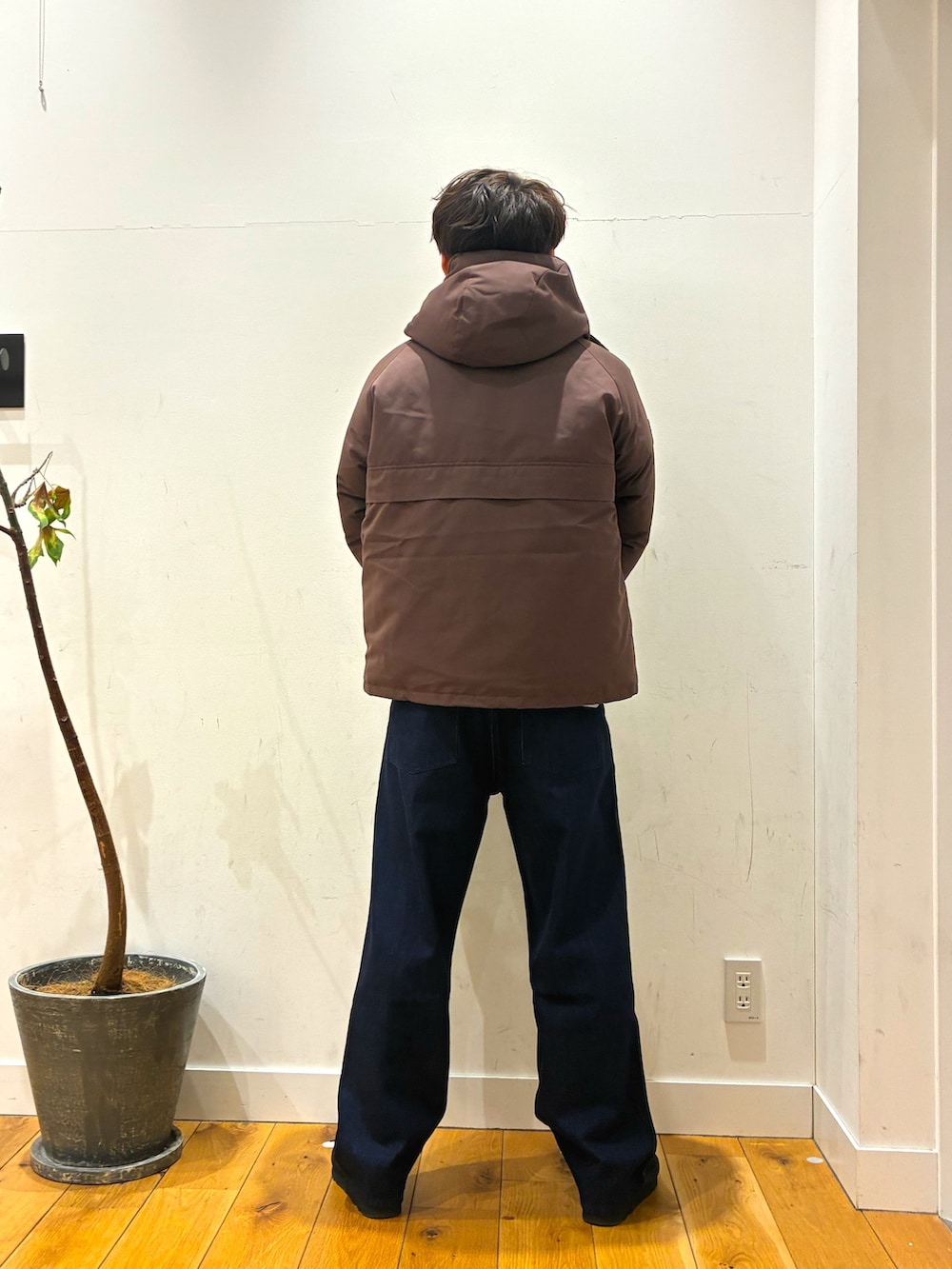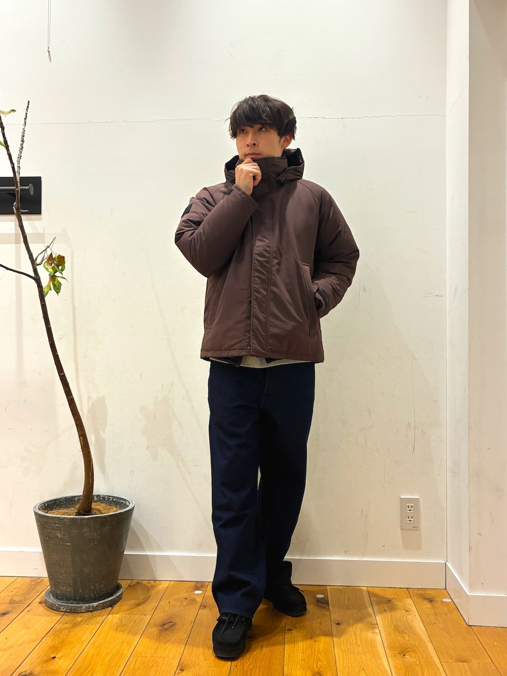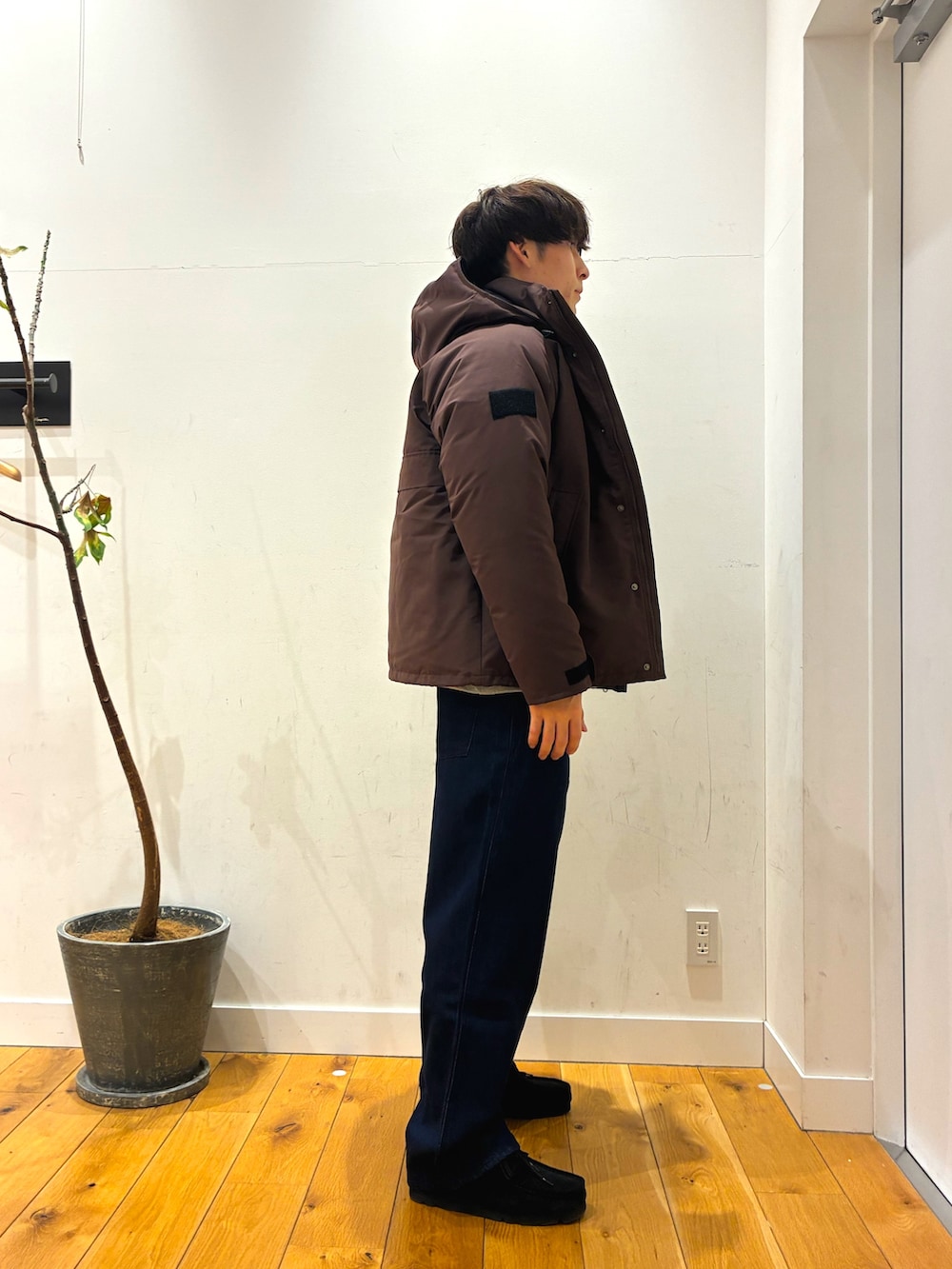 トレーナーは暑すぎないように裏起毛ではなくタオル生地になっています。その上にダントンの丈が短くとても軽いインナーダウンをきて更にその上から背中に2リットルくらい入るポケットがあったり右腕にはマジックテープがついておりいろんなものがつけられるようになっているギミックが面白いダウンを着ています!パンツは落ち着いた雰囲気になるよう暗めなジーパンにしています!