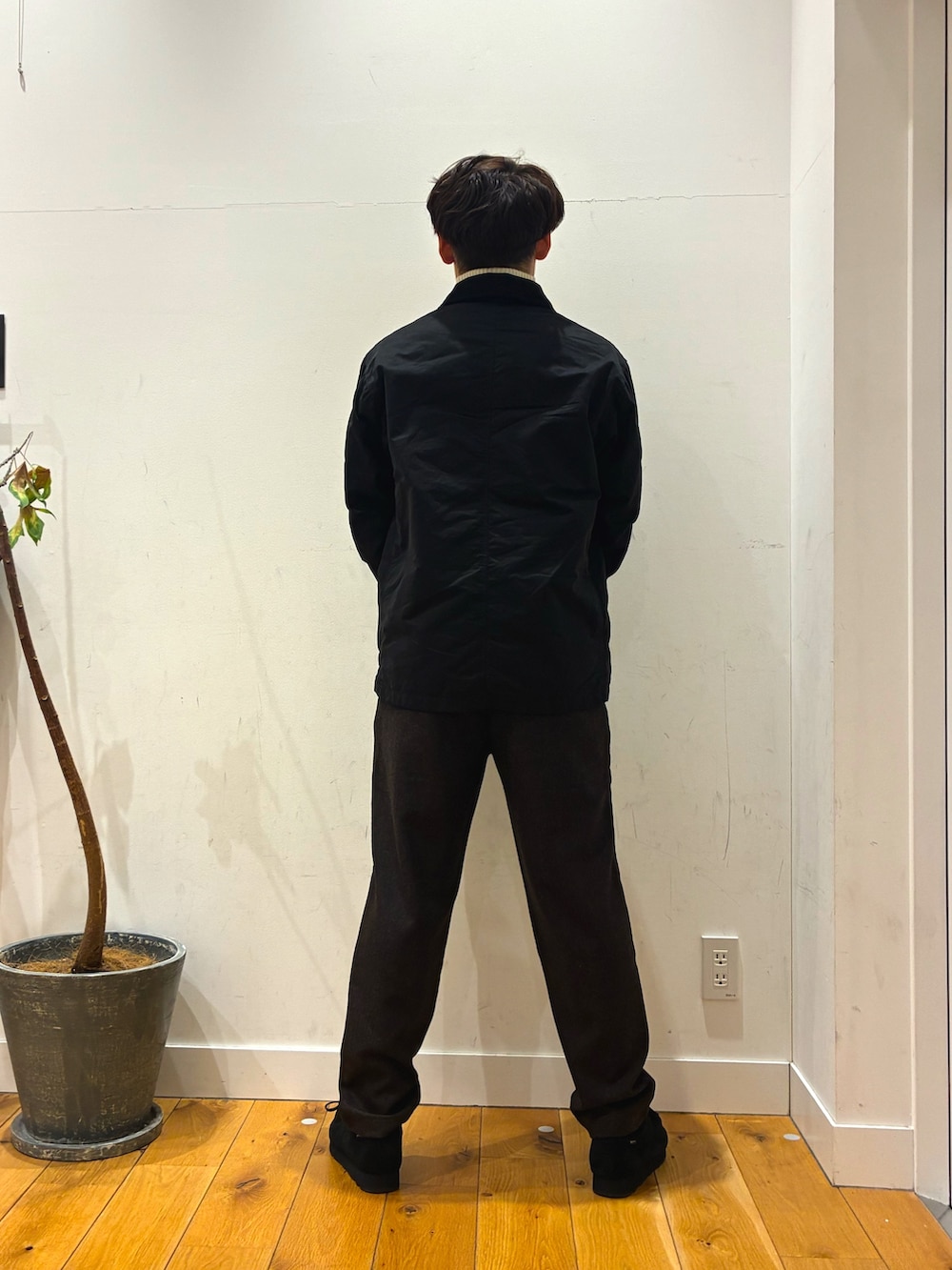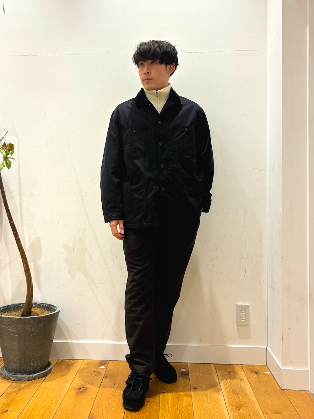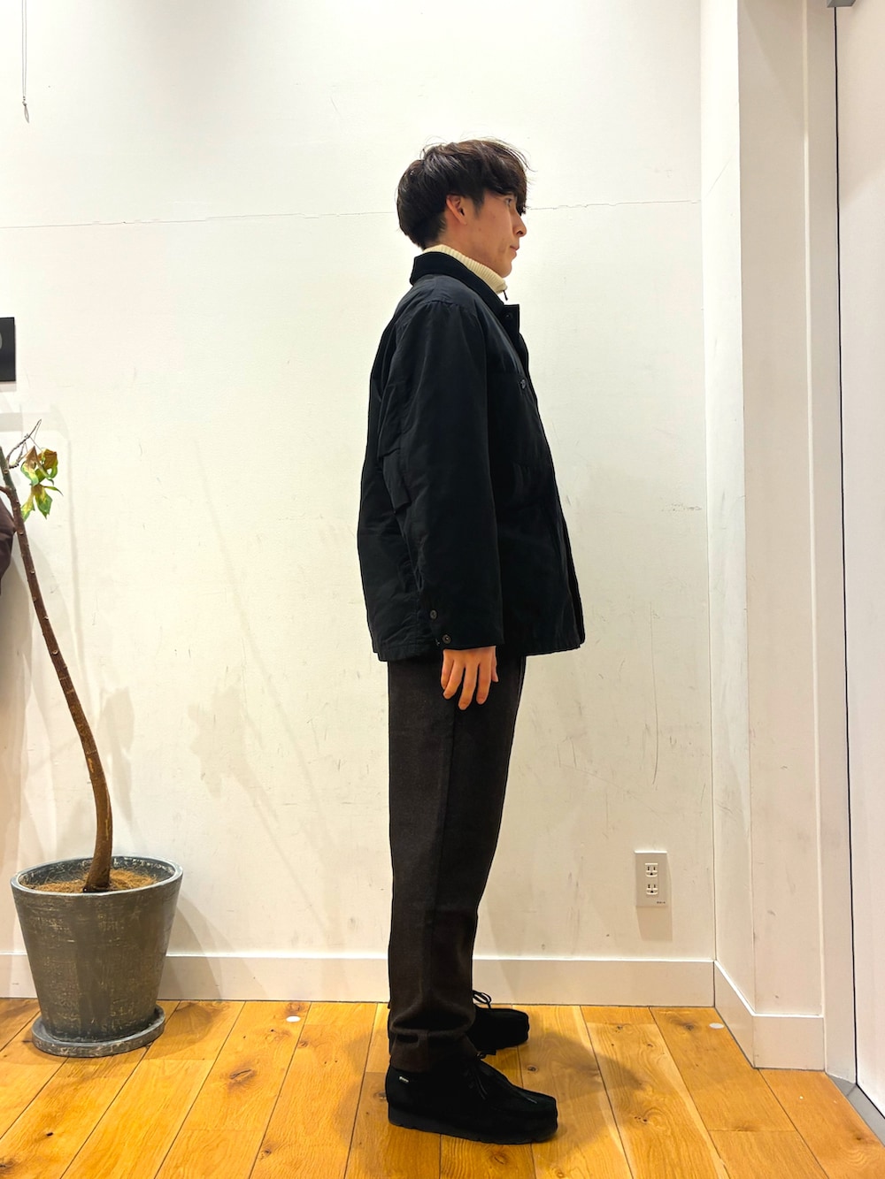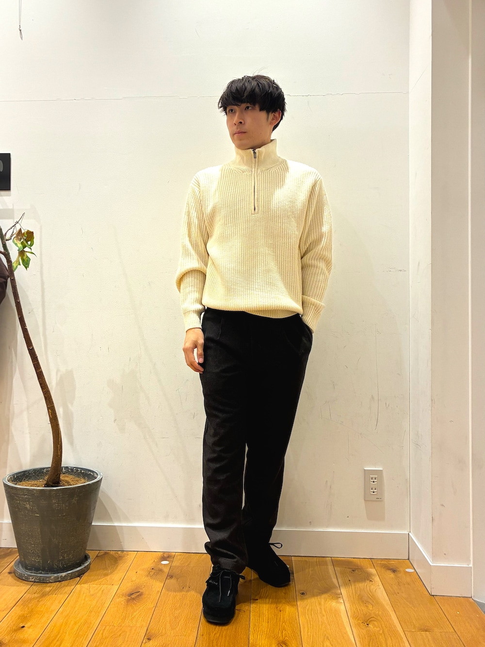 首元が暖かいハーフジップのニットに襟元がコーデュロイになっているジャケットを着ています!下はブラウンのパンツでとても暖かく過ごす事が出来ます!
