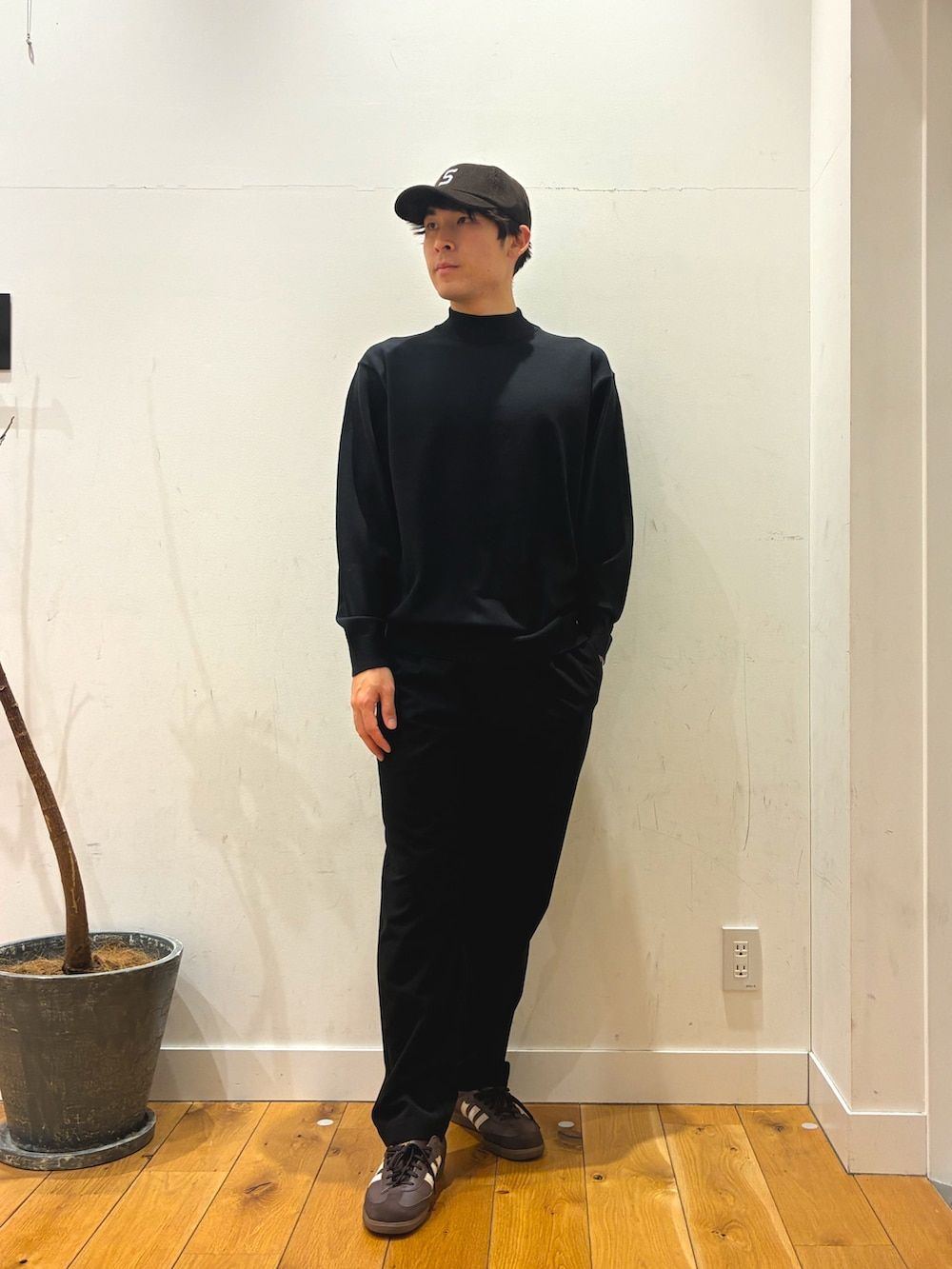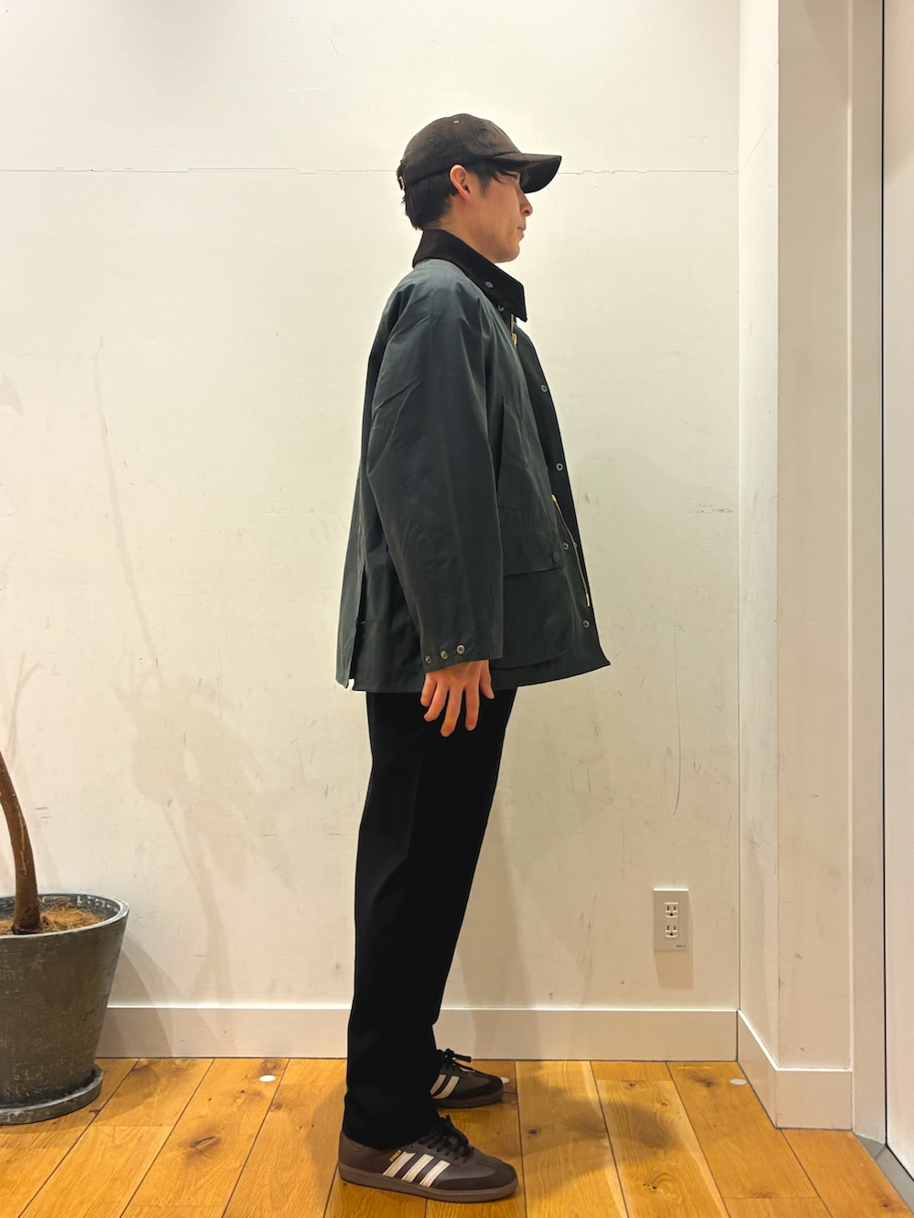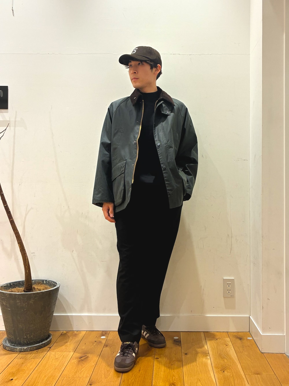 200日間来ていても寄れたり毛玉になりにくい生地を使ったモックネックニットにBarbourを着ています!下はゆったりとした起毛トラウザーになっています!