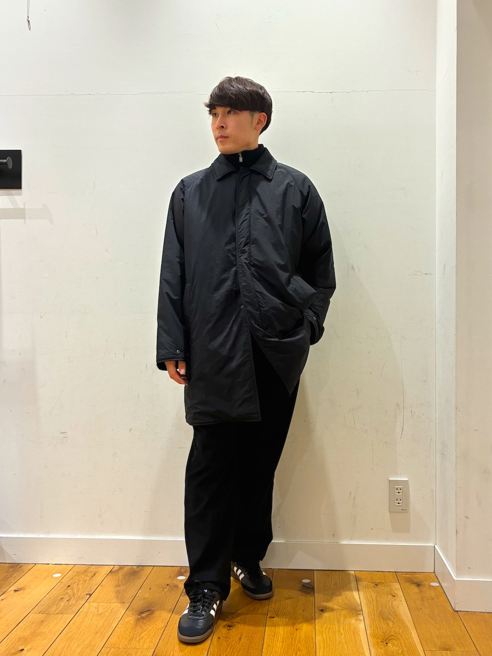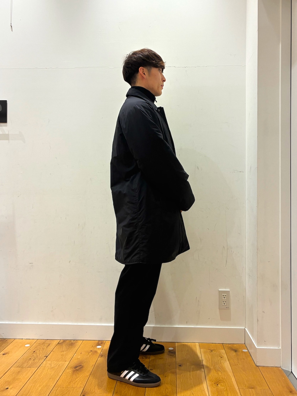 ハイネックのフワフワしたハーフジップニットにとても軽くて暖かく長さがちょうど良いコートを着ています!パンツは柔らかくゆったり目でとても歩きやすいコーデュロイパンツになっています!