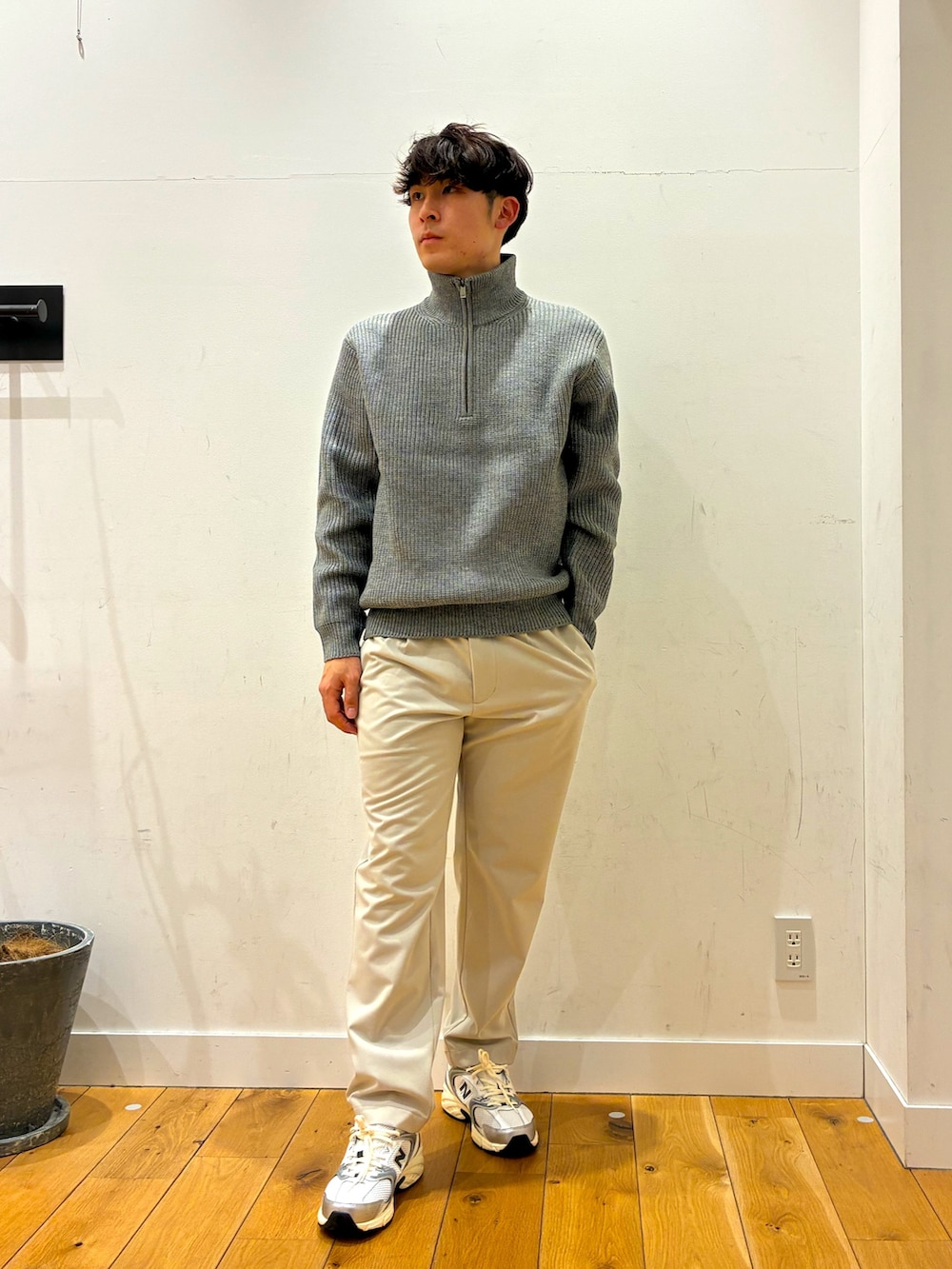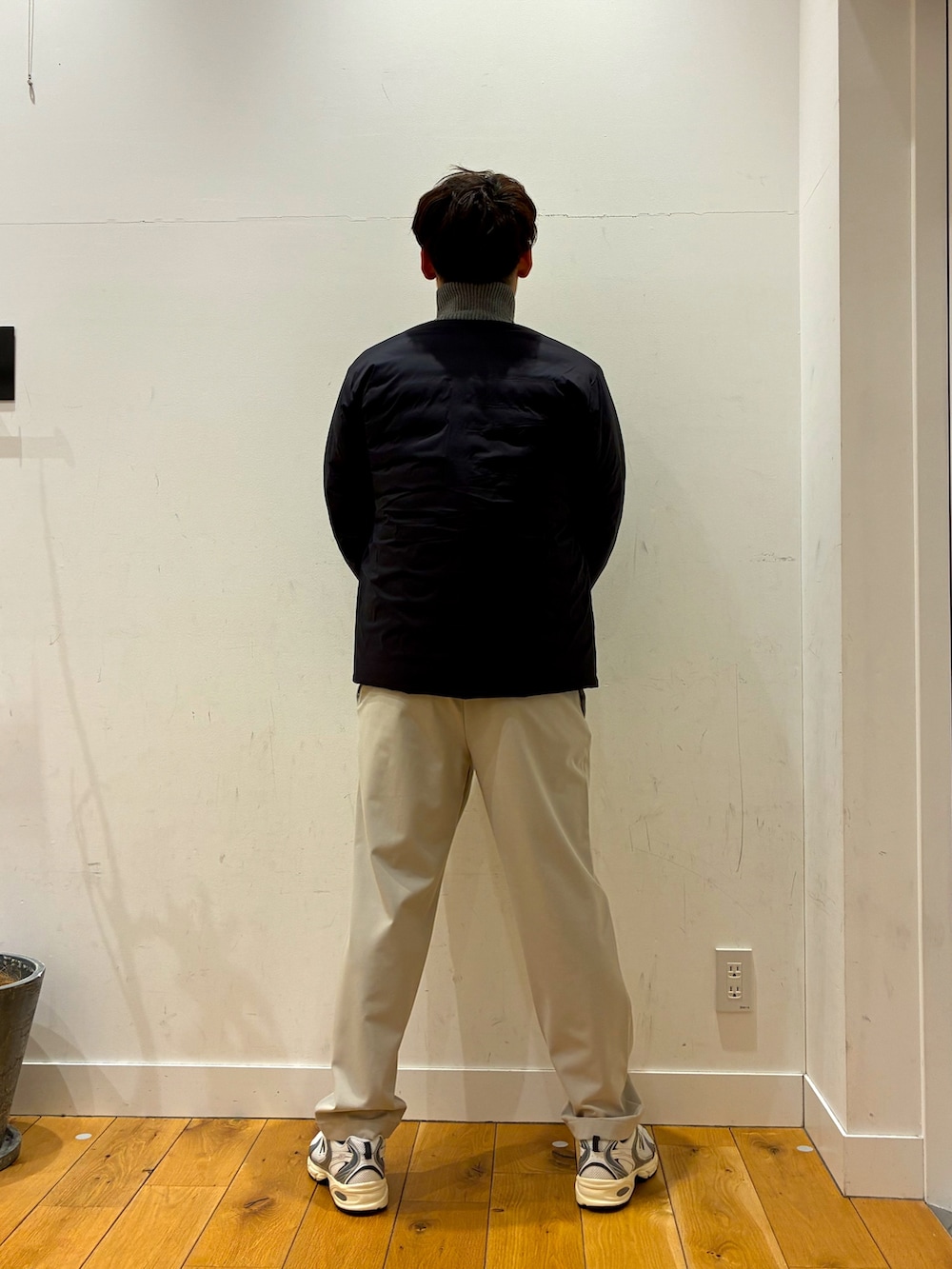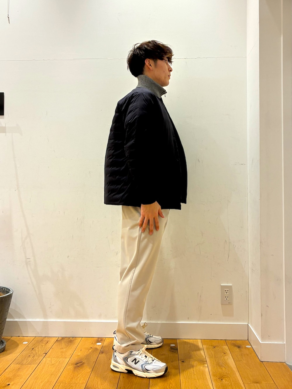 首まで暖かく肌心地の良いハイネックジップニットを中に着てナンガのリバーシブルダウンを着ています!どちらの面も色々な着こなしをする事が出来る物になっています!パンツはスラックスのような形をしていますが、生地が柔らかく履き心地がとても良いです!