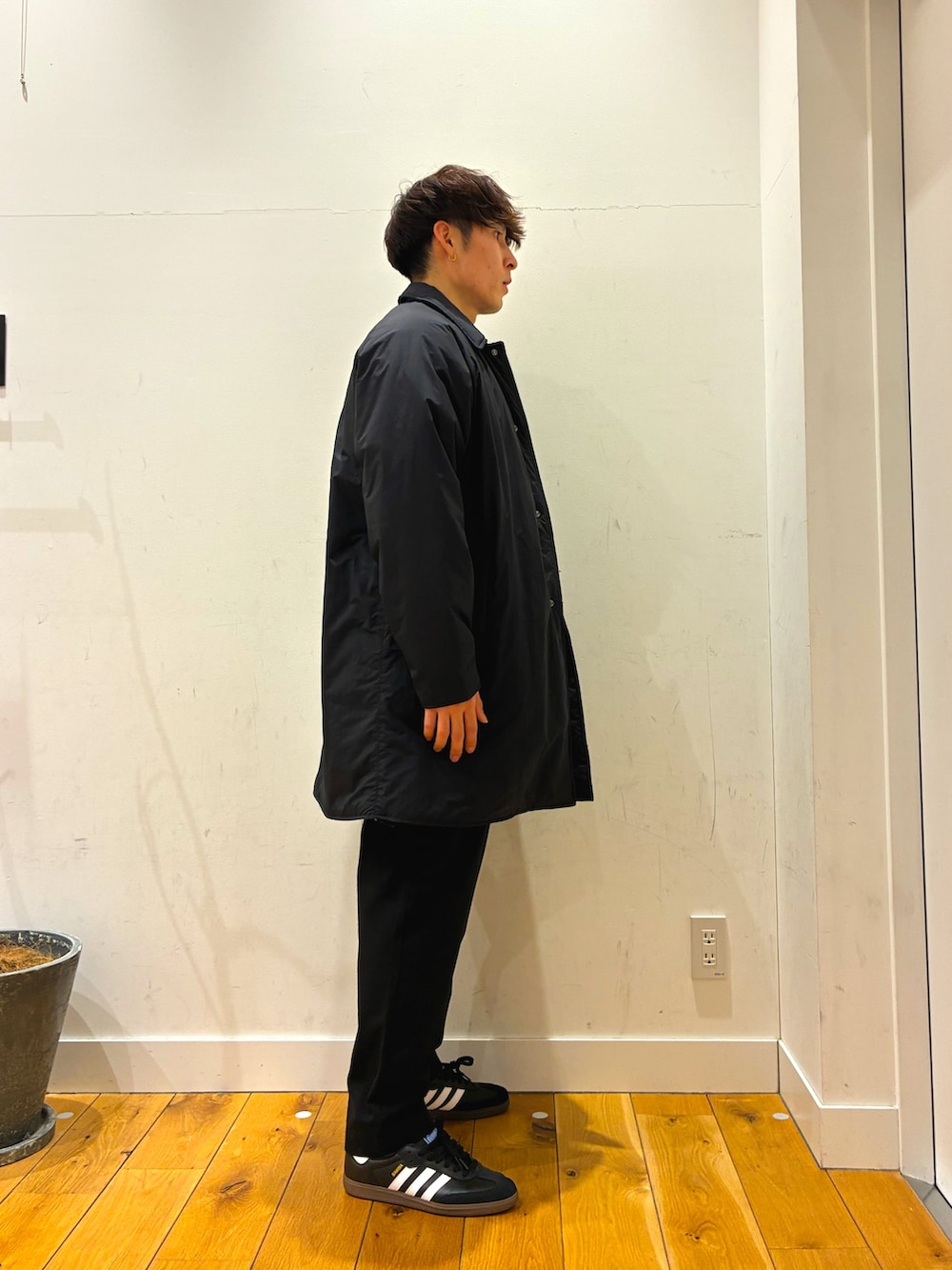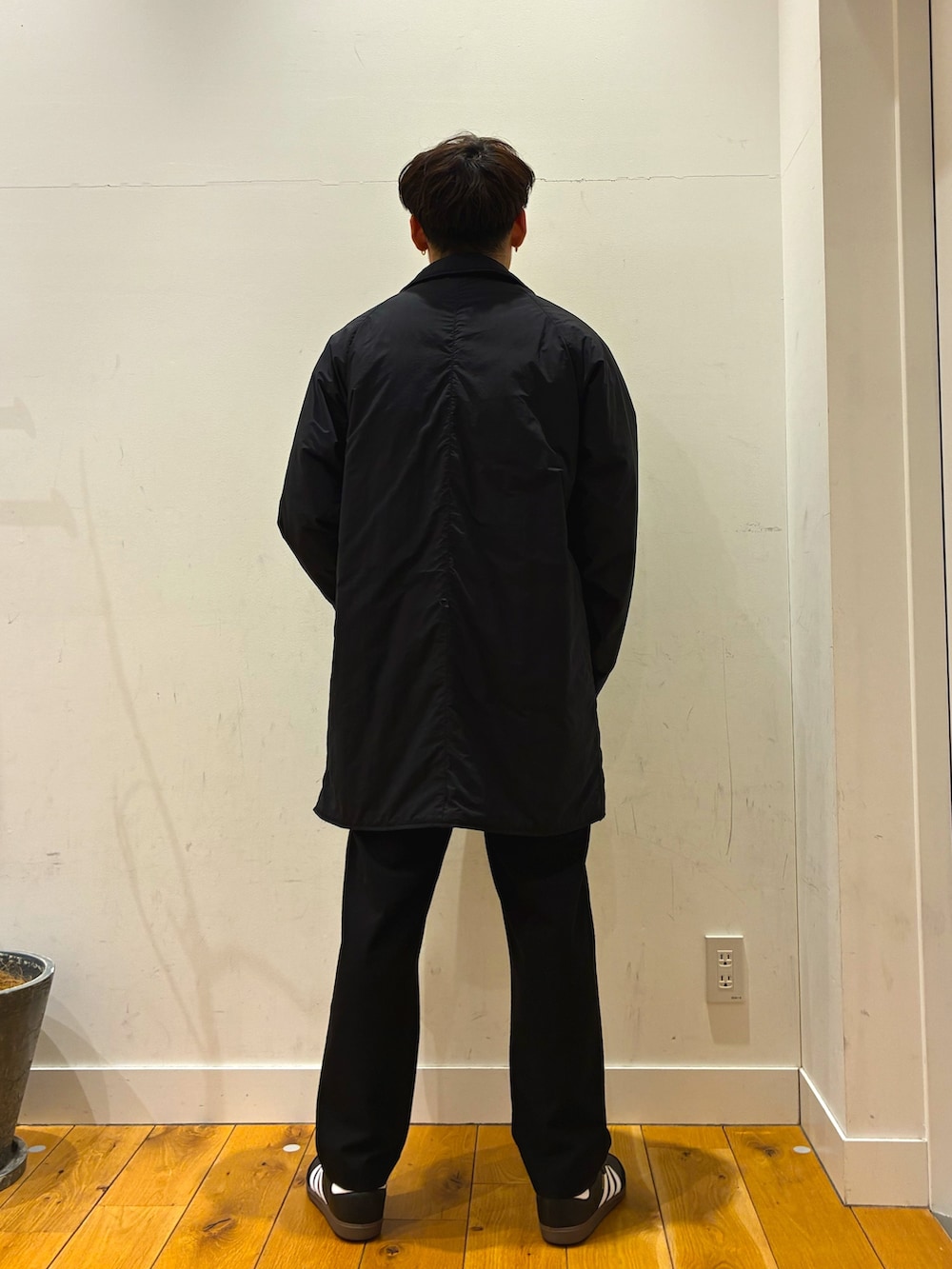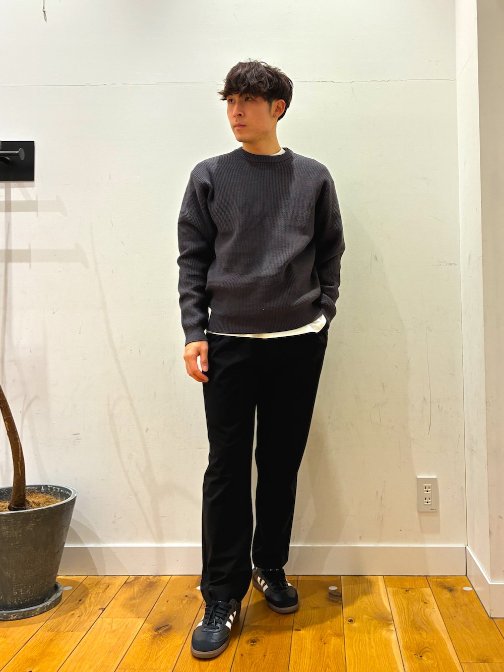 ウォッシャブル可能でとても着心地が良いワッフルニットにオリジナルコットンを使用した白のロンTをレイアードしています!その上にはポリエステル素材になっているコートを着ています!こちらはスーツの上からでも似合うと思います!このコーデに合うようにパンツは柔らかい生地を使っているスラックスのようなパンツを着用しています!