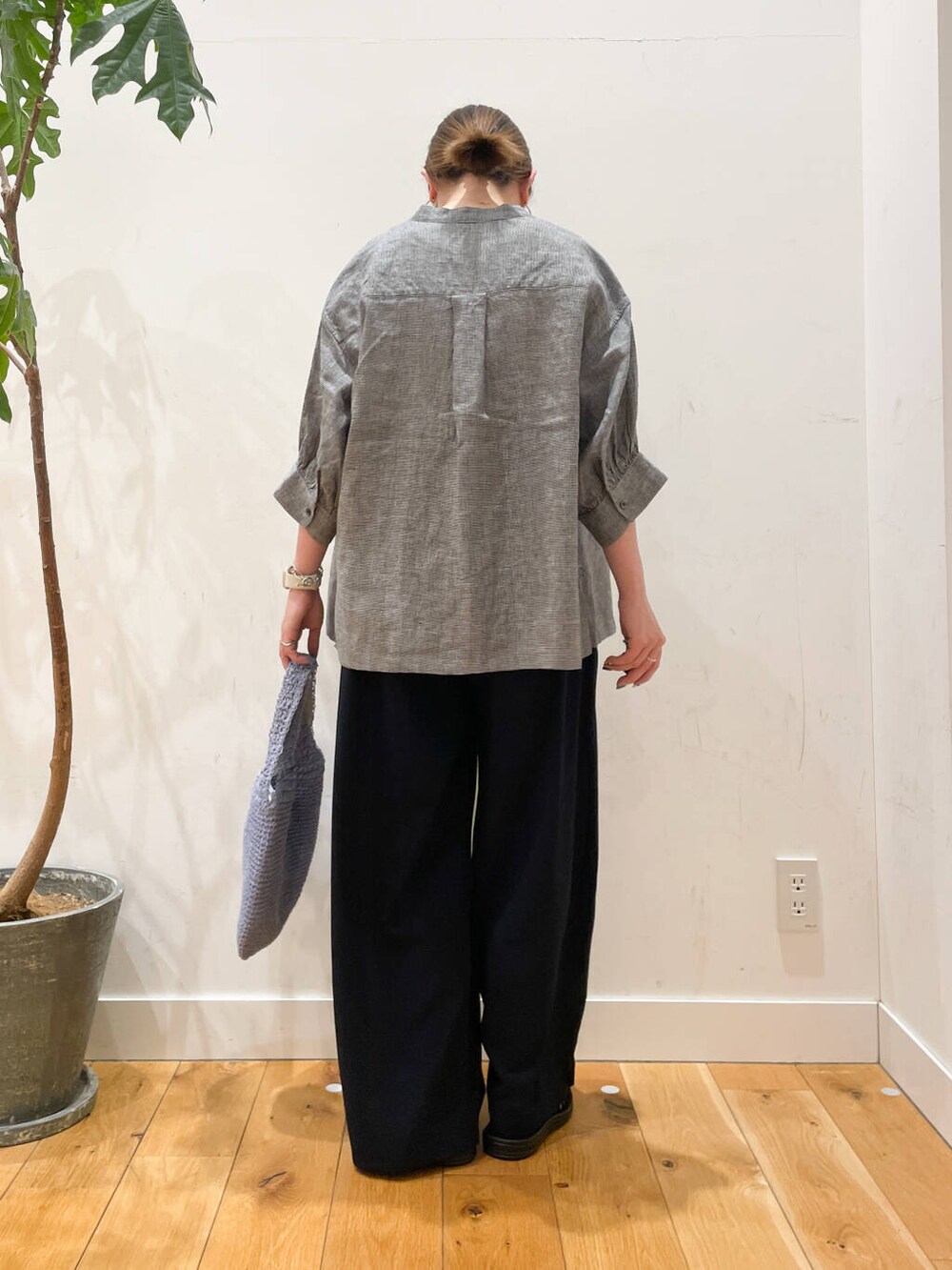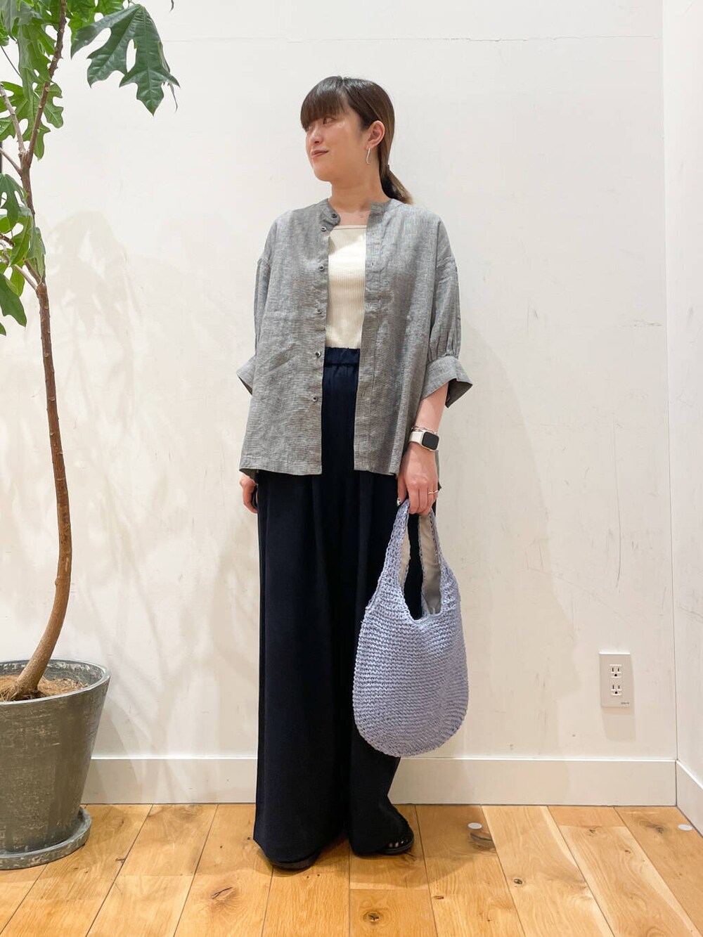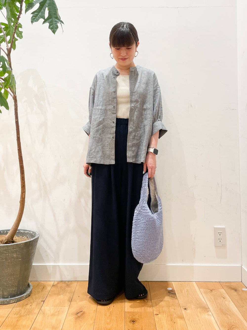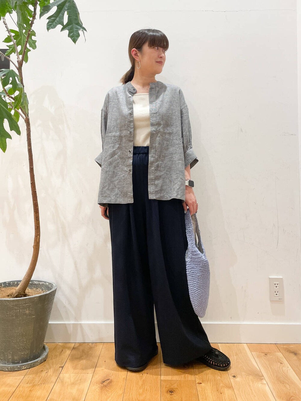 今回はネイビーとコットンリネンギャザースリーブシャツを合わせて大人カジュアルなスタイリングに◎