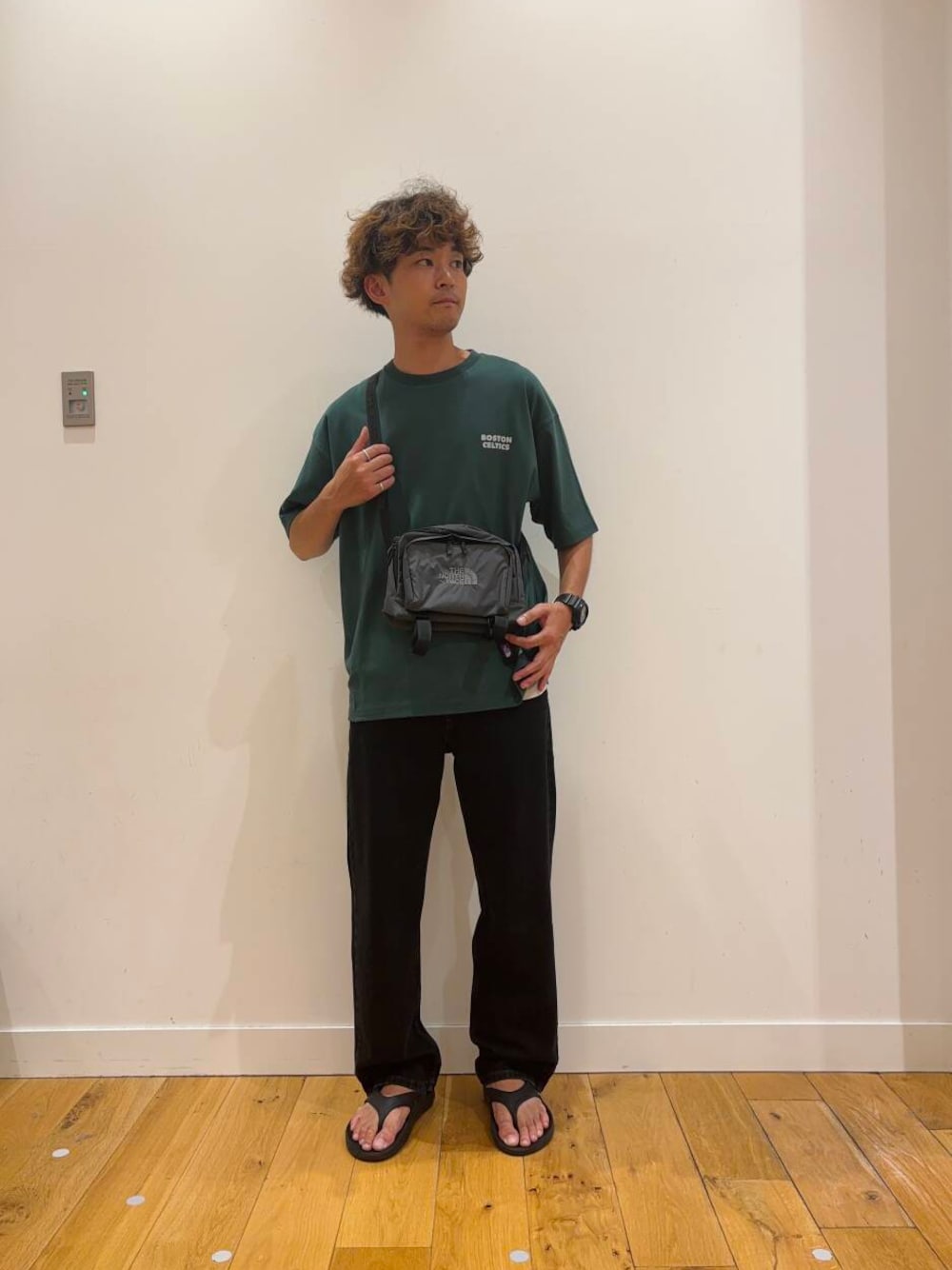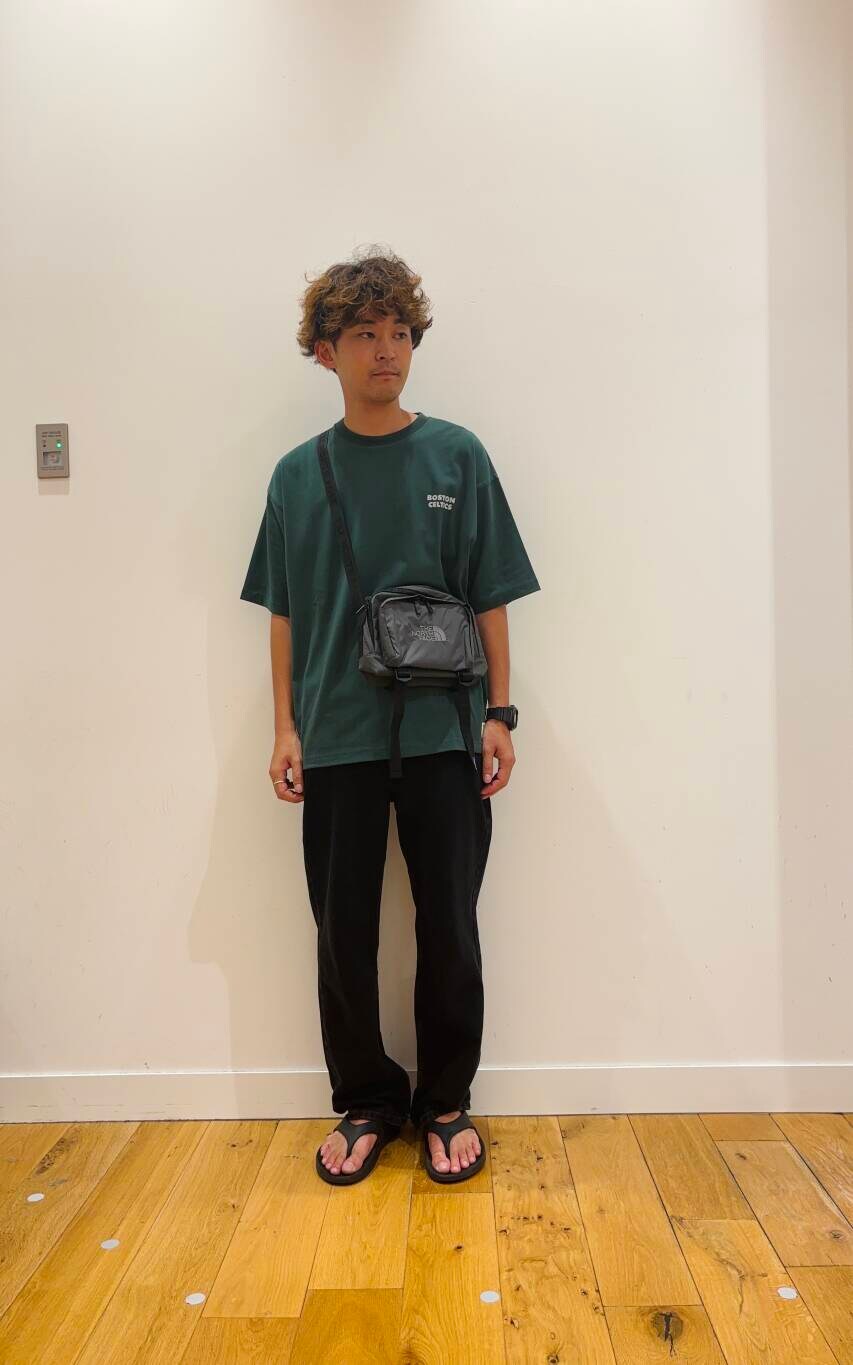 今の時期はまだ暑いのでサンダルですがこれからはスニーカーや革靴で合わせるのがおすすめ。