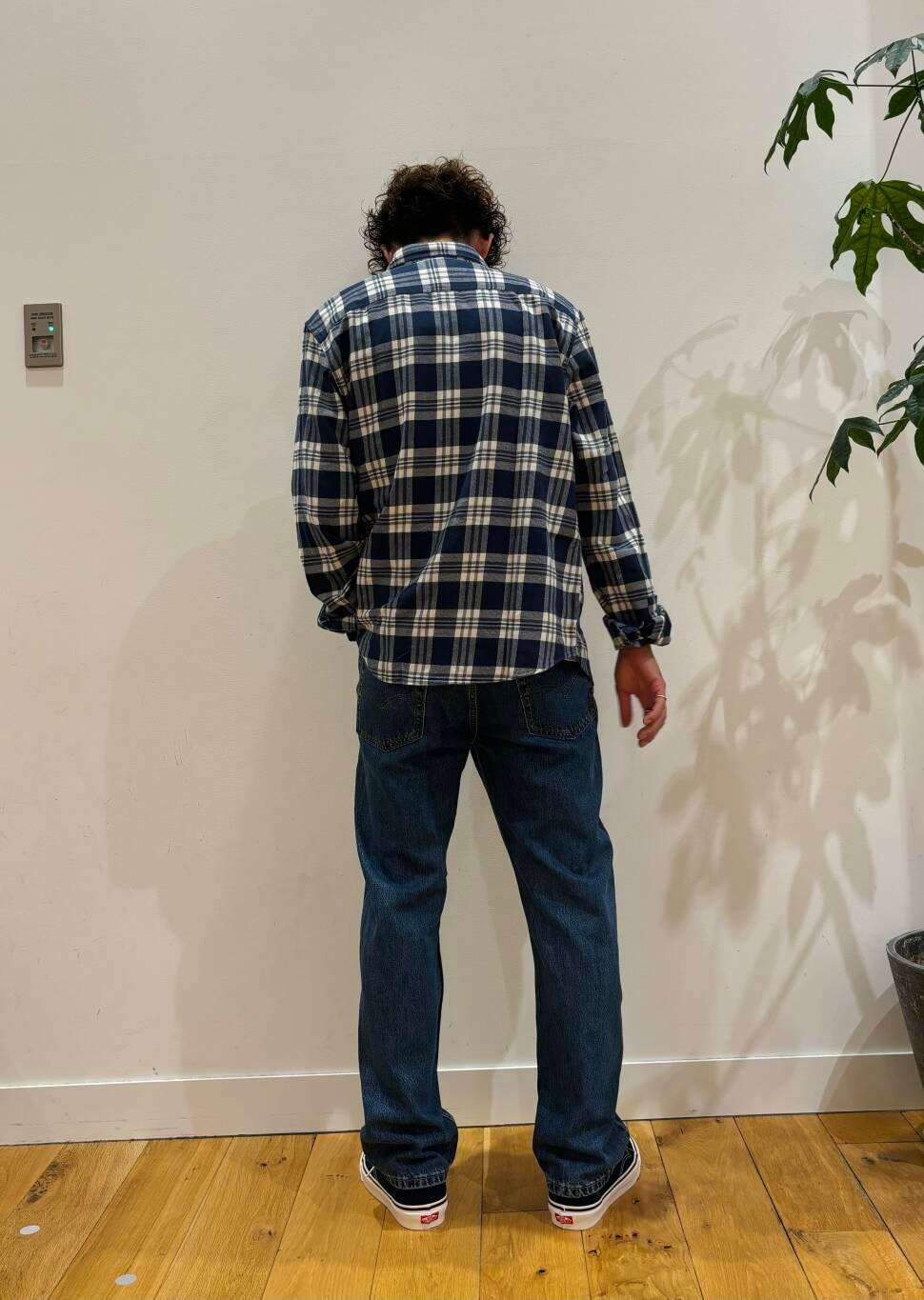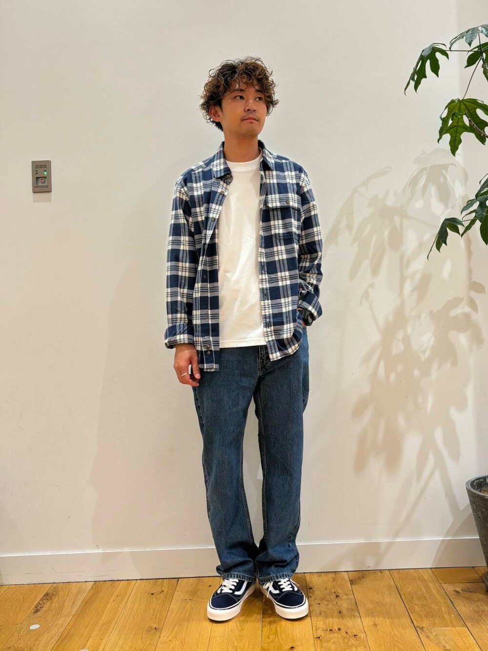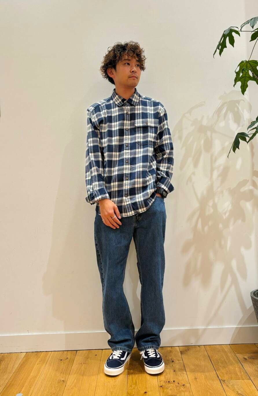 チェックシャツをメインに見えるように色合いは同じカラーや暗めのトーンは使用しないで合わせています。