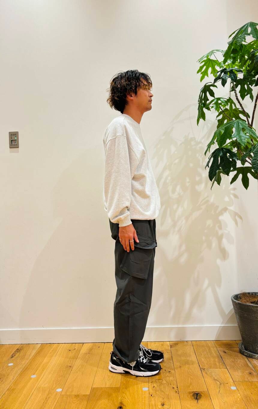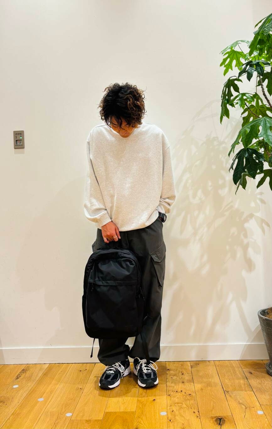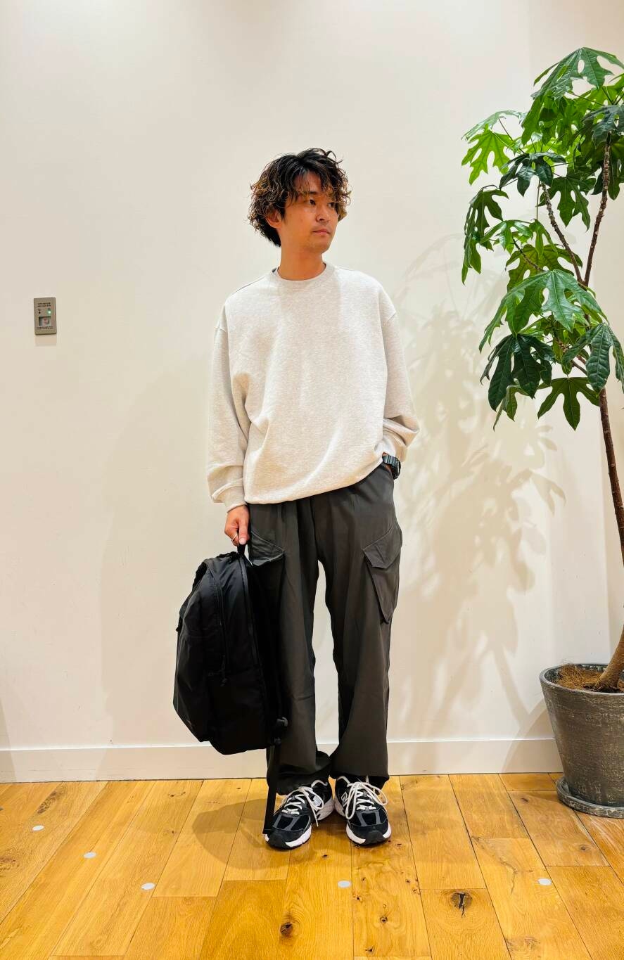 全体的にオーバーサイズで合わせており動きやすいアイテムでラフを意識して組んでいます。